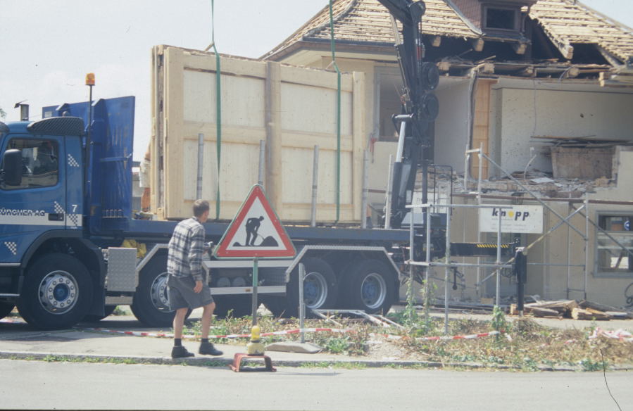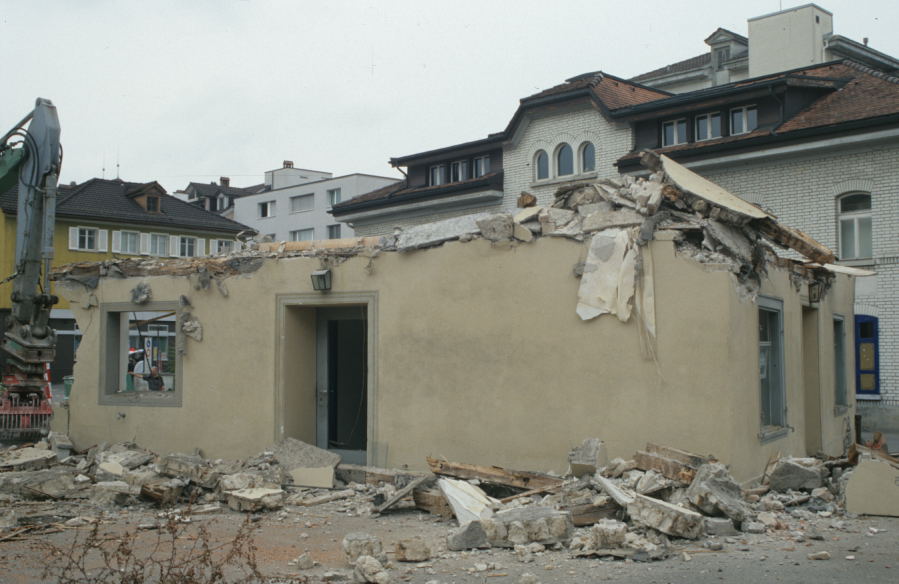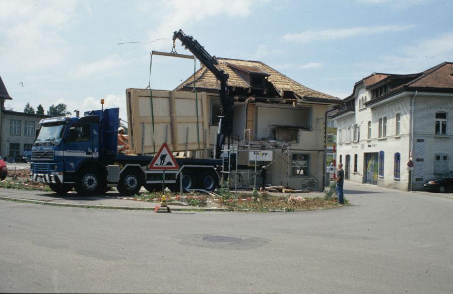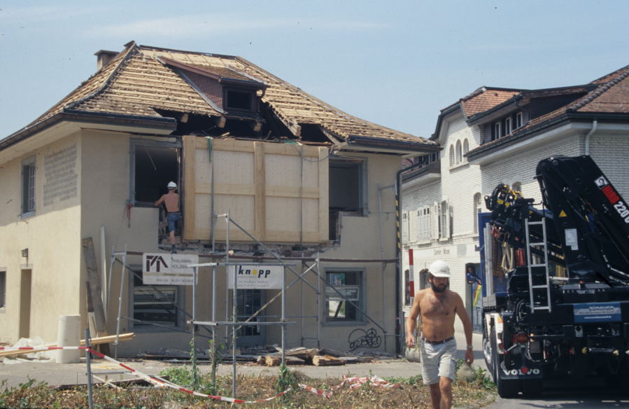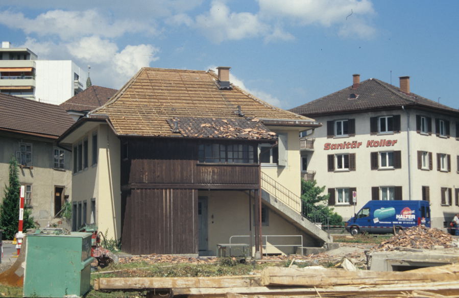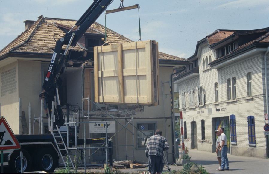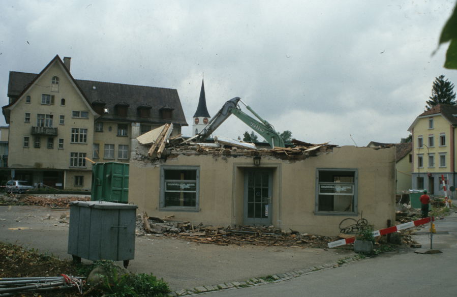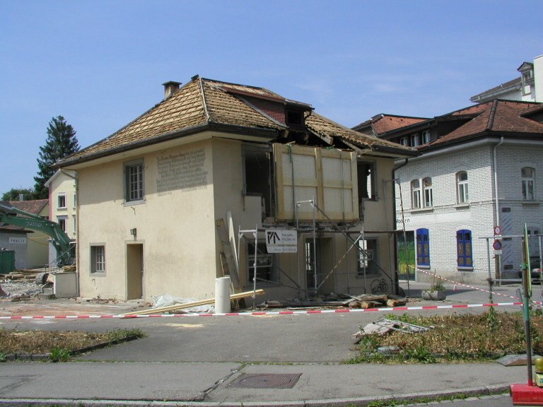 (Quelle: Unterlagen und Recherchen von Willi Olbrich, Wil, in verdankenswerter Weise zur Verfügung gestellt) Am 12. bis 15. Juli 2002 wurde das Haus abgebrochen, das Wandbild ist in einem Schaufenster Richtung Eingang Coop zu sehen.