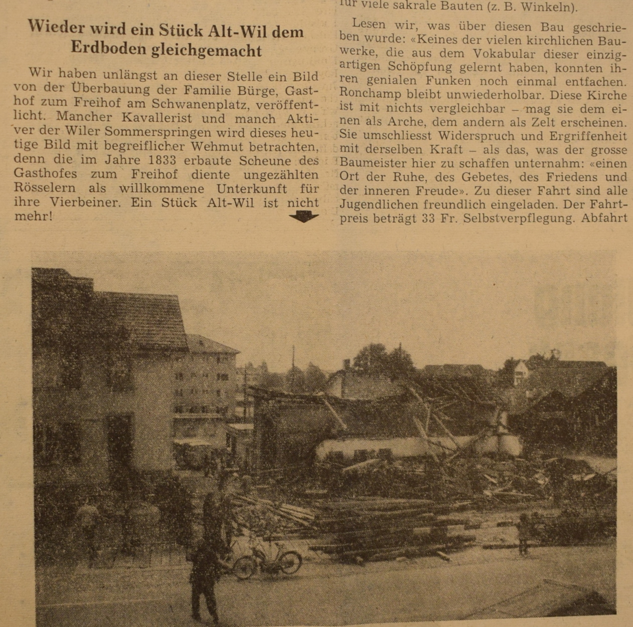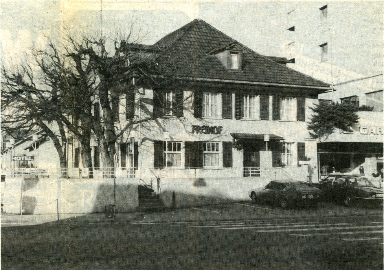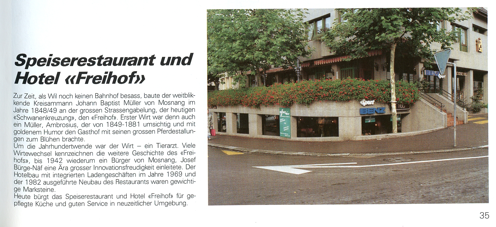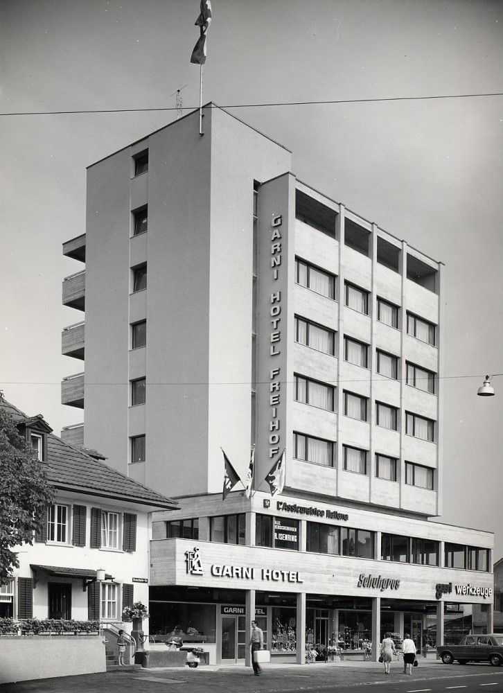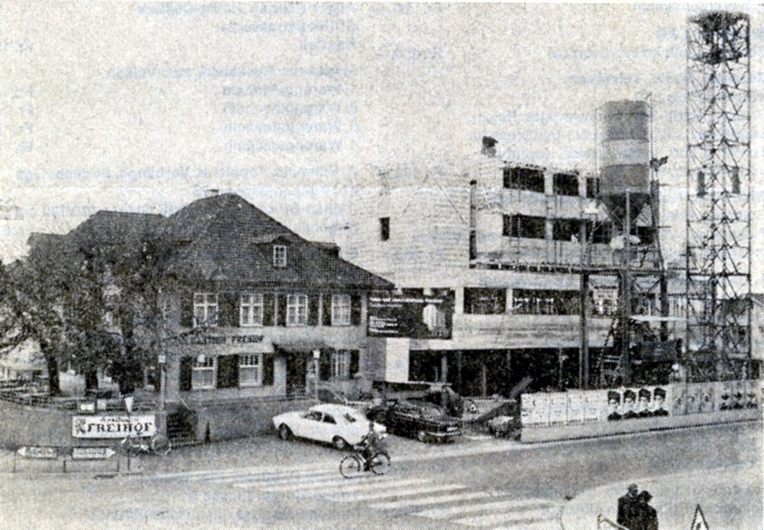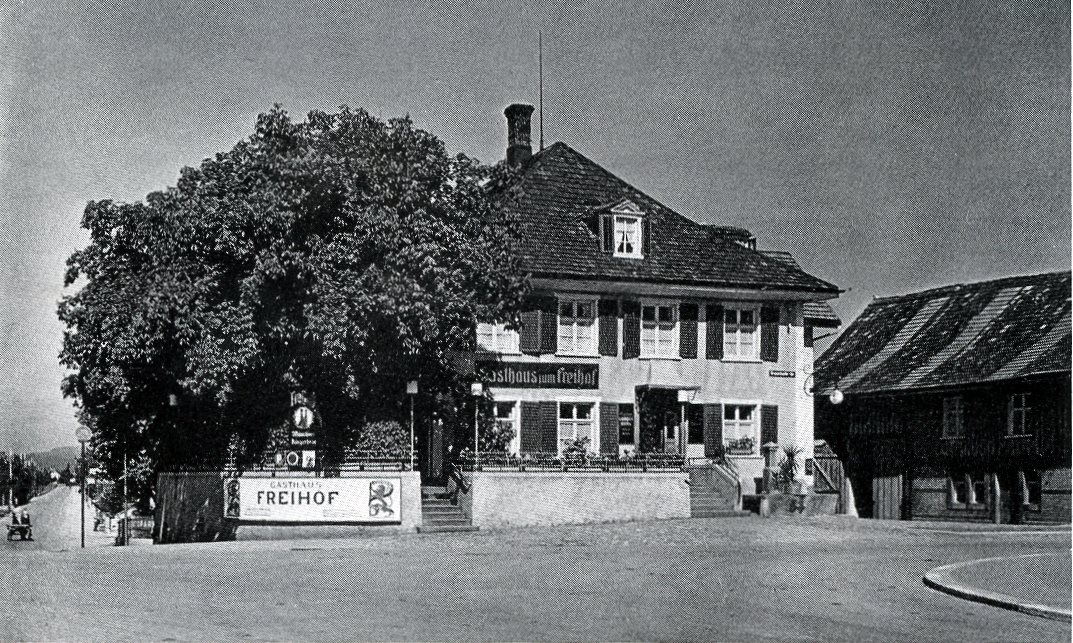 Aber auch ein Zahnarzt kam periodisch aus Winterthur zu unentgeltlichen Konsultationen in den "Freihof", und um die Jahrhundertwende war selbst der Wirt ein Tierarzt. Viele Wirtewechsel kenn-zeichnen die Geschichte des "Freihofs" bis 1942. Dann übernahm mit Josef Bürge-Näf wieder ein Mosnanger das Zepter, eine Phase grosser Innovationsfreudigkeit begann. Am Samstag und Sonntag, 17. und 18. Oktober 1942, war "Antrinkete". Im Jahre 1954 erfolgte ein erster grosser Umbau, dem 1969 der Hotelneubau mit integrierten Geschäften folgte. Im Zuge dieser Erweiterung wurde schon Rücksicht genommen auf einen eventuellen Restaurationsneubau, der dann mit dem Abbruch und Neubau des altehrwürdigen Hauses im September 1981 auch realisiert wurde. Die Eröffnung des jetzigen Hotels "Freihof" erfolgte Mitte Juni 1982.