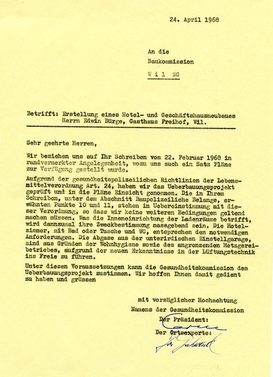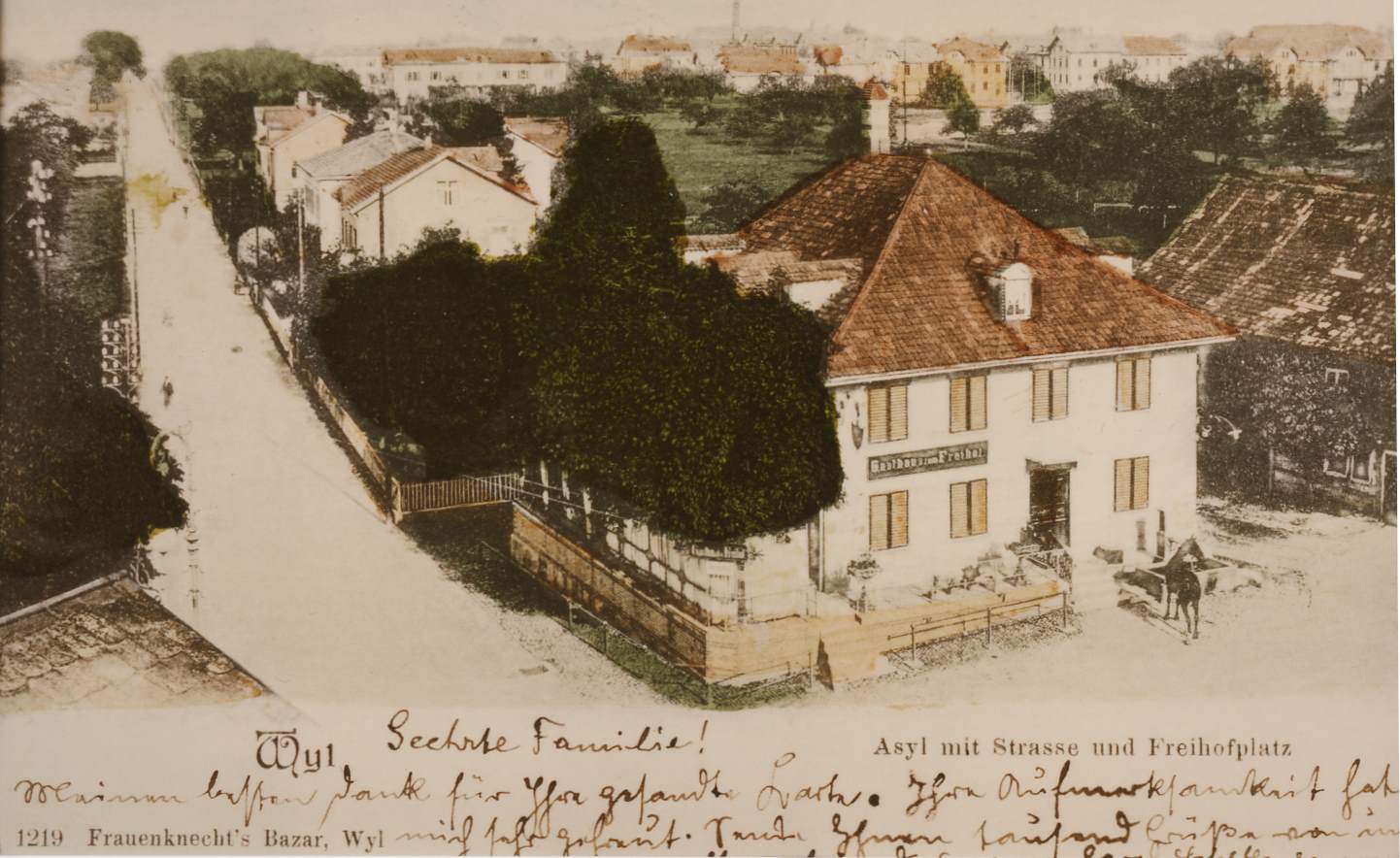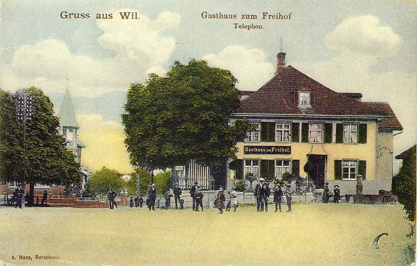 Als Wil noch keinen Bahnhof besass, baute bereits der weitblickende Kreisammann Johann Baptist Müller aus Mosnang im Jahre 1848/49 an der heutigen Schwanenkreuzung ein Hotel, den "Freihof". Erster Wirt war denn auch ein Müller, Joseph Ambros, der von 1849 bis 1881 umsichtig und mit goldenem Humor den Gasthof mit seinen grossen Pferdestallungen zum Blühen brachte. An den grossen Zufahrtsstrassen nach Winterthur und ins Thurgau gelegen, die damals noch "Gemeindestrasse" und "Landstrasse" hiessen, wurde der "Freihof" bald ein Treffpunkt für Landwirte und vor allem für Pferdehändler. Er war ein bevorzugter Ort für Pferdeversteigerungen, wie auch für die Einschatzungen der Armee-Pferde. Was lag näher, als auch eine gepflegte Küche anzubieten.