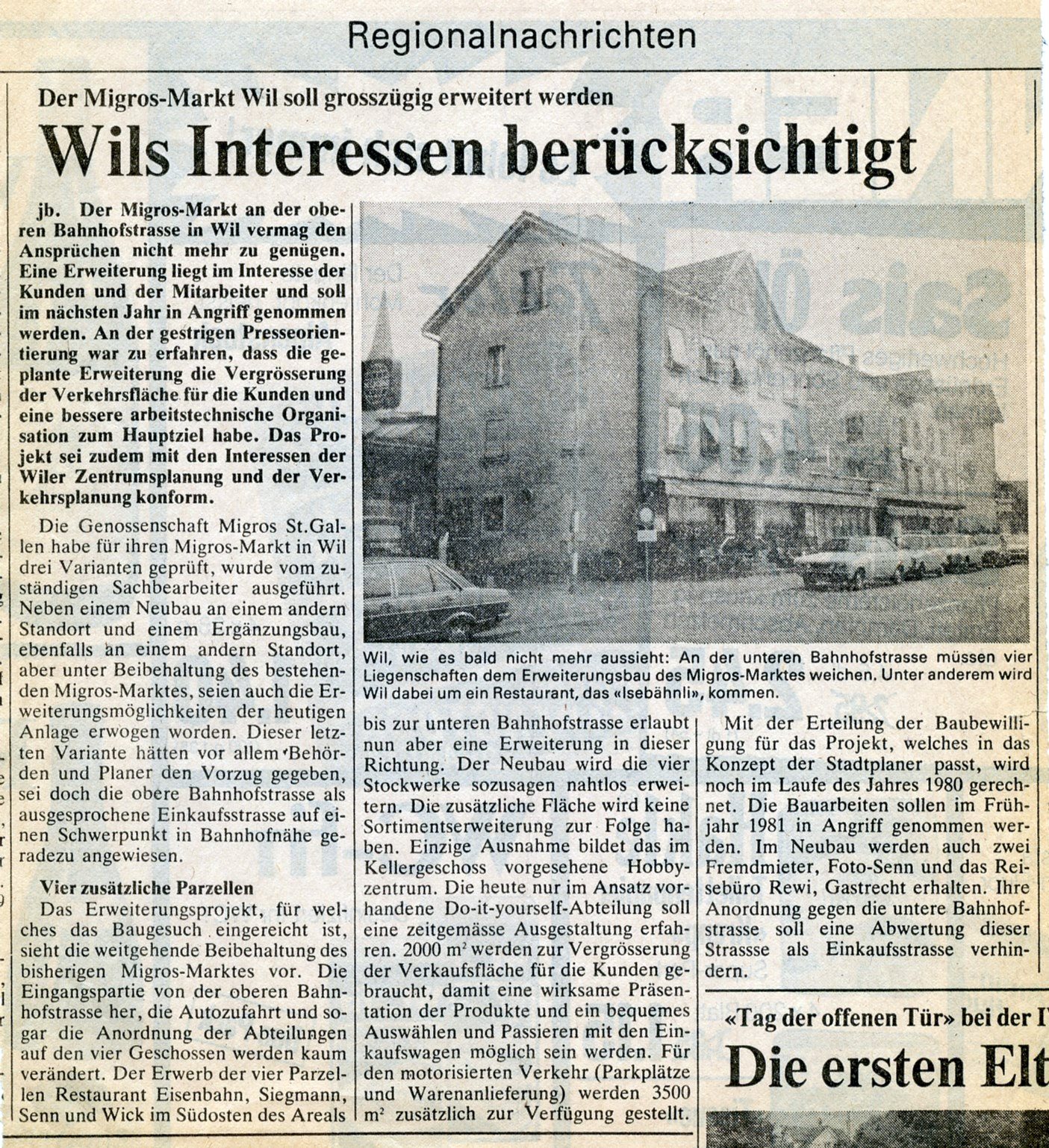 Diese Überlegung könnte der Anlass dazu gewesen sein, dass im Oktober 1878 die Witwe Kunz die Wein- und Bierwirtschaft "Zur Eisenbahn" eröffnete. Nur, bereits im nächsten Jahr erfolgte der erste Wirtewechsel zu Ferdinand Weibel, der schwungvoll im Februar mit einer Abendunterhaltung bei "Schweinsrippli, Schnörrli, Ohrle und Sauerkraut" begann. Doch bereits im April wechselte der Wirt erneut. Johann Pankraz Egli erwarb die "Eisenbahn", verkaufte sie jedoch schon 1894 an die Aktienbrauerei. Anders als zum Beispiel im "Bahnhofbuffet", blieben die Wirte selten länger als ein paar Jahre auf dem "Isebähnli". Nach über 100jährigem Bestehen stellte das einem Wintergarten ähnliche Restaurant mit Vorplatzwirtschaft 1981 den Betrieb gänzlich ein. Am 24. Juni 1982 wurde das ganze Gebäude abgebrochen, um der Erweiterung des Migros-Marktes Platz zu machen.