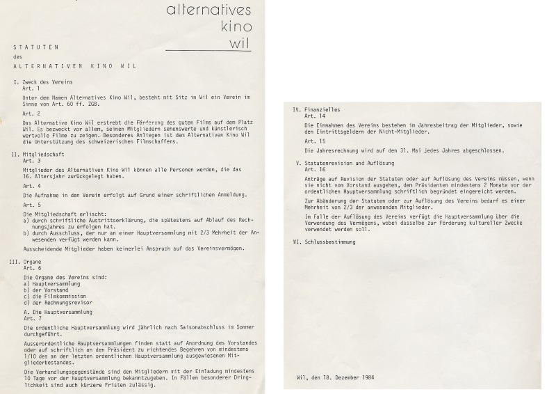 Von 1984 bis 1990 existierte der Verein "Alternatives Kino Wil". Ziel war "die Förderung des guten Films auf dem Platz Wil". Sehenswerte und künstlerisch wertvolle Filme sollten gezeigt werden. Ein besonderes Anliegen war die Unterstützung des schweizerischen Filmschaffens.