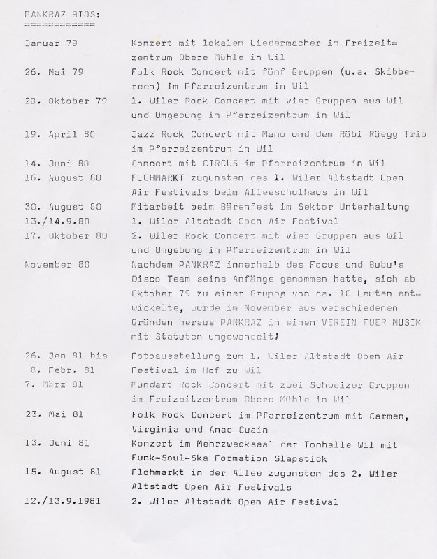 PANKRAZ war bis zum 21. November 1980 eine Gruppe Jugendlicher, die versuchten, das Kultur- und Freizeitangebot in der Region Wil mit Veranstaltungen zu erweitern. Das 1. Wiler Altstadt Open Air Festival vom 13./14. September 1980, gab dem Verein den Namen, denn der Brunnen auf dem Goldenen Boden ist ja der Pankratiusbrunnen. Da dieser Brunnen während den Vorbereitungsarbeiten gewisse Probleme bereitete, wurde das OK nach ihm benannt, eben PANKRAZ.
