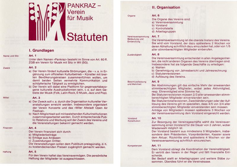 Am 21. November 1980 wurde dann aus PANKRAZ ein Verein für Musik. Mit der Vereinsgründung wollten die Mitglieder keine Vereinsmeierei fördern, sondern eine Einrichtung schaffen, die gegenwartsbezogene kulturelle Ausdrucksformen, vor allem im Bereich der Musik, zum Zug kommen lässt. Zudem haftet in einem Verein (nur) das Vereinsvermögen, was einer Herabsetzung des persönlichen Risikos der aktiven Organisatoren gleichkommt. Auch erleichtert die juristische Person vielerorts die Arbeit. Gründungs- und OK-Mitglieder waren Urs Karrer, Urs Paul Holenstein, Ruedi Brägger, Stefan Alfanz, Susanne Knöpfel, Stefan Leutenegger, Erich Rutz, Barabara Stieger, später kamen noch Werner Warth, Christoph Schär und Guido Wiesli dazu.
