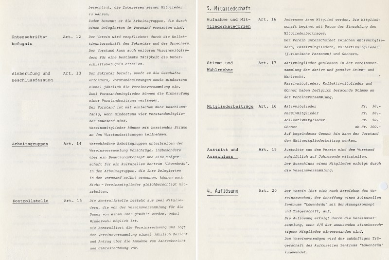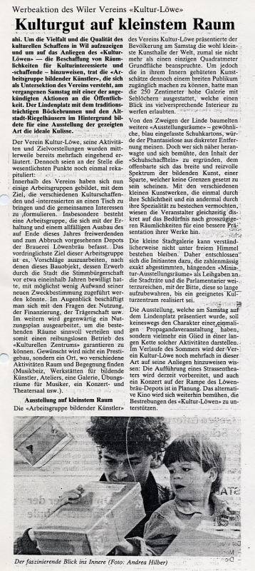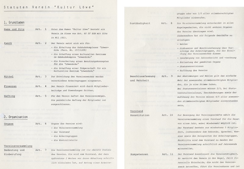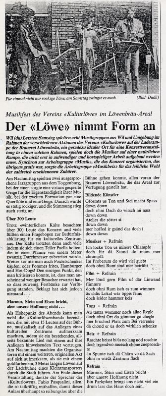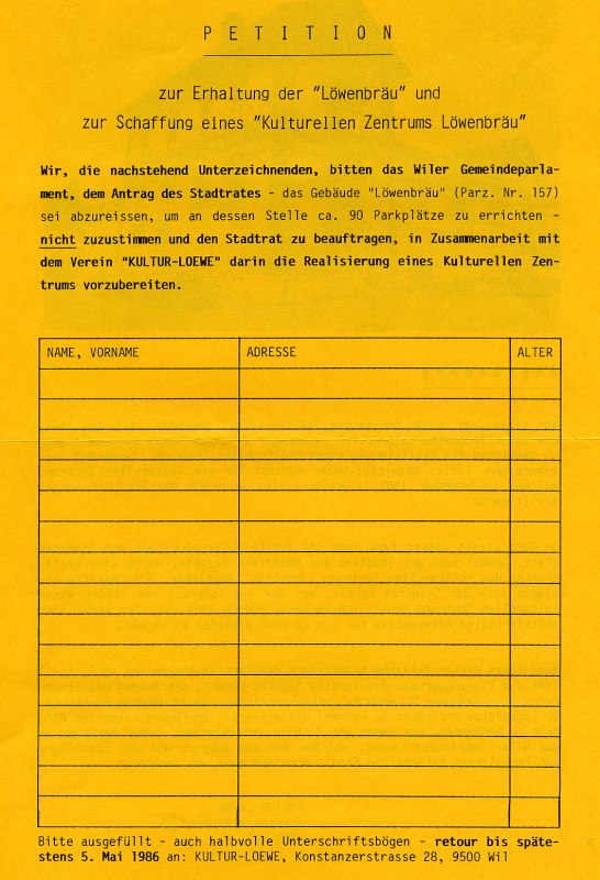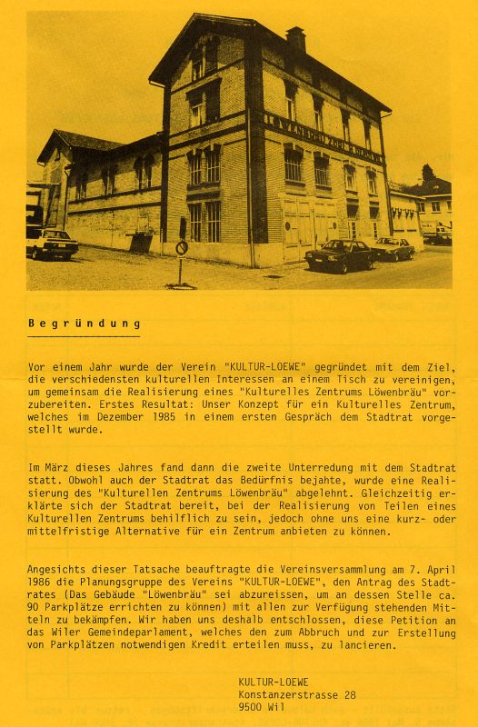 Die Schaffung eines kulturellen Zentrums in Wil mit Auftritt-, Ausstellungs- und Produktionsmöglichkeiten. Zuerst in der alten Löwenbräu am Bleicheplatz, dann in den angrenzenden Stallungen sollte dieses verwirklicht werden. Mit vielen Aktivitäten wurde in den nächsten Jahren auf dieses Anliegen aufmerksam gemacht.