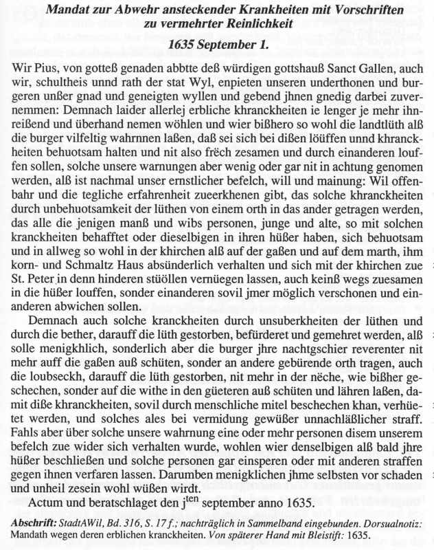 Die Ausstellung im Stadtmuseum Wil im Hof vom Februar bis Juli 2007 zeigt veschiedene Aspekte des Lebens in jener Zeit, die nicht nur "barock" war, sondern vor allem vom 30-jährigen Krieg und der Pest geprägt wurde. Der "Schwarze Tod" hatte 1635 auch in Wil sehr viele Todesopfer gefordert . 1633 wurde Kilian Kesselring, der "Obrist-Wachtmeister" im Thurgau, im Hof zu Wil und später in der Sammnung, dem heutigen Kirchplatzschulhaus, gefoltert, weil er angeblich den Thurgau an die Schweden verraten habe. In dieser Zeit war die Obrigkeit gefordert, darum kam dem Grossen Religions- und Sittenmandat von 1635 besondere Bedeutung zu.