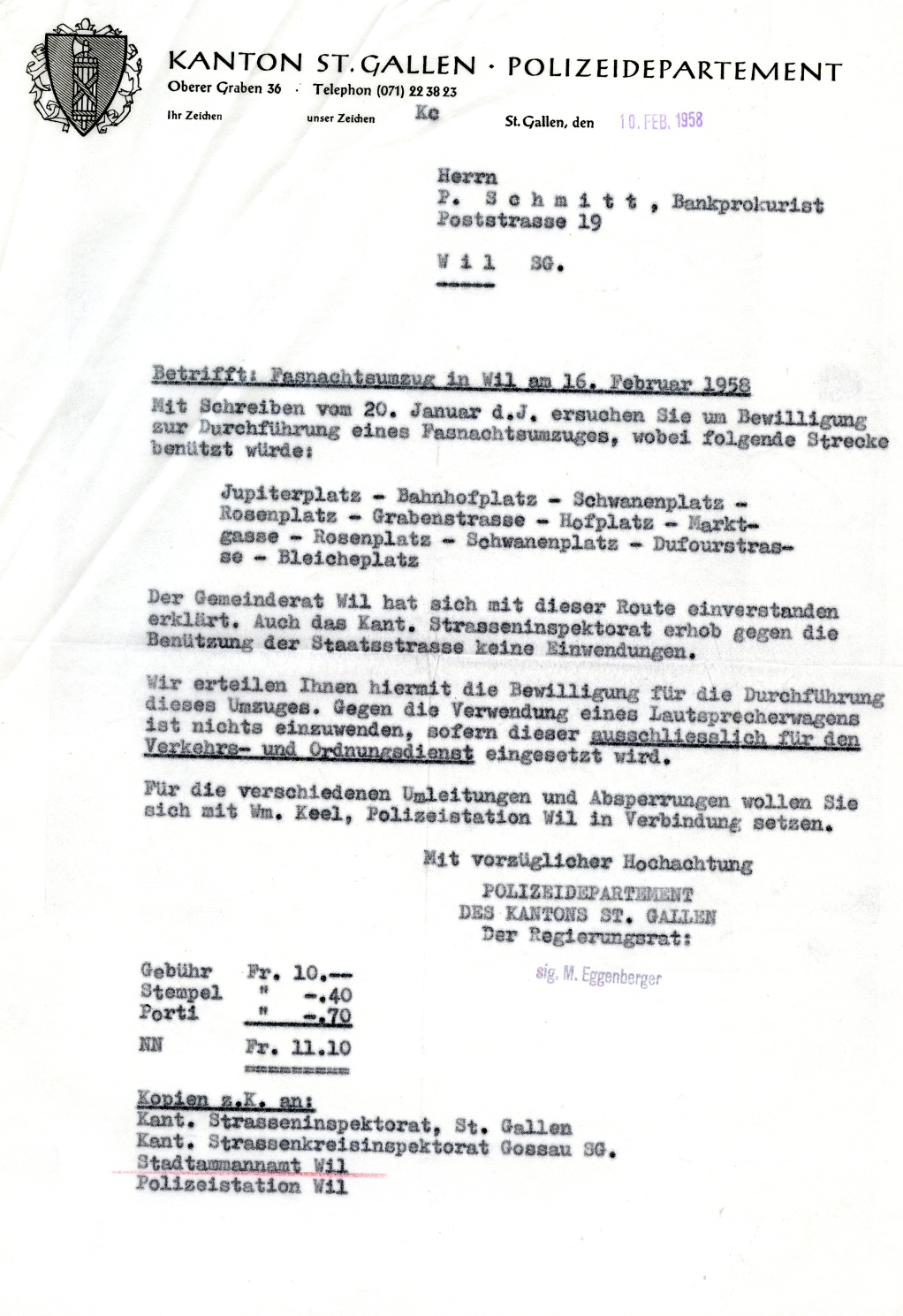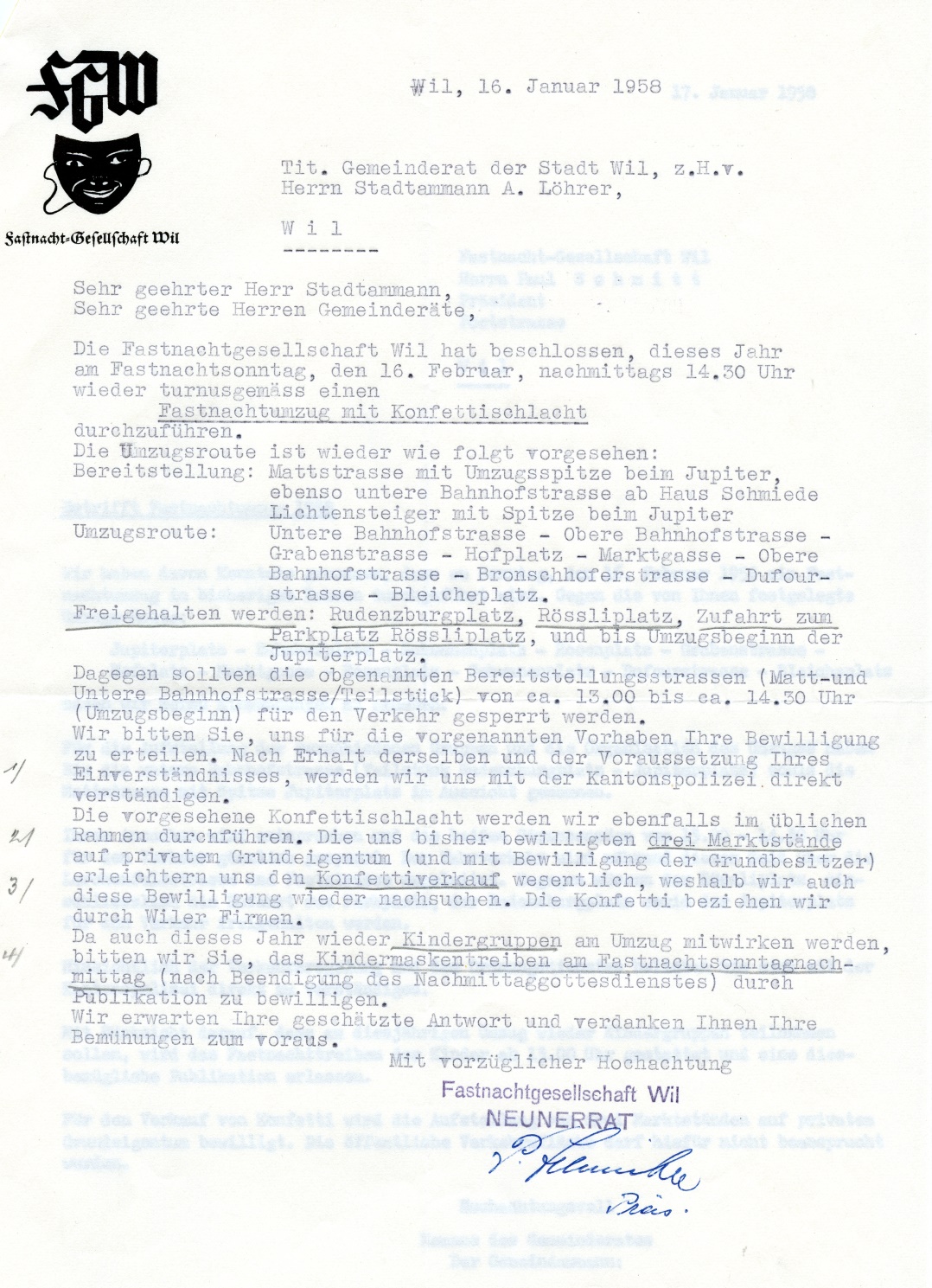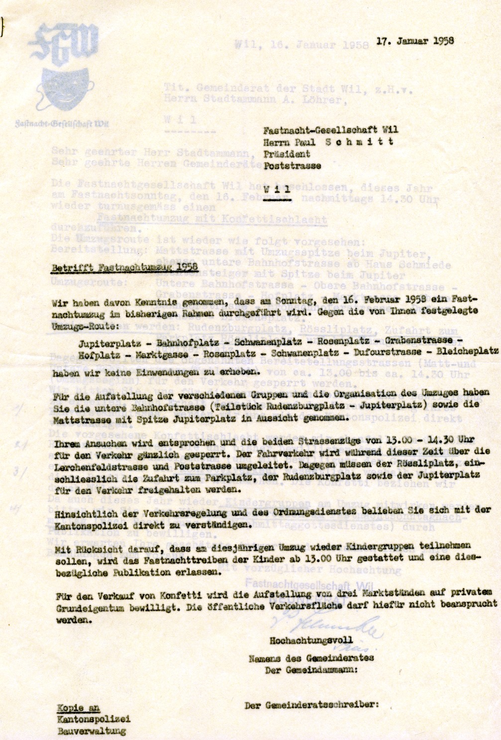 Ein Umzug im Jahr 1905 unter dem Motto "Die sieben Wochentage" ist fotografisch und mit dem Umzugsprogramm dokumentiert. Nach heutigem Verständnis war es aber mehr eine Art historischer Umzug mit allegorischen Szenen, denn ein eigentlicher Fastnachtsumzug. Kleinere Umzüge fanden danach immer wieder statt, doch erst 1949 wurde wieder eine grössere Veranstaltung organisiert. Dazu die Vorankündigung: "Nach jahrelangem und kriegsbedingtem Unterbruch hat sich der Stadttambourenverein Wil entschlossen, dieses Jahr die Tradition eines grösseren Fasnachtszumzuges wieder aufzunehmen. Bereits seit vielen Wochen basteln die wackeren Tambouren unter künstlerischer Anleitung an ihren originellen Masken und haben deren einige Dutzend fertiggestellt. " Unter dem Motto "Fleischrationierung, Fleischpreisaufschlag, Konsumentenstreik" zog sich am Fastnachtssonntag ein beachtlicher Festzug durch die Stadt. Prinz Karneval aus Mostindien wurde um 14.20 Uhr am Bahnhof feierlich abgeholt und, in einer Ehrenkutsche unter Begleitung des Stadtammanns, zum "Goldenen Boden" geleitet. Dort fand die Uebergabe der Stadt durch die Behörden an den fastnächtlichen Herrscher statt. 1950 und besonders 1951 fanden die nächsten grossen Umzüge statt. Eine bereits 1950 ins Leben gerufene Kommission, bestehend aus den Wilern Paul Schmitt, Oskar Rey, Thomas Stillhart, Alex Bannwart, Albert Wyss, Karl Peterli und Gust Weber, verstand sich bald einmal als Trägerschaft fastnächlichen Lebens in Wil. Was lag näher, als einen Verein, die dieses Jahr ihr 50-Jahre-Jubiläum feiernde Fastnachtsgesellschaft Wil zu gründen ?