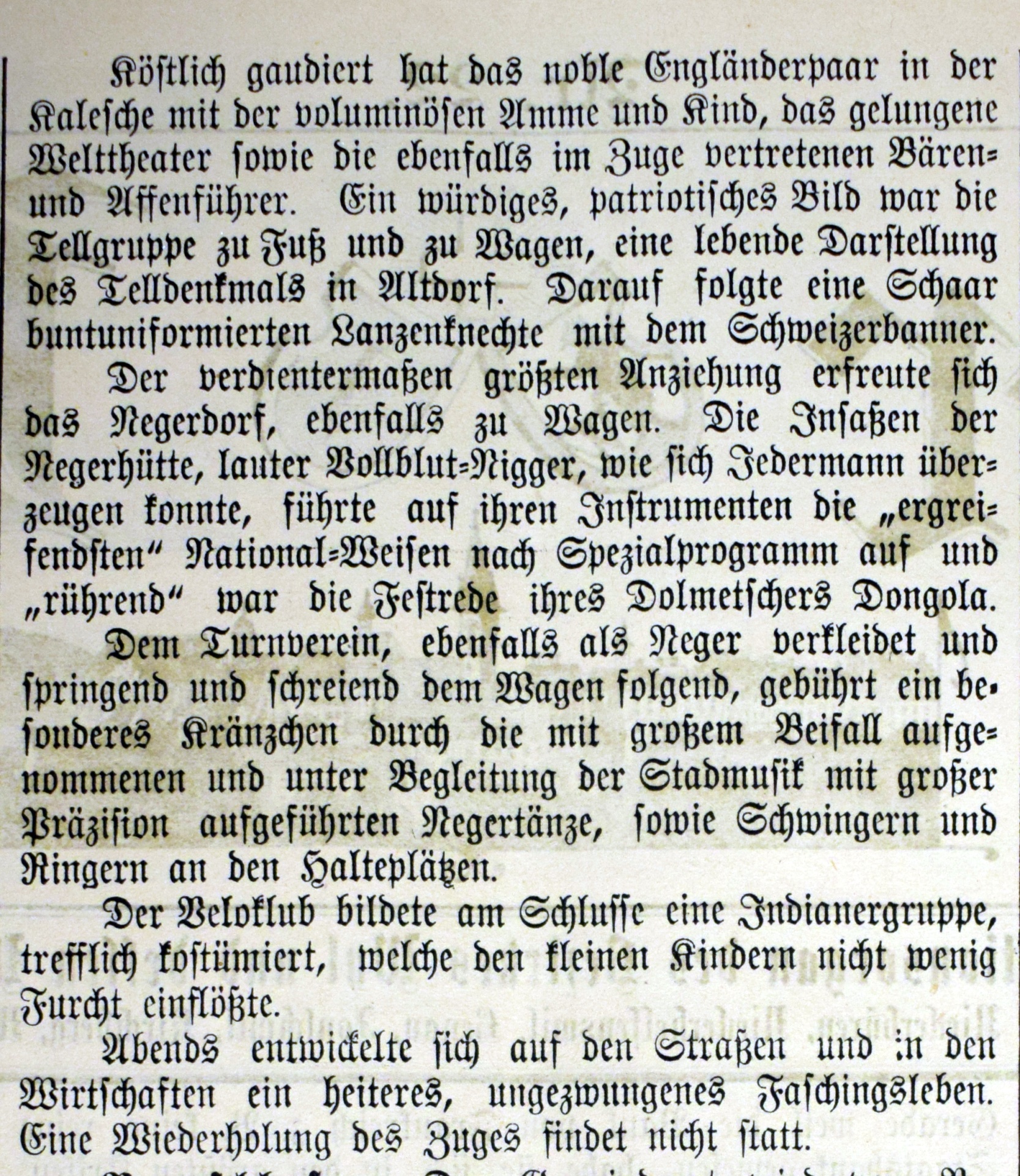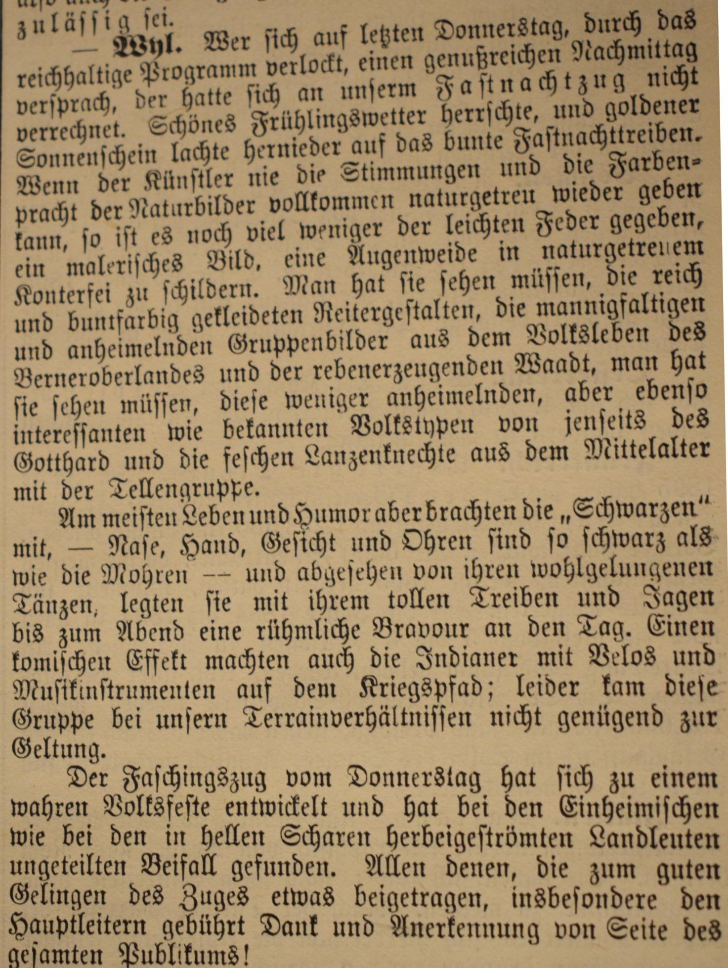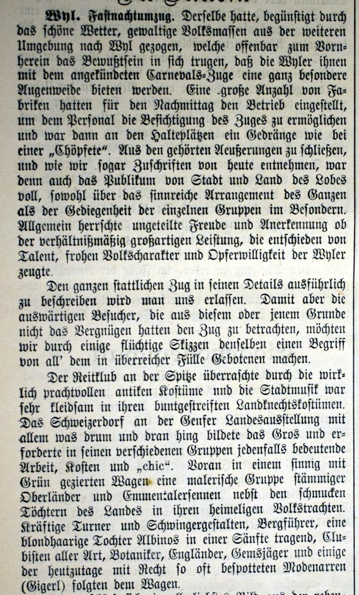 Schon 1594, als in den Wiler Ratsprotokollen erstmals die Rede von Leuten war, die zur Fastnachtszeit "... ungewonnliche Teüffels Kleyder annziechen, sinngen, sprinngen, dobennt, wüeten, dannzen und derglychen unflätig Sachen anfachen ...", scheinen bereits eigentliche Fastnachtsumzüge abgehalten worden sein. Erst im 19. Jahrhundert aber aber lassen sich weitere belegen.