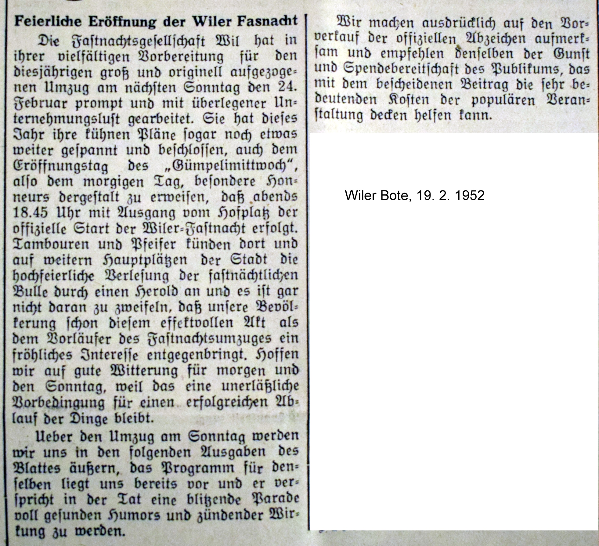 Die 1950 gegründete Fastnachtsgesellschaft führte an der Fastnacht 1951 den bis heute so praktizierten Ablauf der Fastnacht ein. Sie wurde also am Gümpeli-Mittwoch mit dem sogenannten „FGW-Treffen“ auf dem Hofplatz feierlich eröffnet; dies unter dem Beisein der Stadtmusik, der Tüüfel und erstmals mit kostümiertem Prinz. Erstmals wurde auch am Fastnachtssonntag ein grosser, einheitlicher Umzug abgehalten, bei dem auch der Prinz und eine Nörgeli-Gruppe mitmarschierten. Mit dem Nörgeli, einer typischen Wiler Bezeichnung, wurde bereits 1951 eine bekannte Wiler Persönlichkeit karikiert und verbrannt.