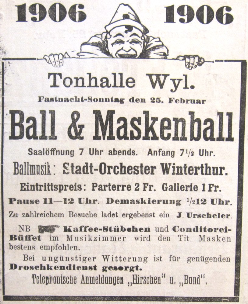 Die Maskenbälle im „Hof“, des KGV (Katholischen Gesellenvereins) am Gümpelimittwoch, des Hof-Balls am Fastnachtsonntag, des KTV (Katholischen Turnvereins) am Fastnachtsmontag und der Stadtmusik am Fastnachtsdienstag; die Maskenbälle im Hotel Schöntal, im Hotel Landhaus, im Hotel Derby, in der Tonhalle der Stadtturner Maskenball am Fastnachtssamstag und der „Schwanen“-Maskenball am Fastnachtsmontag.