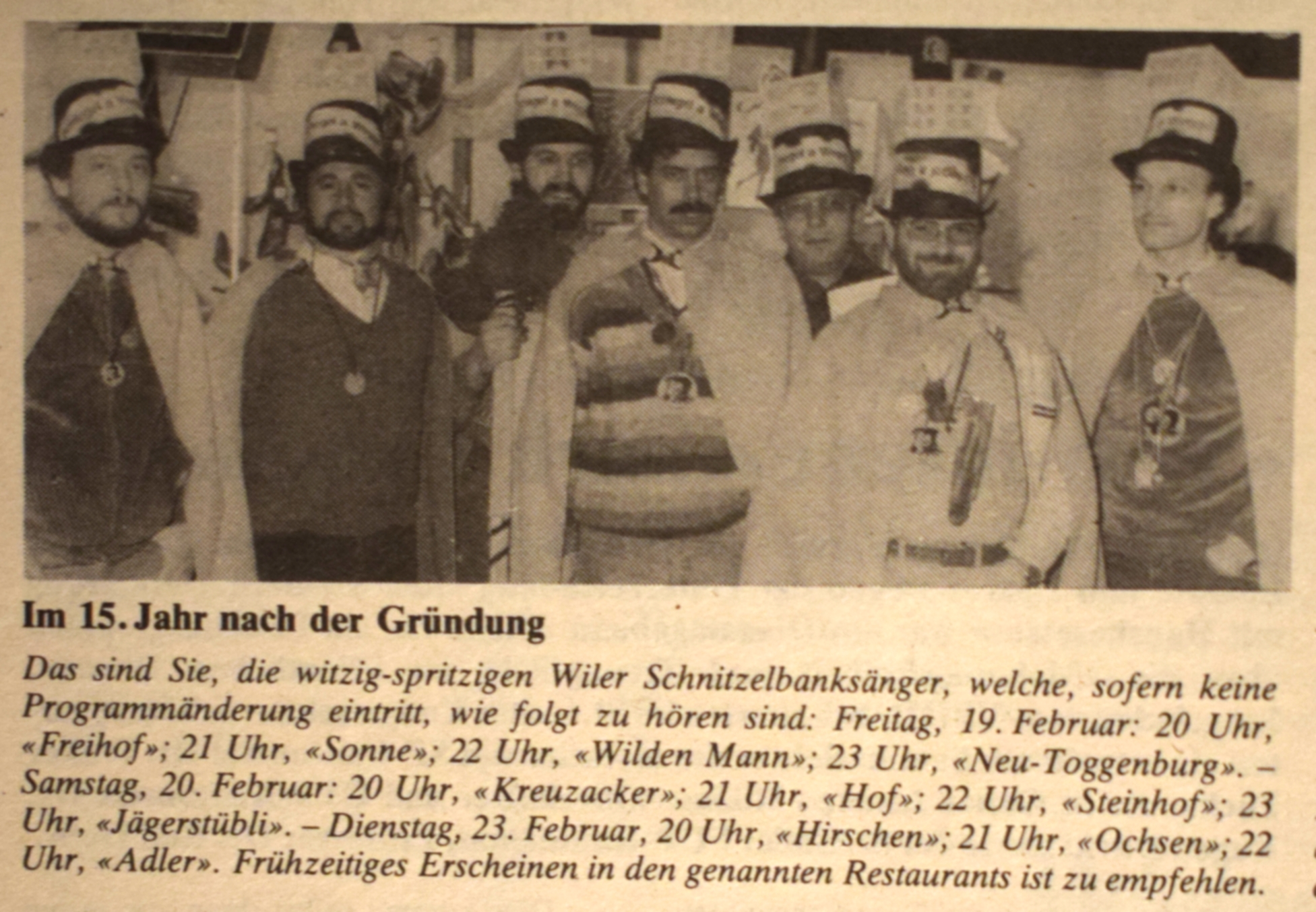 Wil ist alles andere als eine Hochburg für Schnitzelbänke, die zur Fastnachtszeit öffentlich vorgetragen werden. Die früheste Kunde einer Schnitzelbank überliefert ein Flugblatt von 1906 (Bild …). In unserer Zeit wissen wir von gelegentlichen Auftritten der Gruppe „Chratzbörschte“ unter der Leitung von Christoph Sutter, einem begabten, phantasiereichen Verseschmied. Dann sind es vor allem zwei Gruppen, die über längere Zeit ihre Bänke zum besten gaben und geben: