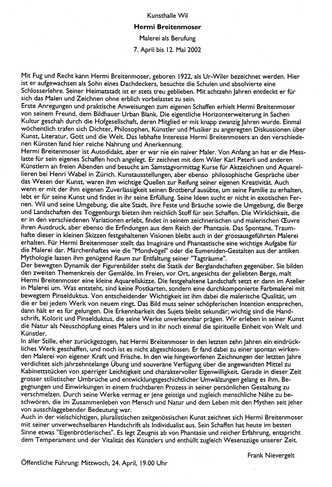 Sie wurde ihm nicht in die Wiege gelegt, die Beschäftigung mit der Kunst, als "Hermi" Breitenmoser 1922 in Wil geboren wurde. Eine Schlosserlehre beendete er mit Erfolg. Zugleich begann er sich als knapp Zwanzigjähriger für die verschiedenen Kunstrichtungen, seien es Musik und Literatur oder die bildenden Künste, stark zu interessieren. Sein damaliger Eintritt in die Wiler Hofgesellschaft förderte dieses Interesse weiter. Obwohl Malen und Zeichnen in der Freizeit betrieben werden muss, ist das Wort "Hobby" bei der künstlerischen Arbeit Hermann Breitenmosers fehl am Platz. Als innerer Zwang, als Reifen und Gären bis zur Explosion kann die Entstehung eines seiner Bilder bezeichnet werden. Dabei ist das Werk schon im Kopf entstanden, "innerlich" gezeichnet, wie er es nennt. Gerade weil er die Publizität nicht sucht, kann er auch genau beobachten, mit "wachem Grind" herumlaufen, und sich seine eigenständige Meinung bilden.