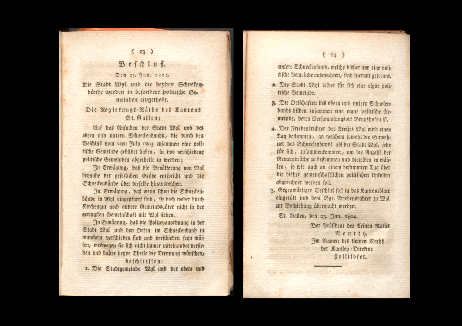 Die Tatsache, dass Bronschhofen eine eigene politische Gemeinde bildete, hängt zweifelsohne stark mit Geschichte des Schneckenbundes zusammen. Trotz der bewussten Unterscheidung zwischen dem oberen (Ortskreis Rossrüti) und unteren (Ortskreis Bronschhofen) Schneckenbund verstand man sich als zusammengehörig, als eine Gemeinde. Nur vor diesem Hintergrund ist es zu verstehen, dass die Bewohner des Schneckenbundes sich entschieden wehrten, als sie 1803 der Gemeinde Wil zugeschlagen wurden. Bereits am 26. Oktober 1803 hatten sich die Bronschhofer soweit gefasst, dass sie an den Regierungsrat ein Bittgesuch um «Absönderung» von der Stadt Wil stellten und um Einteilung in eine eigene Gemeinde baten.weil der Widerwillen gegen die Vereinigung beiderseits gross sei. Verschiedene Ausserungen von Stadtbürgern liessen darauf schliessen, dass kein gutes Einverständnis und keine Harmonie herrschen würden. Ein wichtiger Punkt sei auch die Tatsache, dass sehr viele Gemeindebürger nach Wil, vor allem an die Stadtämter, abgabepflichtig seien, was einem harmonischen Miteinander nicht förderlich sei, «mit einem Worth, die Verhältnis der Statt und Land sind nicht vereinbarlich». Nach langen Verhandlungen und vielen Bittschriften wurde der Schneckenbund im Juni 1804 zur selbständigen Gemeinde erklärt – mit Versammlungsort Bronschhofen. Am 23. Juni 1804 wurde vom Grossen Rat des Kantons St. Gallen die Trennung bestätig.