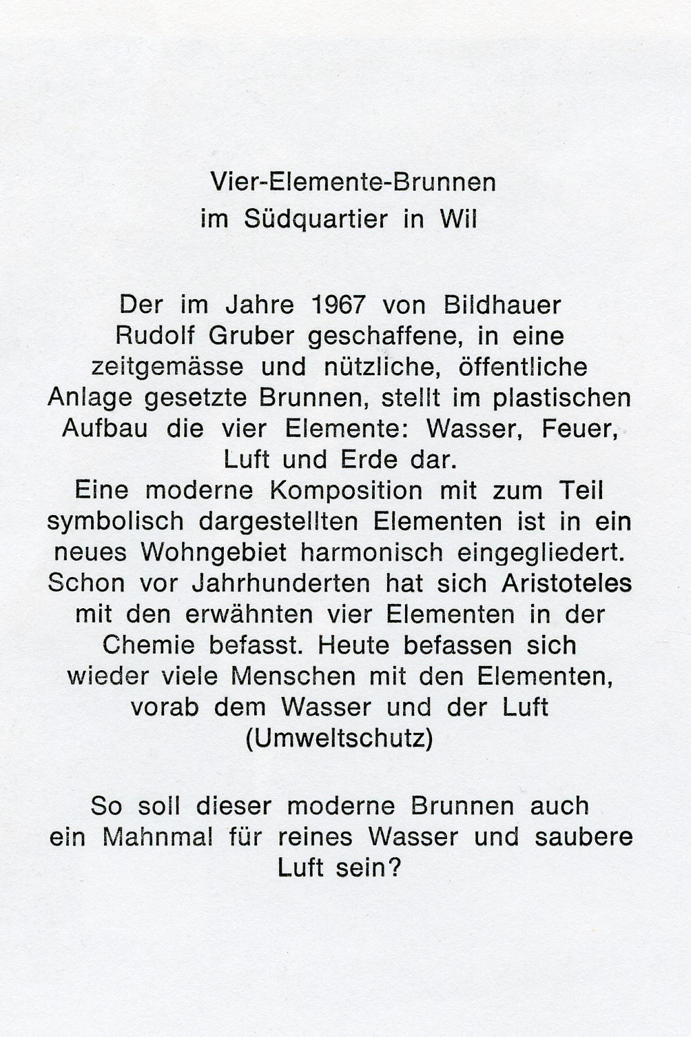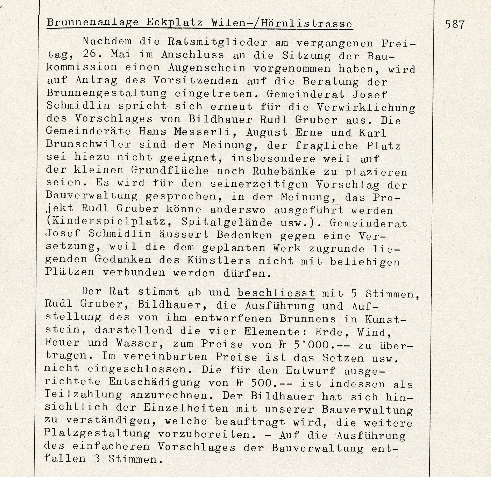 Der Brunnen an der Wilen- Hörnlistrasse Im Rahmen von Bauarbeiten an der Wilen-und Hörnlistrasse wurde im September 1965 in der Baukommission auch über die Gestaltung des Eckplatzes bei der Strassengabelung diskutiert. Es herrschte dabei vorerst die Meinung, dass ein einfacher Springbrunnen und eine einfache Umgebungsgestaltung vollauf genügten. Im Gemeinderat vertrat hingegen Stadtammann Fäh als Vorsitzender die Ansicht, dass ein künstlerisch gestalteter Brunnen wünschbar und vertretbar sei. Seiner Meinung nach sei es wichtig, dass gerade auch im Südquartier in dieser Hinsicht gleich wertvolle Sachen aufgestellt würden, wie im übrigen Gemeindegebiet. Der Rat schloss sich schliesslich seiner Argumentation an. Mitte Mai 1966 wurden die beiden Wiler Bildhauer Rudl Gruber und Eugen Krucker eingeladen, einen Entwurf für die Gestaltung eines neuen Brunnens einzureichen.
