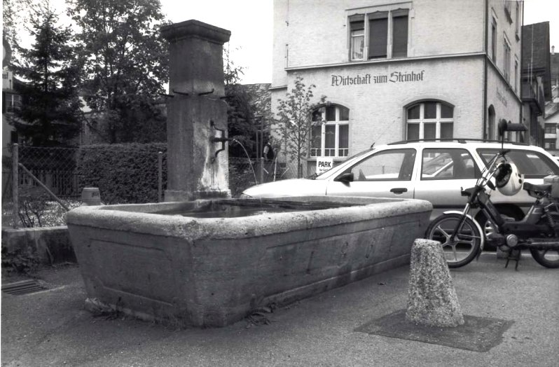 Ebenso wie der Brunnen bei Wagner Bossart (bei der Rudenzburg) war 1862 der Holzbrunnen bei Färber Jakob Valentin Schär in der Nähe des Steinhofs in bedenklich schlechtem Zustand und sollte aus Stein neu gesetzt werden. Da der Gemeinderat feststellte, dass die Kosten für die zwei neuen Brunnen wohl seine Finanzkompetenz überschreiten würde, wurde beschlossen, der nächsten Rechnungsgemeinde ein entsprechendes Gesuch zu unterbreiten. Diese stimmte diskussionslos dem Neubau in Stein zu.