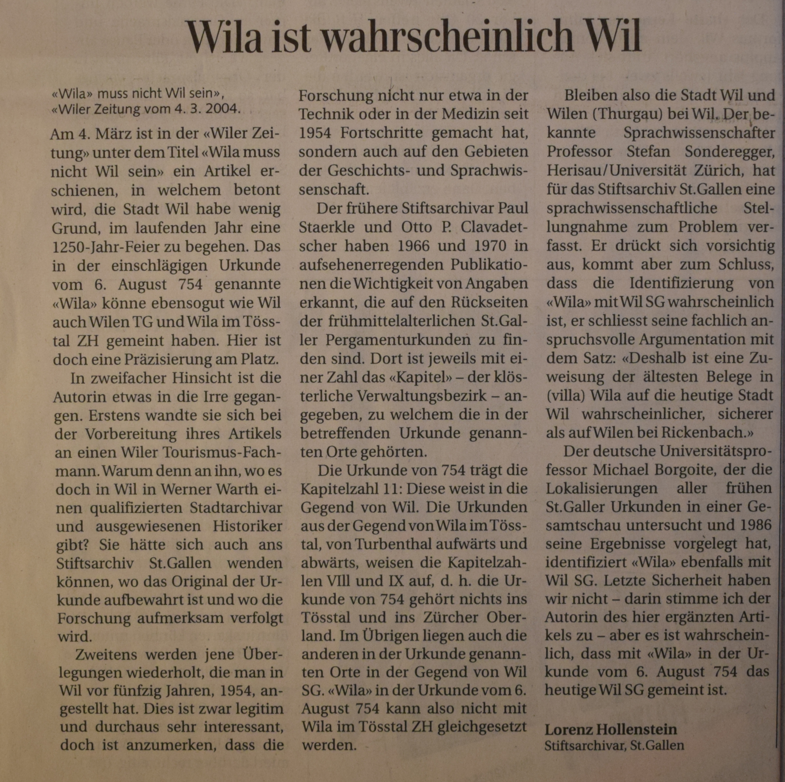 Am 6. August des Jahres 754 schenkte Rothpald, ein reicher Grundbesitzer im Thurgau, all sein Gut im Dorf Rickenbach, sowie zu Wil und Züberwangen, zu Wangen, Dussnang, Schlatt, Butzenberg und Wenzikon an Othmar, den ersten Abt des Klosters St. Gallen. Allerdings ist es auch heute noch nicht hundertprozentig eindeutig geklärt, ob das damals genannte "Wila" identisch mit dem heutigen Wil ist.