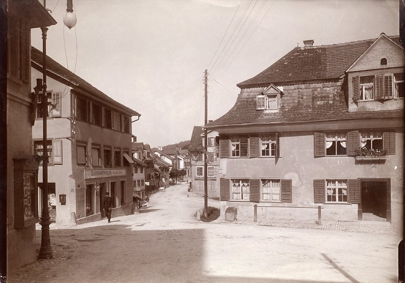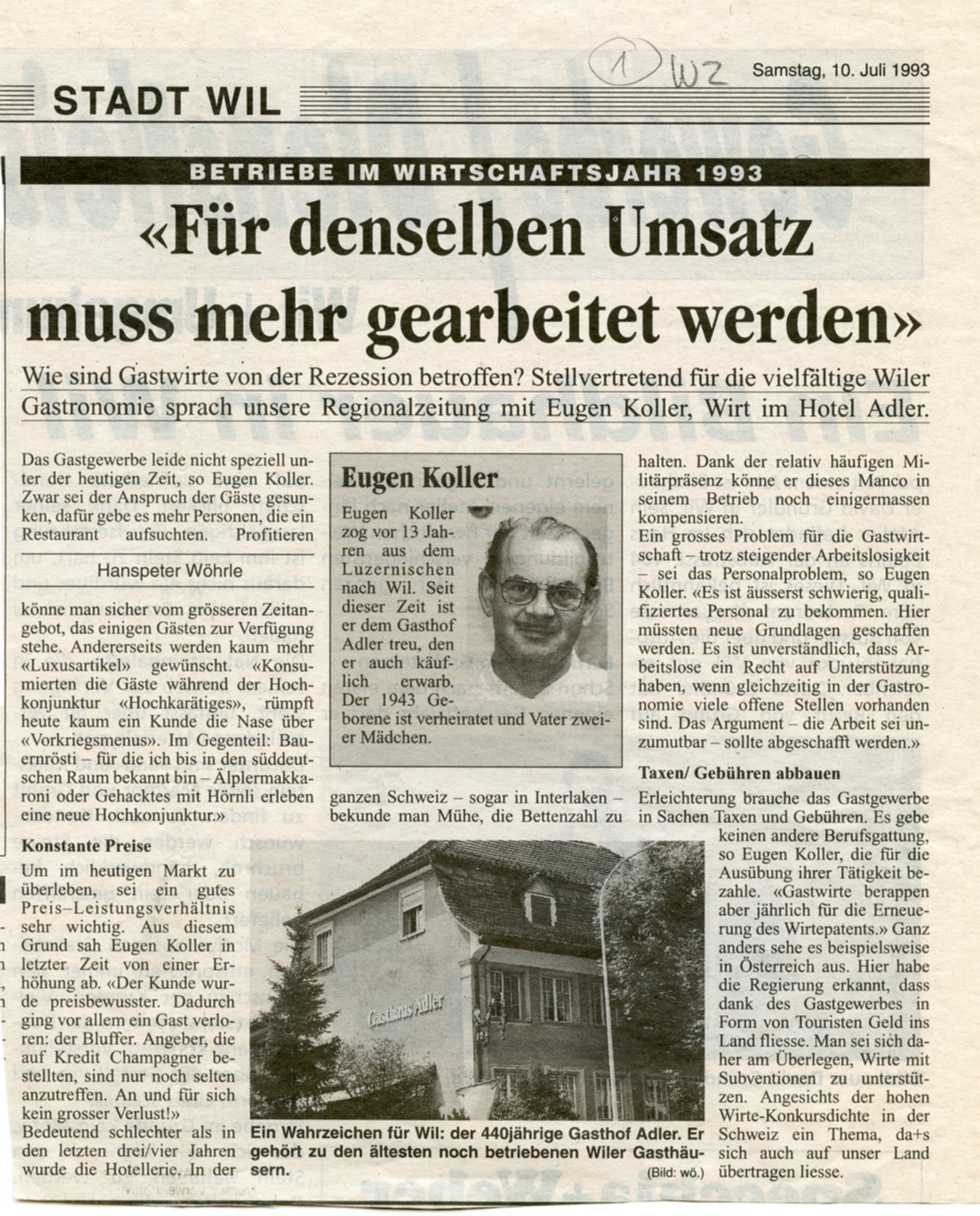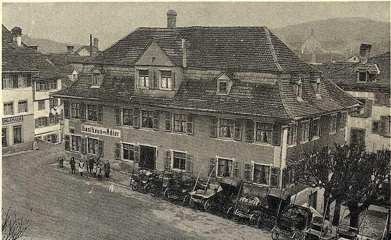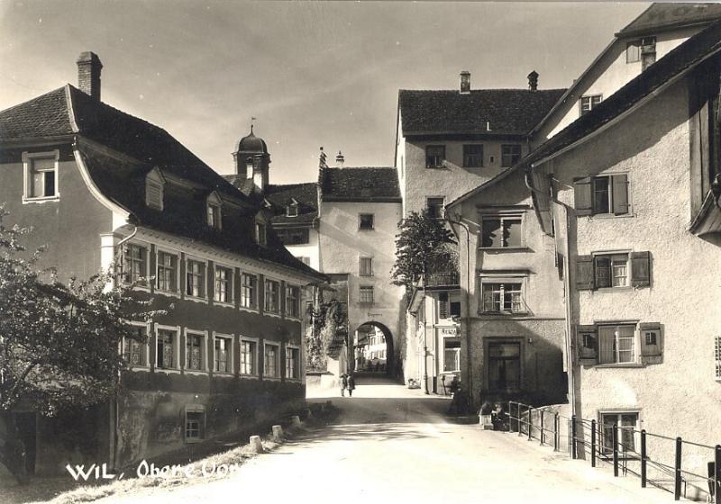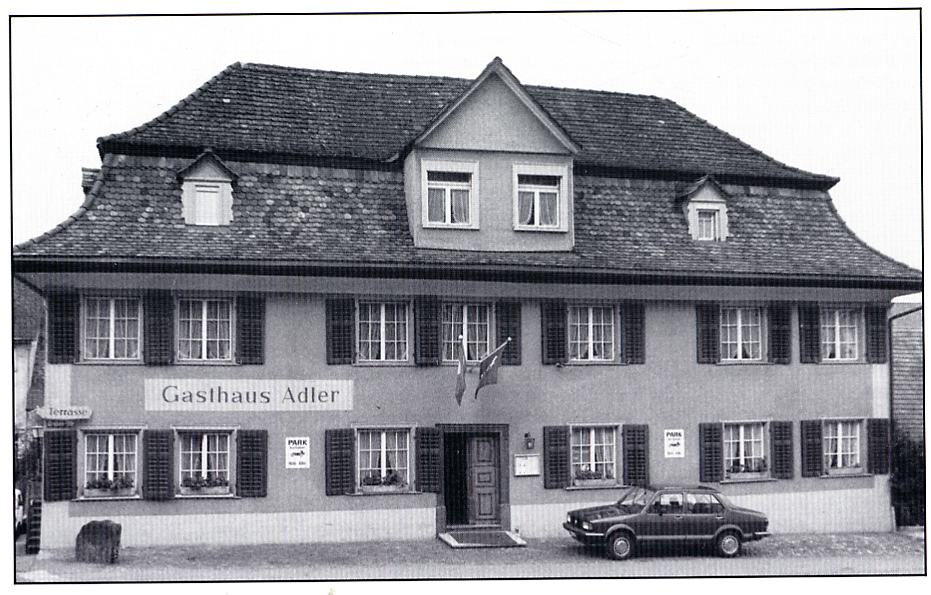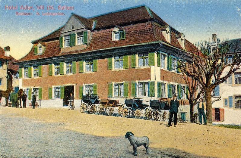 Ausgangs des "Oberen Tores" - dem einzigen noch erhaltenen Stadttor in Wil - steht das Restaurant und Hotel "Adler". Obwohl einst der alte "Bären" und die "Warteck" an derselben Strassenkreuzung standen, gab doch der "Adler" dem davorliegenden Platz seinen Namen. Als das für seine Zeit grosse Gebäude gebaut wurde, war das Strassengefälle zur "Oberen Vorstadt" hinaus um einige Prozente steiler. Die heutige Grabenstrasse war damals noch der eigentliche "innere Graben". Der stattliche Gasthof mit den grossen Pferdestallungen war damals von der Frontseite her bedeutend höher und dürfte nur durch einen Stiegenaufgang erreichbar gewesen sein. Übrigens wurde das erste schmiedeiserne Wirtshausschild vor 1900 gestohlen und das zweite musste des Verkehrs wegen von der Nordwestecke in den südlichen Teil der Hauptfront versetzt werden. Heute finden wir den "Adler" wieder an der Nordseite. Dank der ausgezeichneten Lage für Durchreisendeund auch dank tüchtiger Wirtsleute hat sich der "Adler" durch die Jahrhunderte bestens erhalten. Er zählt daher auch zu den ältesten noch betriebenen Gaststätten Wils.