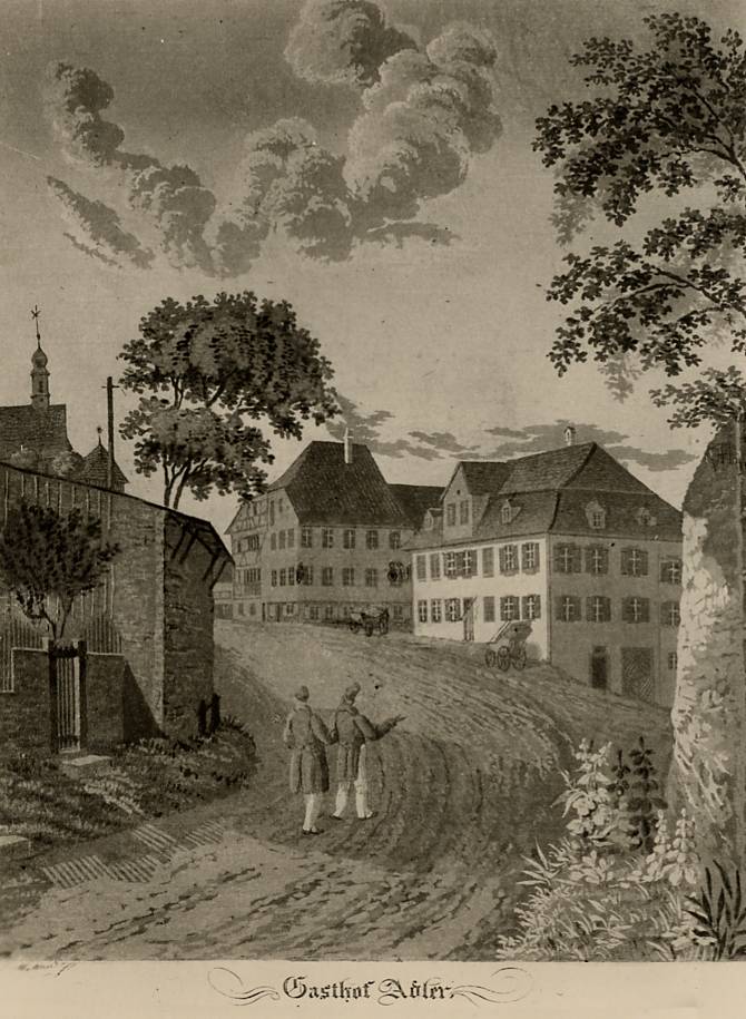 Wann genau der "Adler" als Gasthaus eröffnet wurde, lässt sich nicht sagen. In den Ratsprotokollen des 17. Jahrhunderts finden sich aber verschiedene Stellen, die den "Adler" betreffen. So erscheint bereits im Protokoll vom 26. Januar 1615 eine Tavernenwirtschaft "Adler". Anno 1653 soll Thoma Wolff, der "Adlerwürth", gegen die Wirteordnung verstossen haben, indem er zusätzlich selber "metzgete". Es gelang ihm aber, den Rat davon zu überzeugen, dass er für seinen eigenen Haushalt geschlachtet habe. So ist er "der straff ledig" gelassen worden. Den Wirten war nämlich der Betrieb eines weitern Gewerbes verboten. Im gleichen Jahr wurde Thoma Wolff wieder verklagt, diesmal wegen Ausschankes von Wein im "Rothen Gatter". Dies war das Schankhaus des Hofs und als solches von der Umgeldpflicht befreit. Weil der Adlerwirt nun die Abgabenpflicht umgehen wollte, wurde die Klage eingereicht.