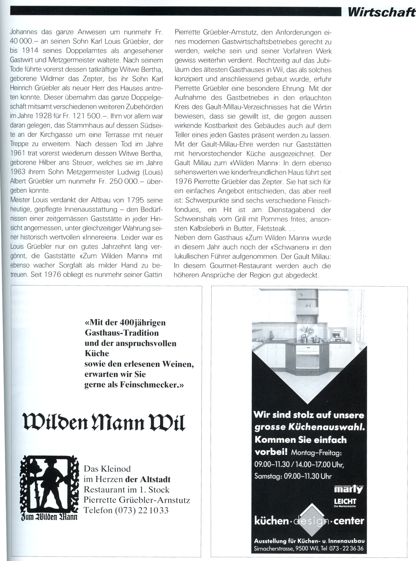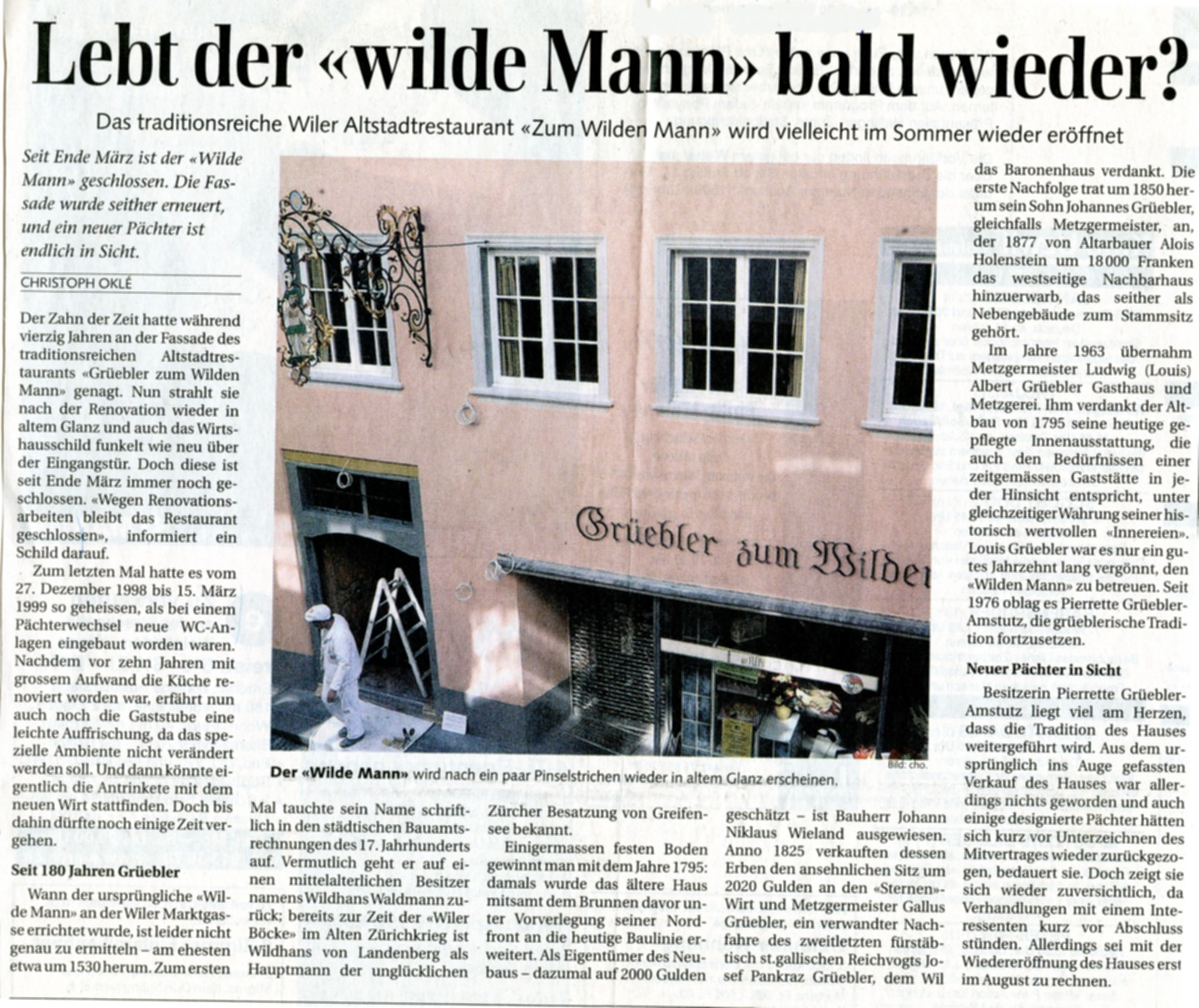 Nach seinem Tod 1961 übernahm vorerst seine Witwe, Frau Bertha Grüebler-Hilber, das Steuer, bis 1963 der Sohn, Metzgermeister Ludwig (Louis) Albert Grüebler, die Nachfolge antrat. Ihm verdankt der "Wilde Mann" seine heutige gepflegte Innen-Ausstattung. Seit 1976, nach dem Tod von Louis Grüebler, führt nun Frau Pierrette Grüebler-Amstutz den "Wilden Mann" im Bewusstsein der langen Tradition. Das prächtige, handgeschmiedete Rokoko-Aushängeschild gegen die Marktgasse mit dem Erinnerungsdatum von 1690 weist dem Besucher auch heute noch den Weg in eine der ältesten und schönsten Gaststätten Wils.
