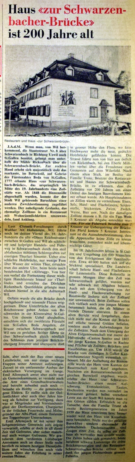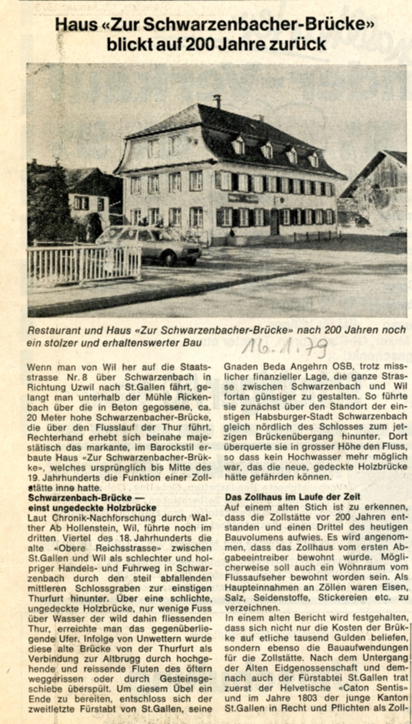 Um einen Drittel kleiner als der heutige Baubestand, liess im Jahre 1777 Fürstabt Beda auf der rechten Thurseite - von Wil herkommend - eine Zollstätte kurz vor Schwarzenbach erbauen. Im Barockstil, direkt vor der Brücke, über die man in rund 20 Metern Höhe die Thur überquert, stand das markante Zollhaus. Im Stiftsarchiv in St. Gallen geben heute noch diverse Akten und andere Schriftstücke Auskunft über den regen Verkehr und die Zollab-gaben, die zu leisten waren. Der Unterhalt der Brücke wie auch der Zollstätte benötigte ansehnliche Summen. Bis Mitte des 19. Jahrhunderts wahrte das Haus "Zur Schwarzenbacherbrücke" seine Funktion als Zollhaus. Als 1848 der Schweizerische Bundesstaat gegründet wurde, fielen auch sämtliche Binnenzollschranken. Für das stattliche, zu Wil gehörende Gebäude wurde eine andere Zweckbestimmung gesucht. Der Kanton, nun Eigentümer der Liegenschaft, hatte keine Verwendung und bot das Haus der Bauernschaft zum Kauf an. Nachdem es noch vergrössert worden war, wurde das ehemalige Zollhaus in ein Restaurant mit Wohnräumen umgewandelt.