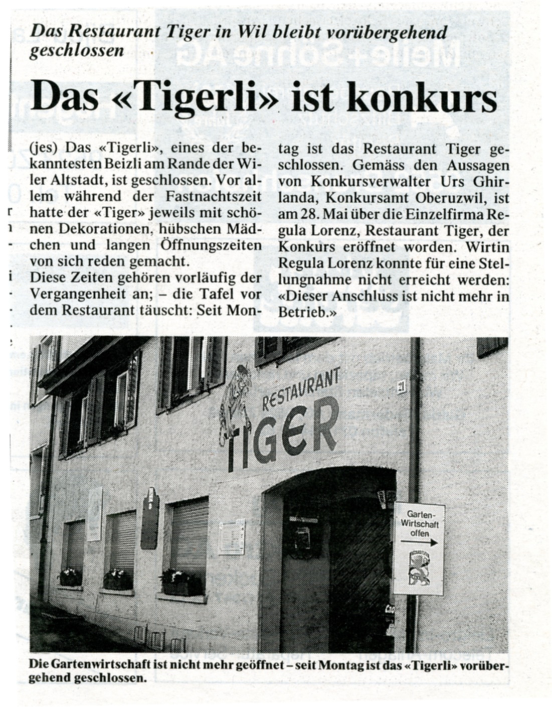 Viele Wirtewechsel prägten die nächsten Jahre, obwohl mit Julius Hüppi der nächste Wirt gar 28 Jahre amtete. Vor allem zur Fastnachtszeit war das "Tigerli" beliebt, es durfte bei keinem Beizenbummel fehlen. 1987 wurde eine Renovation nötig, gleich-zeitig wurde eine Bar eingebaut. Die neue Besitzerin, Frau Regula Lorenz, versucht nun, mit neuer Ausstattung und Ambiance, vermehrt auch jüngere Leute anzusprechen.