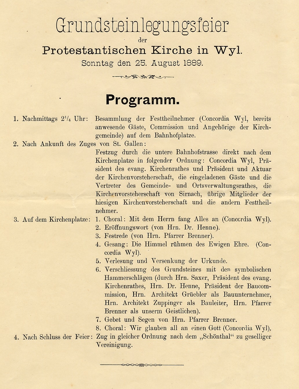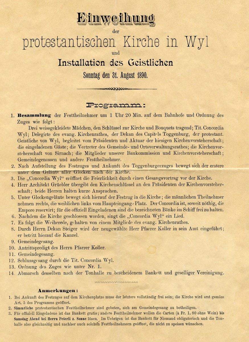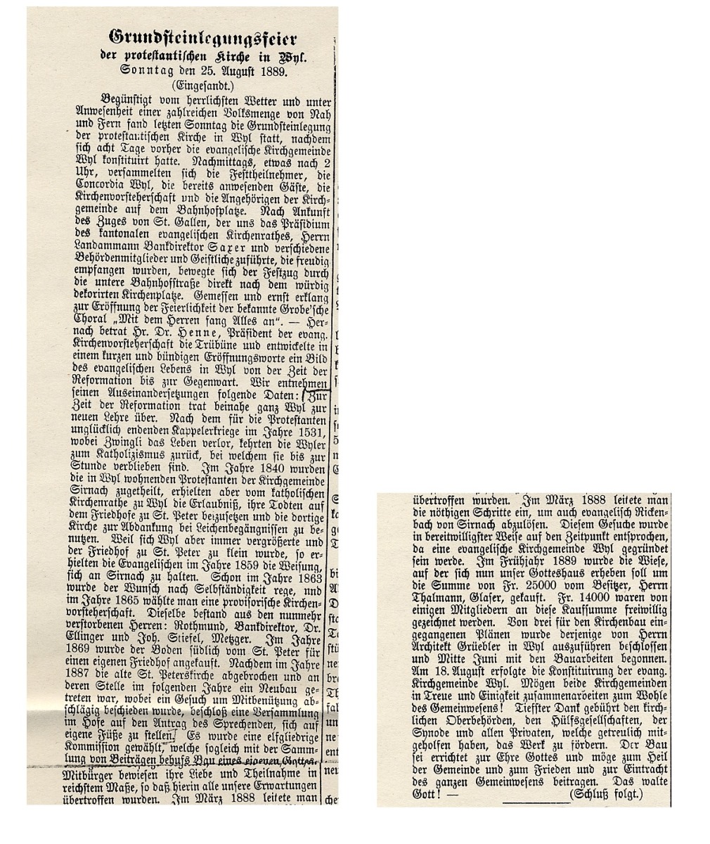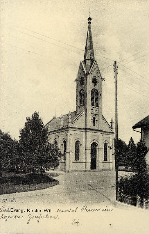 Am 18. August 1889 um 19 Uhr versammelten sich 62 Stimmberecht te in der Tonhalle zur Konstituierung der Evangelischen Kirchmeinde Wil. Diese zählte bei der Gründung 723 Mitglieder (Wil 578, Bronschofen-Rossrüti 88, Rickenbach 57). Eine Woche späte fand "begünstigt vom herrlichsten Wetter und unter Anwesenheit einer zahlreichen Volksmenge von Nah und Fern" ("Wyler Zeitung") die Grundsteinlegung für den Kirchenneubau statt. Und schon ein Jahr später, am 31. August 1890 war Kirchweihe und Installation des ersten evangelischen Pfarrers von Wil. Nochmals die "Wyler Zeitung": "Es war wirklich ein stattlicher Zug, der (.. durch die untere Bahnhofstrasse nach der Toggenburgerstrasse wallte, wo das schmucke, neue Gotteshaus, an herrlichem Platze stehend, seit einigen Wochen mit seinem schlanken Turm nach oben zeigt und als schönes, wohlgelungenes Werk in allen Teile seinen Meister lobt." Der Neubau war auf 87'800 Franken zu stande gekommen; Planung und Bau hatten lediglich 17 Monate beansprucht.
