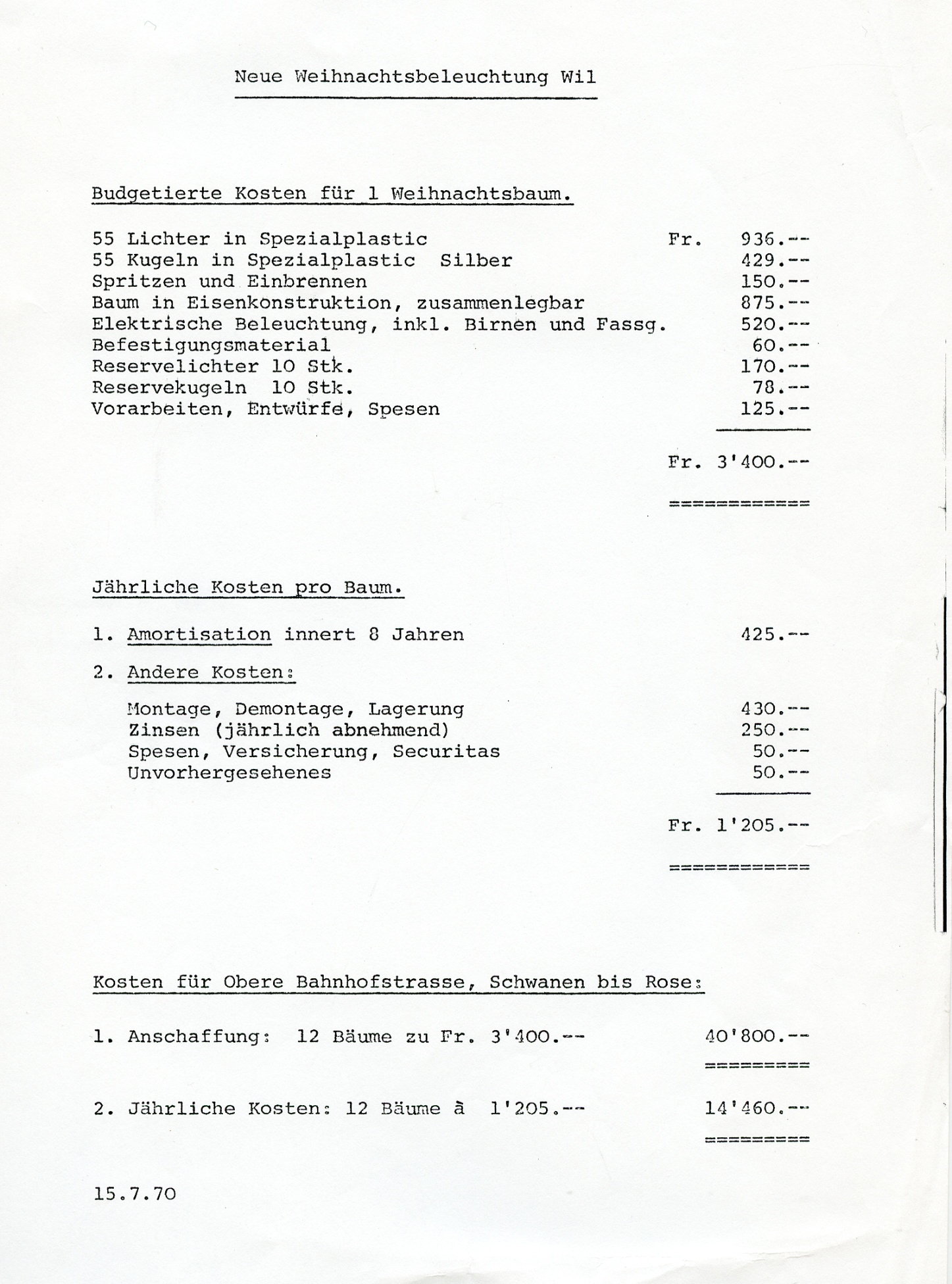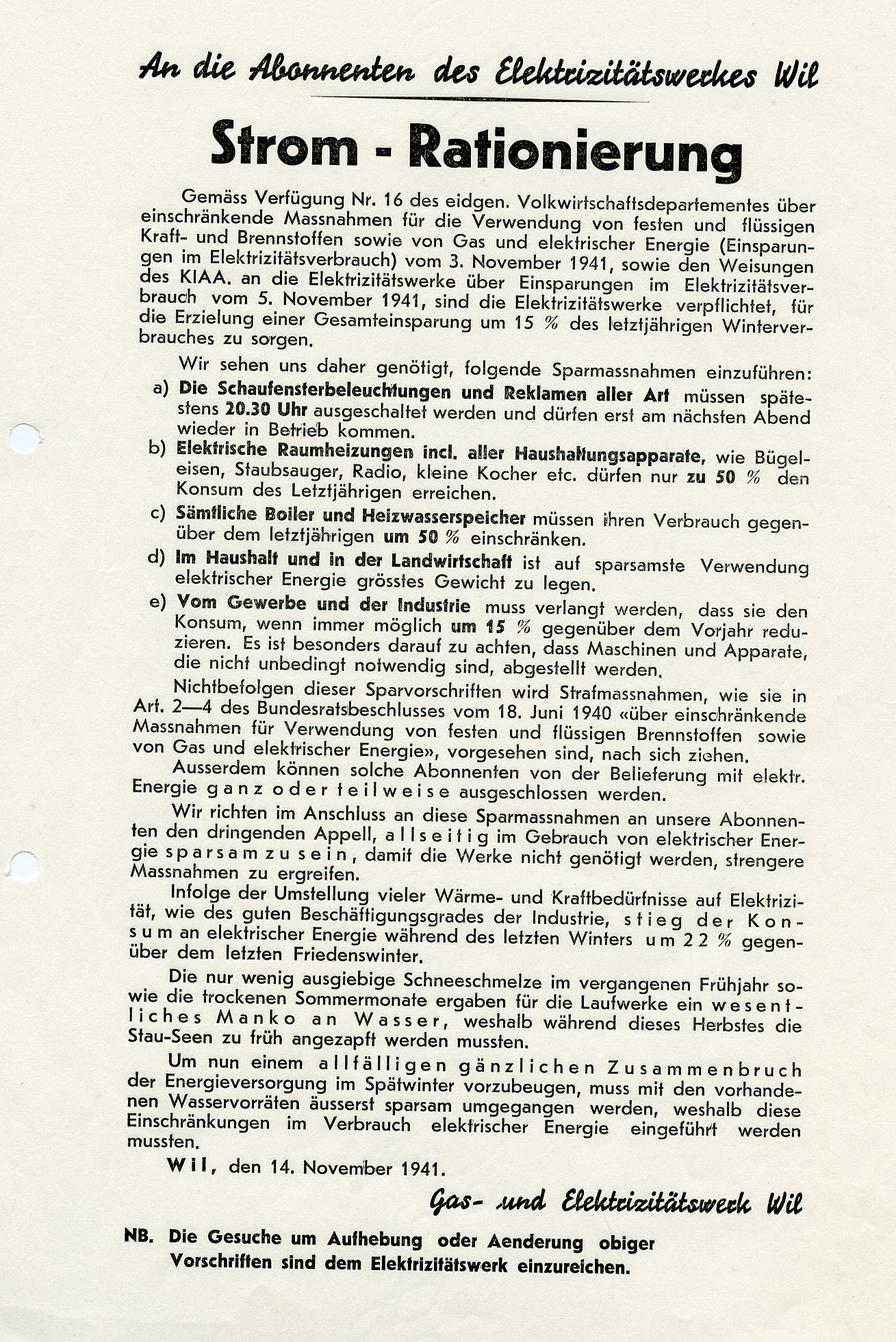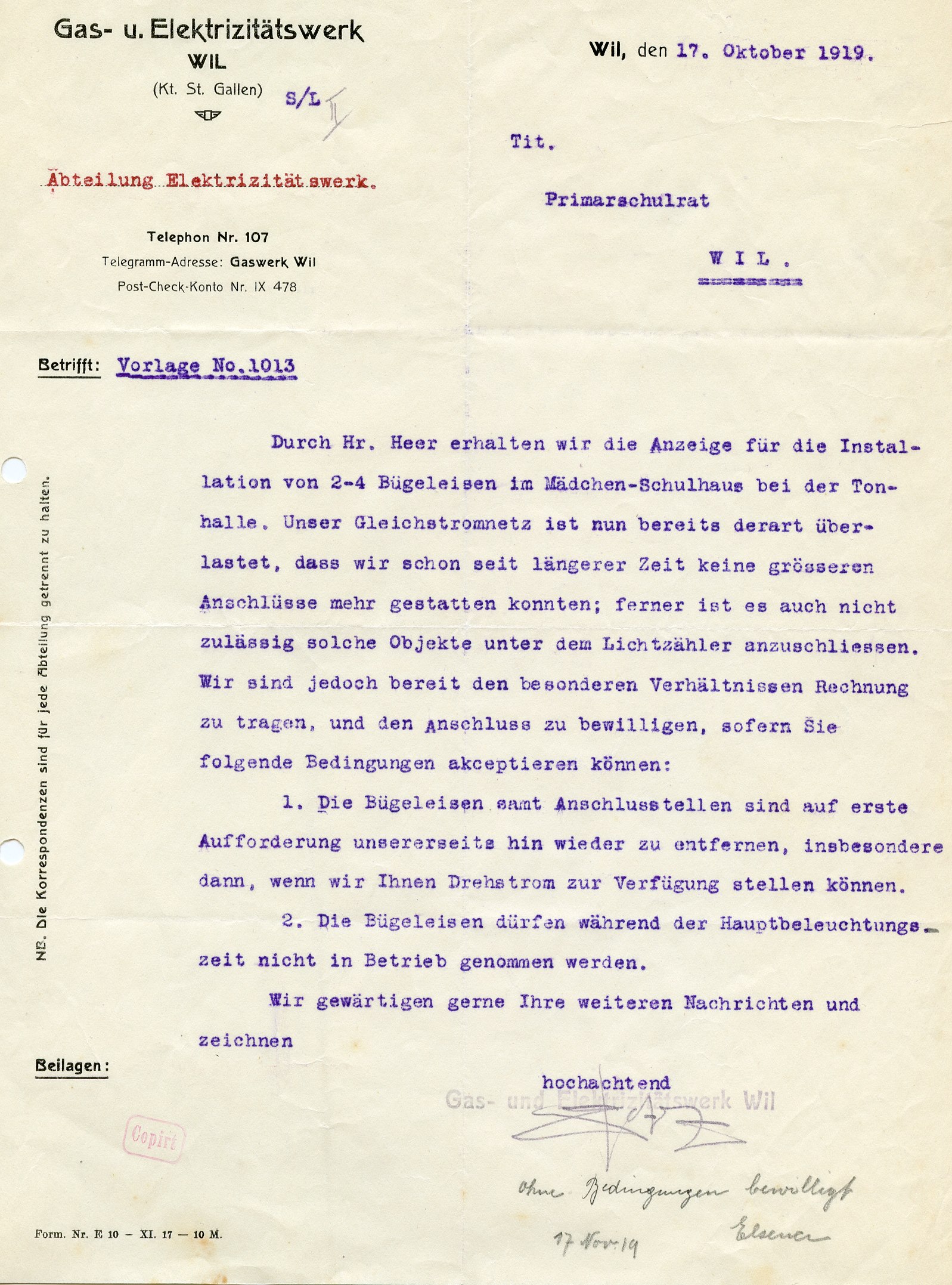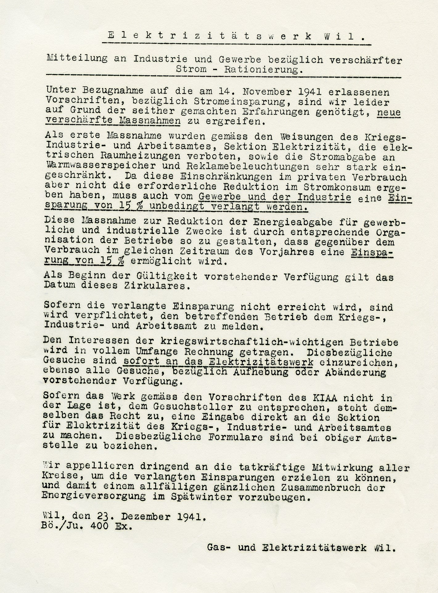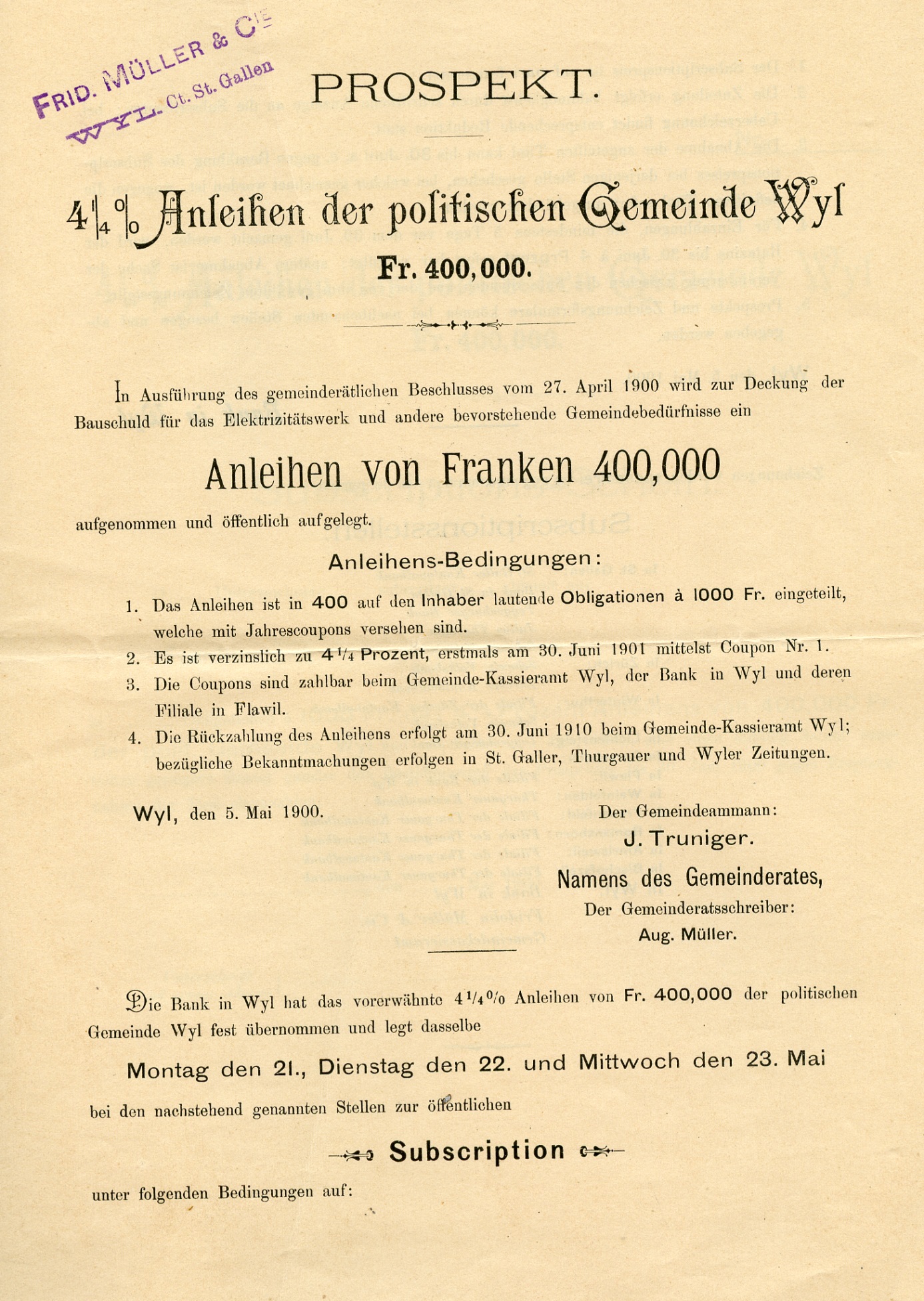 1. Es soll auf Grundlage der Vorschläge der Beleuchtungskommission und des vor-liegenden Projektes II von Rieter & Co. ein städtisches Elektrizitätswerk behufs Licht- und Kraftbeschaffung erstellt werden, welches unter dem Titel "Elektrizitätswerk Wil" einen speziellen Verwaltungszweig der Gemeinde bildet und separate Rechnung führt.