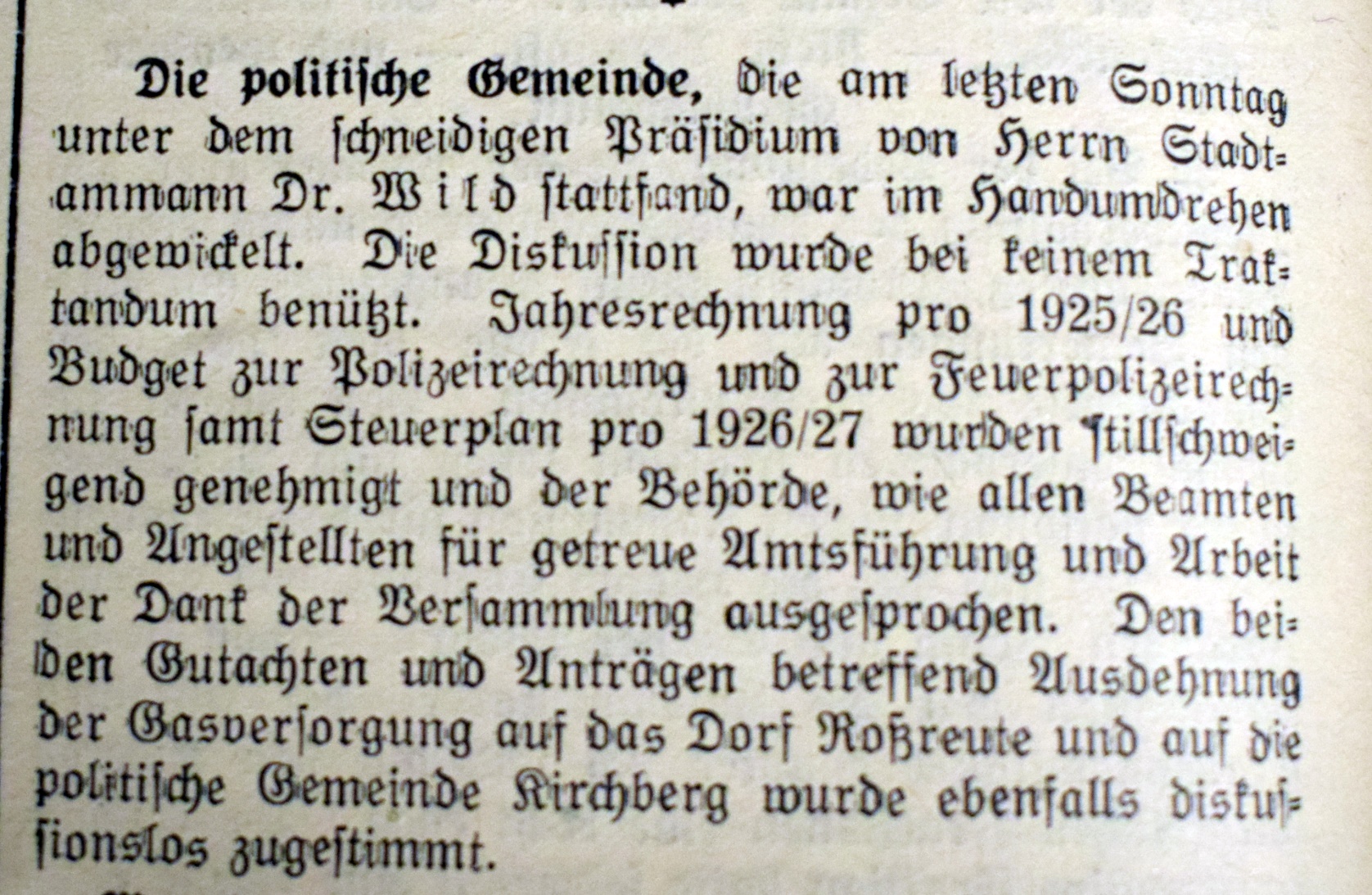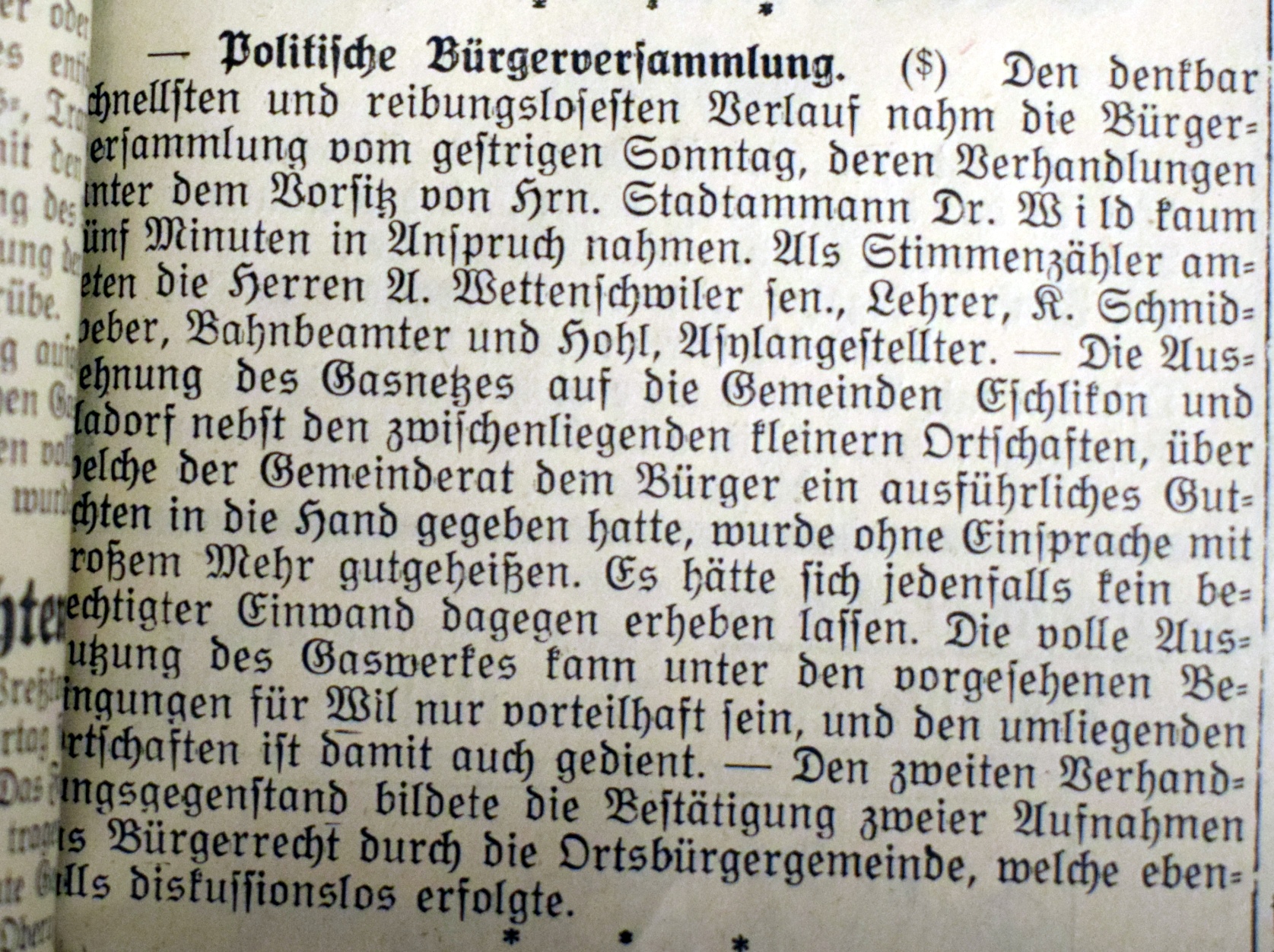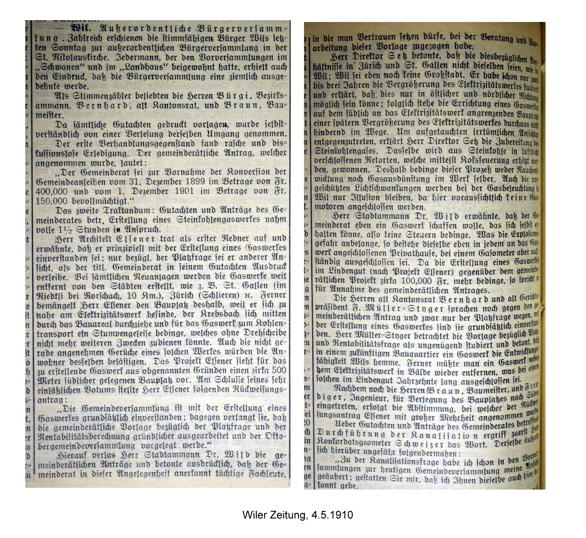 In einem separaten Bericht, enthaltend Gutachten und Anträge des Gemeinderates für die Bürgerversammlung vom 26. November 1911 ist die nachstehende Orientierung enthalten: "Anläßlich der außerordentlichen Bürgerversammlung vom 1. Mai 1910 haben wir Ihnen Gutachten und Anträge betreffend Errichtung eines Steinkohlengaswerkes zur Beschlußfassung unterbreitet. Unser Antrag ging auf Errichtung eines Gaswerkes auf dem Areal beim Elektrizitätswerk: bestimmend für die dannzumalige Stellungnahme waren die finanziellen und betriebstechnischen Vorteile, welche sich nach der übereinstimmenden, auf eingehendem Studium beruhenden Ansicht der Experten und der Behörde, als sichere Folge mit der Zustimmung zum erstmals vorgeschlagenen Platze ergeben hätten. Dieser Standpunkt erhielt aber Ihre Billigung nicht; Sie haben an obgenannter Gemeindeversammlung die verlangte nochmalige Prüfung der Angelegenheit gutgeheißen und den nachstehenden Antrag: "Die Gemeindeversammlung ist grundsätzlich mit der Erstellung eines Gaswerkes einverstanden; dagegen verlangt sie, daß die gemeinderätliche Vorlage bezüglich Platzfrage und Rentabilitätsberechnung gründlicher ausgearbeitet und uns in der Oktoberversammlung ein anderer Platz mit Gutachten vorgelegt werde", angenommen.