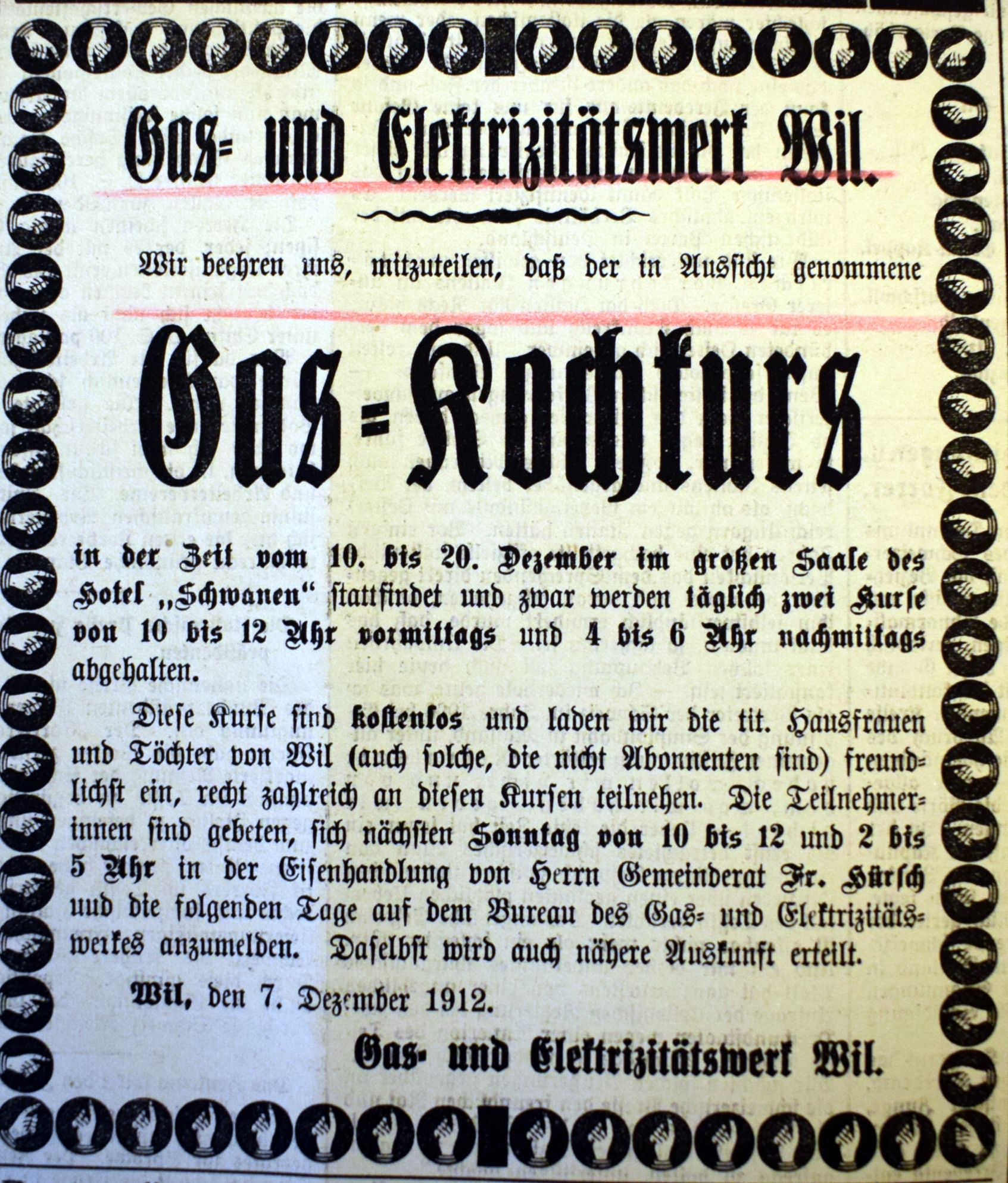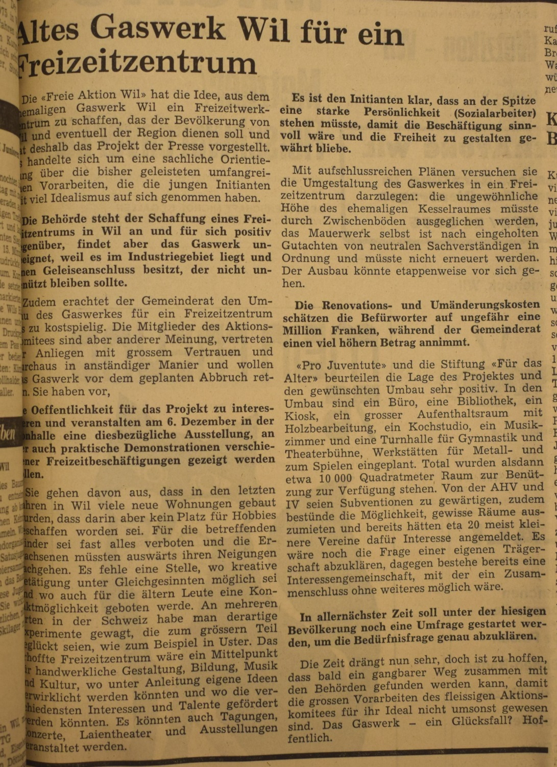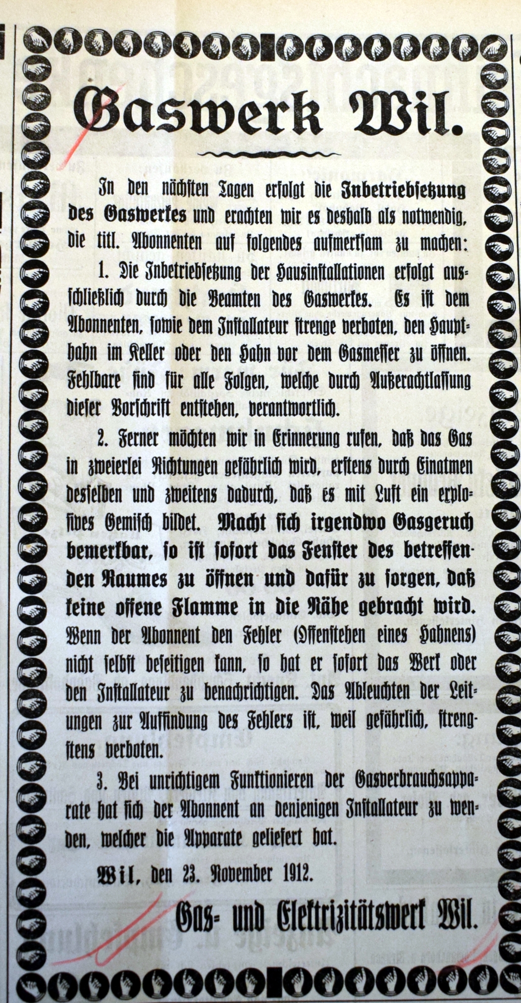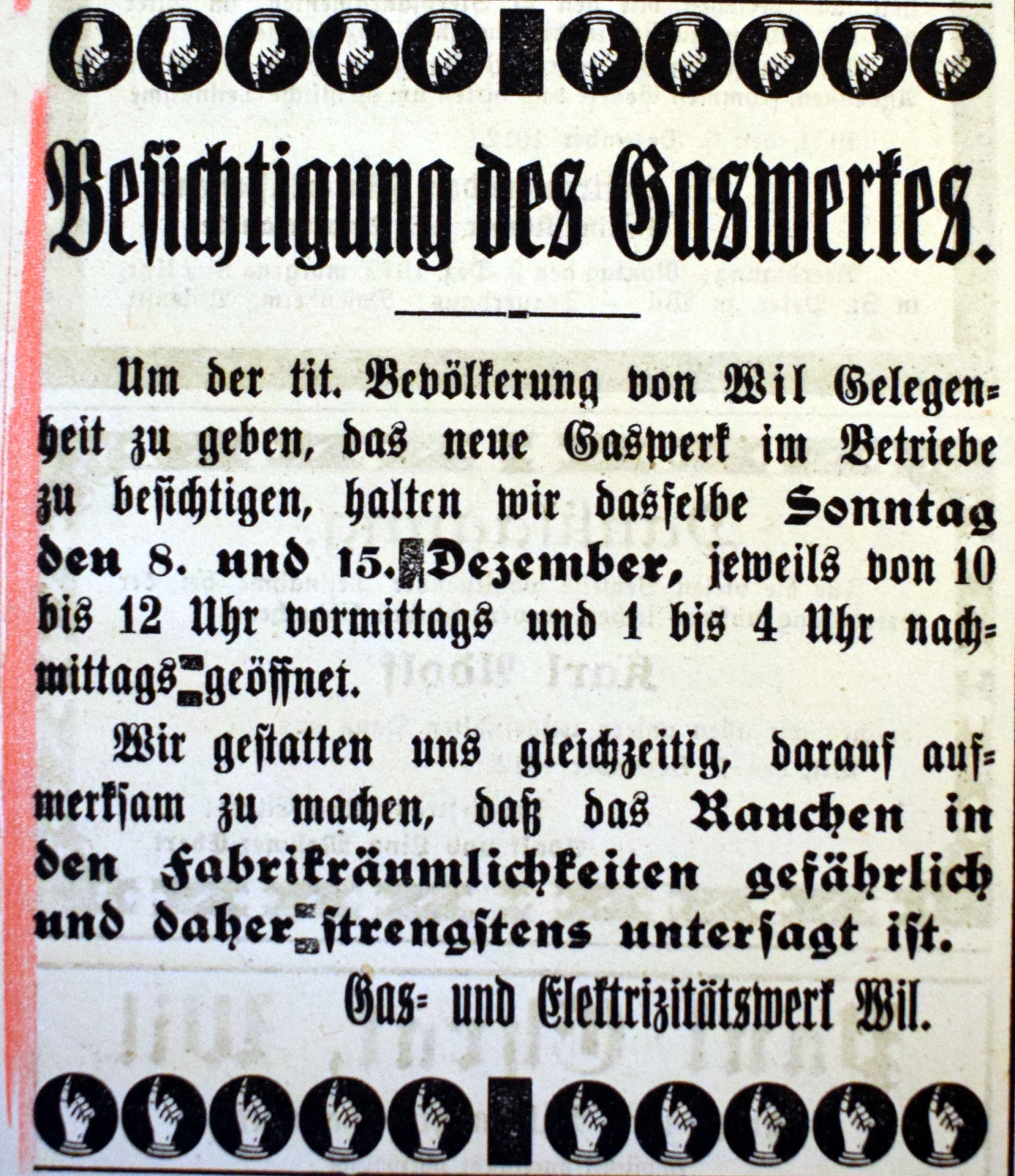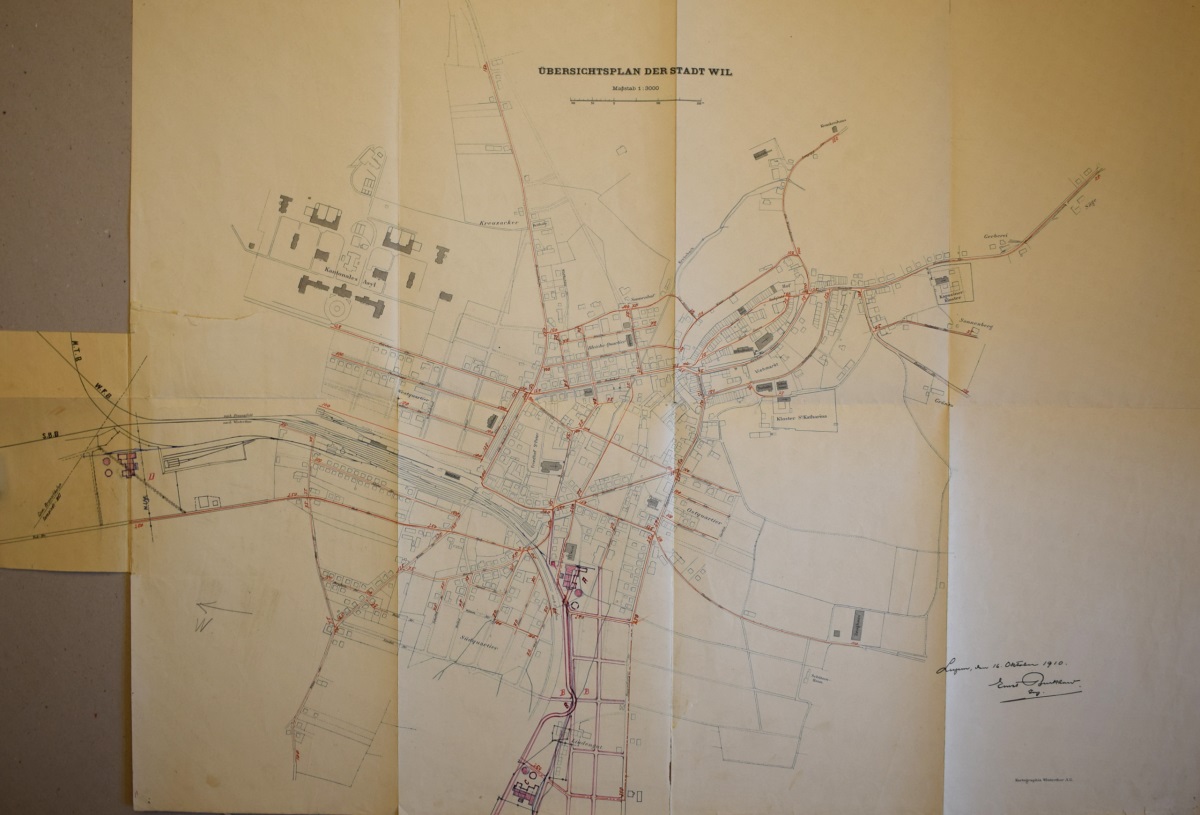 Im Amtsbericht der politischen Gemeinde Wil vom Rechnungsjahr 1907/08 findet sich unter den Geschäften des Gemeinderates erstmals folgende, wörtlich wiedergegebene Orientierung: "Die Frage der Erweiterung und Umänderung des Werkes (Elektrizitätswerk) steht im Stadium der Vorberatung; ein zu erstrebender neuer Vertragsabschluß unter veränderten Konditionen und eventuelle Möglichkeit der Schaffung eines, das bestehende Elektrizitätswerk ergänzenden und unterstützenden Gaswerkes bilden heute die Grundidee für die beabsichtigte, durch die Entwicklung der Gemeinde gebotene Entlastung, wobei eine zeitgmäße Ausgestaltung des Werkes in kleinerem Rahmen die Leistungsfähigkeit desselben auf der Höhe halten muß. Wir werden voraussichtlich in der Lage sein, Ihnen ebenfalls anläßlich einer außerordentlichen Bürgerversammlung während des laufenden Jahres bezügliche Anträge vorzulegen."