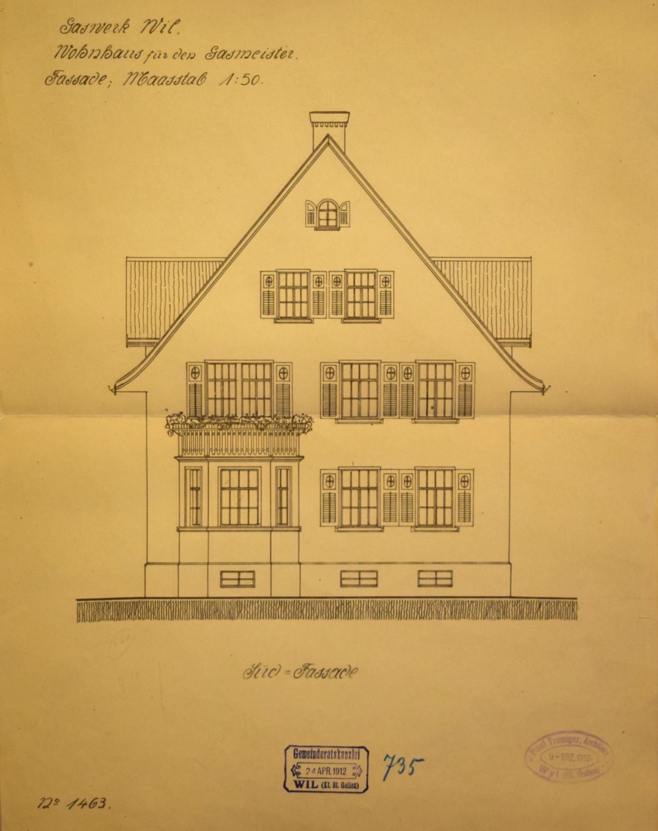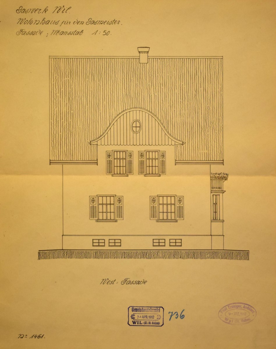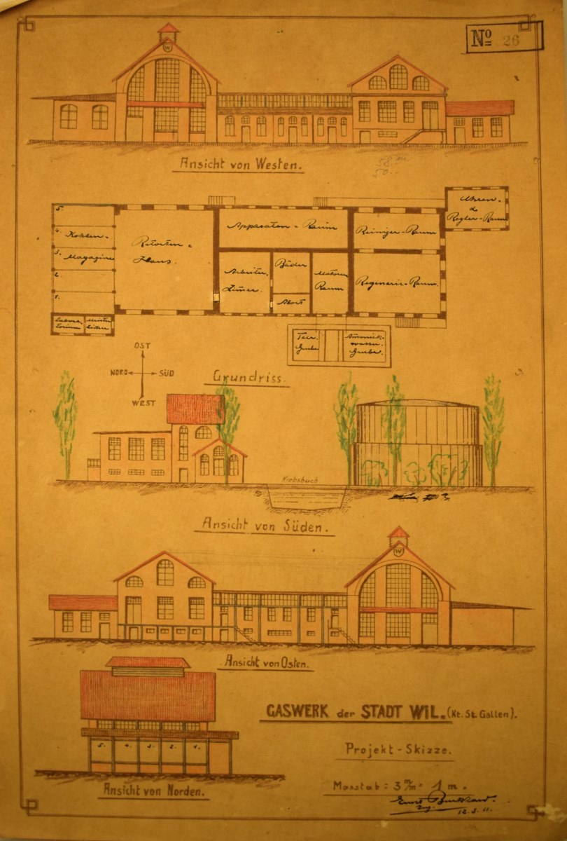 Das von dem bekannten Gasfachmann Herrn Direktor Burkhard, Luzern, ausgearbeitete Projekt der Erstellung eines Gaswerkes im Bergholz fand hierauf an der Versammlung vom 26. November 1911 die einhellige Zustimmung der Bürger, wobei gleichzeitig auch der hiefür notwendige Kredit von Fr. 540'000.- erteilt wurde. Mit der Projektierung und Bauleitung für die Hochbauten wurde Architekt Paul Truniger, Wil, betraut.