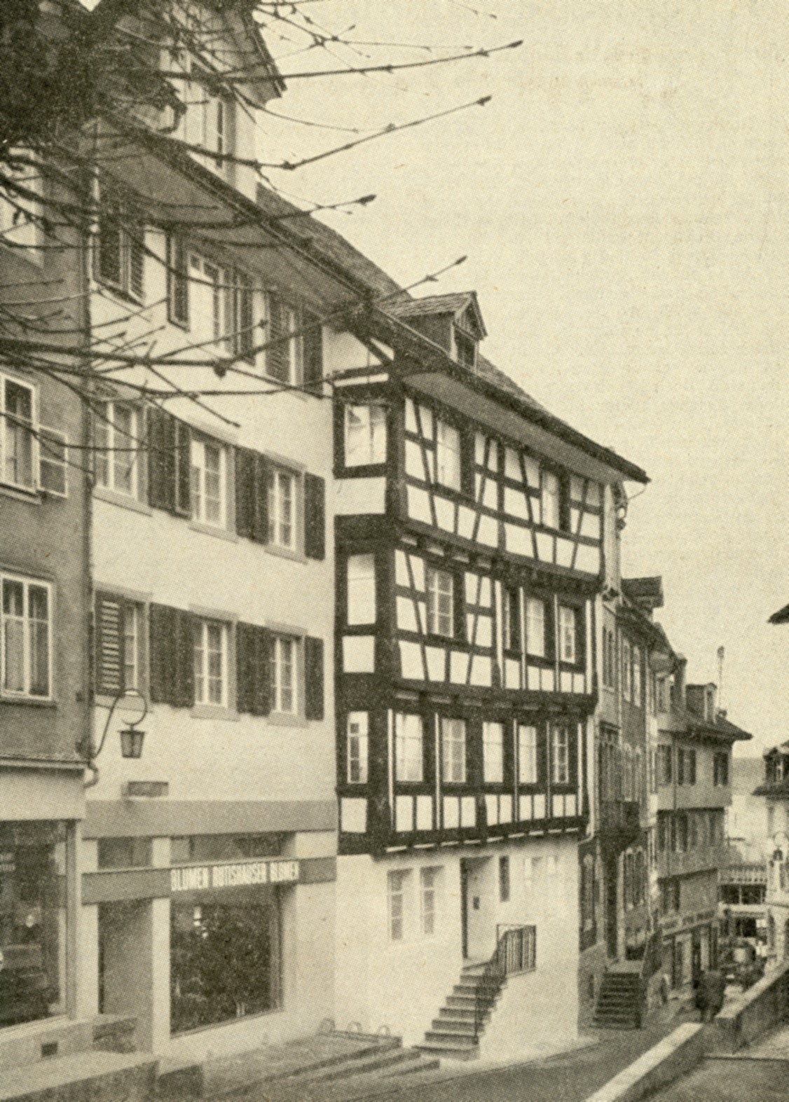 Ein schönes Beispiel eines frühen Fachwerkbaus präsentiert dieses Bürgerhaus mit leicht vorkragenden Obergeschossen. Die Deckenbalken der Geschosse treten aus der Wand hervor und sind auf die waagrecht über den Ständern liegenden Rahmbalken gestützt, damit sie ein vorkragendes Geschoss tragen können. Mit dieser Bauweise lassen sich bei guter Ausnützung des Systems die Obergeschosse auf knappem Baugrund räumlich erweitern. Durch mehrfache, übereinander gestaffelte Auskragungen, die im Steinbau unmöglich waren, gab man dem Fachwerk auch eine höhere statische Festigkeit. Das konstruktive Gerüst dieses Baus besitzt über das technisch-statisch Notwendige hinaus auch dekorativen Eigenwert.