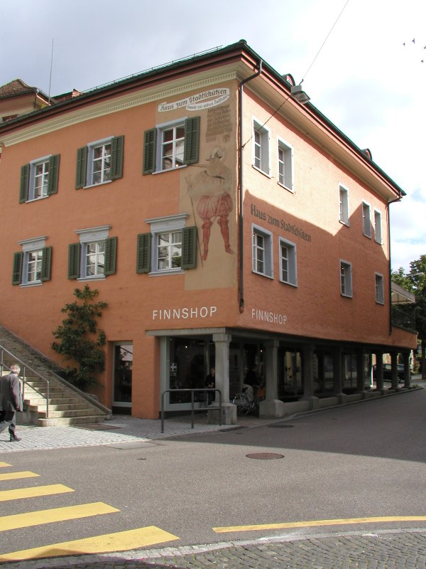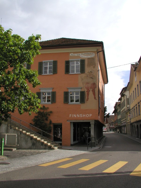 Wer sich der Altstadt von der Oberen Bahnhofstrasse her nähert, erblickt am Fusse der "Stadt auf dem Berge" einen prägenden Bau, städtebaulich einer Schlüsselstellung entsprechend. Er flankiert den Aufstieg zur Oberstadt und begleitet die Grabenstrasse, fängt auch den Blick am Ende der Toggenburgerstrasse. Beim Näherkommen erkennt man das Wandbild mit der Figur eines Stadtschützen, begleitet von folgender Inschrift: