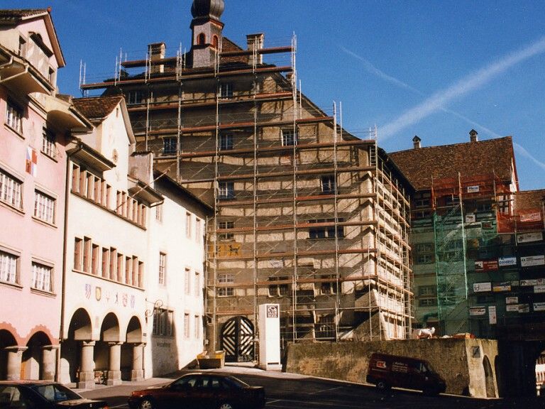 Zum Bau und seiner Geschichte Der mächtige, burgähnliche Bau ist eines der markantesten Wahrzeichen Wils. Noch spürt man hier wehrhafte Wucht und ahnt die einstige Macht äbtischer Herrschaft. Wesentliche Teile seines Aussehens, so den imposanten Dachstuhl, verdankt der Hof Abt Ulrich Rösch (reg. 1463-91). Bei der 1998 abgeschlossenen Restaurierung stiess man auf Mauerwerk, das früher zu datieren ist.