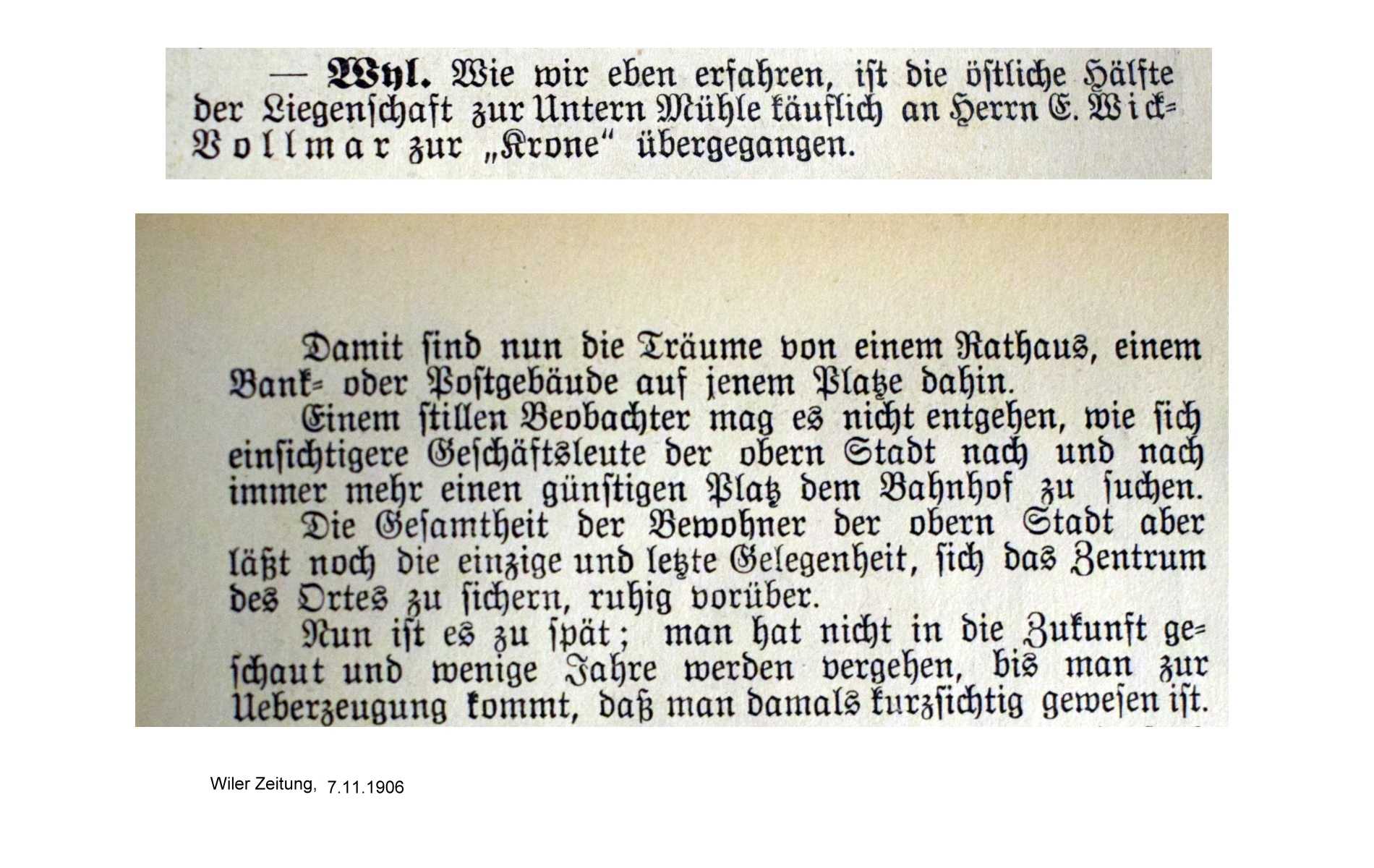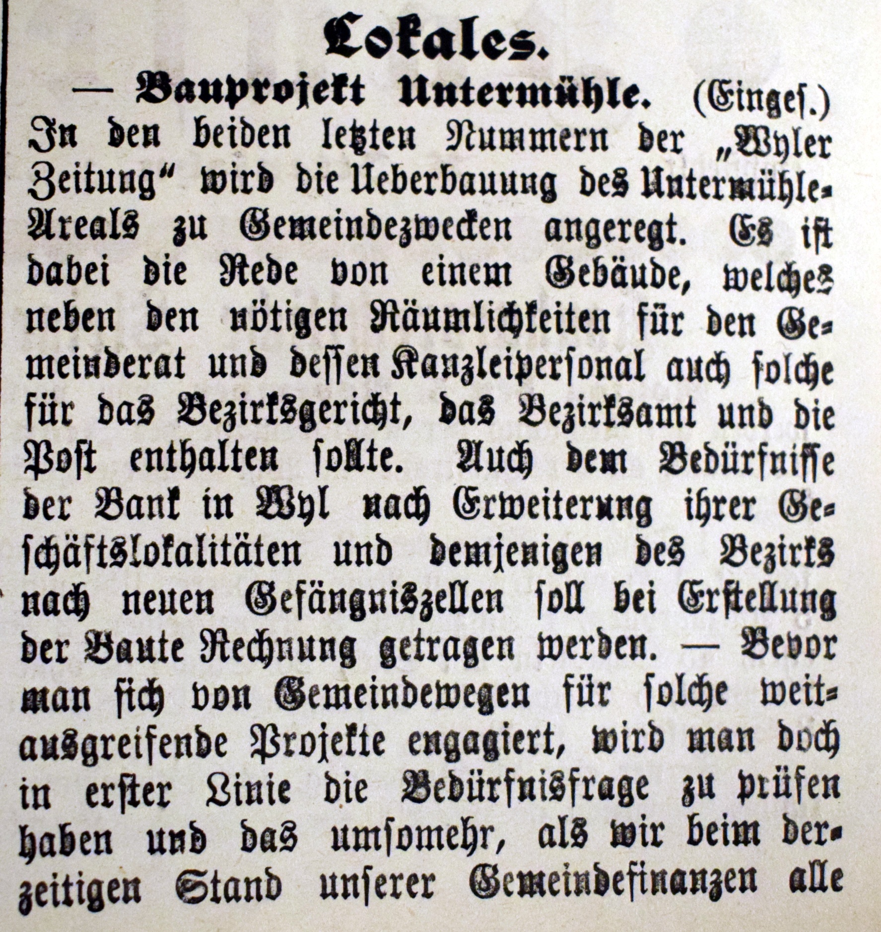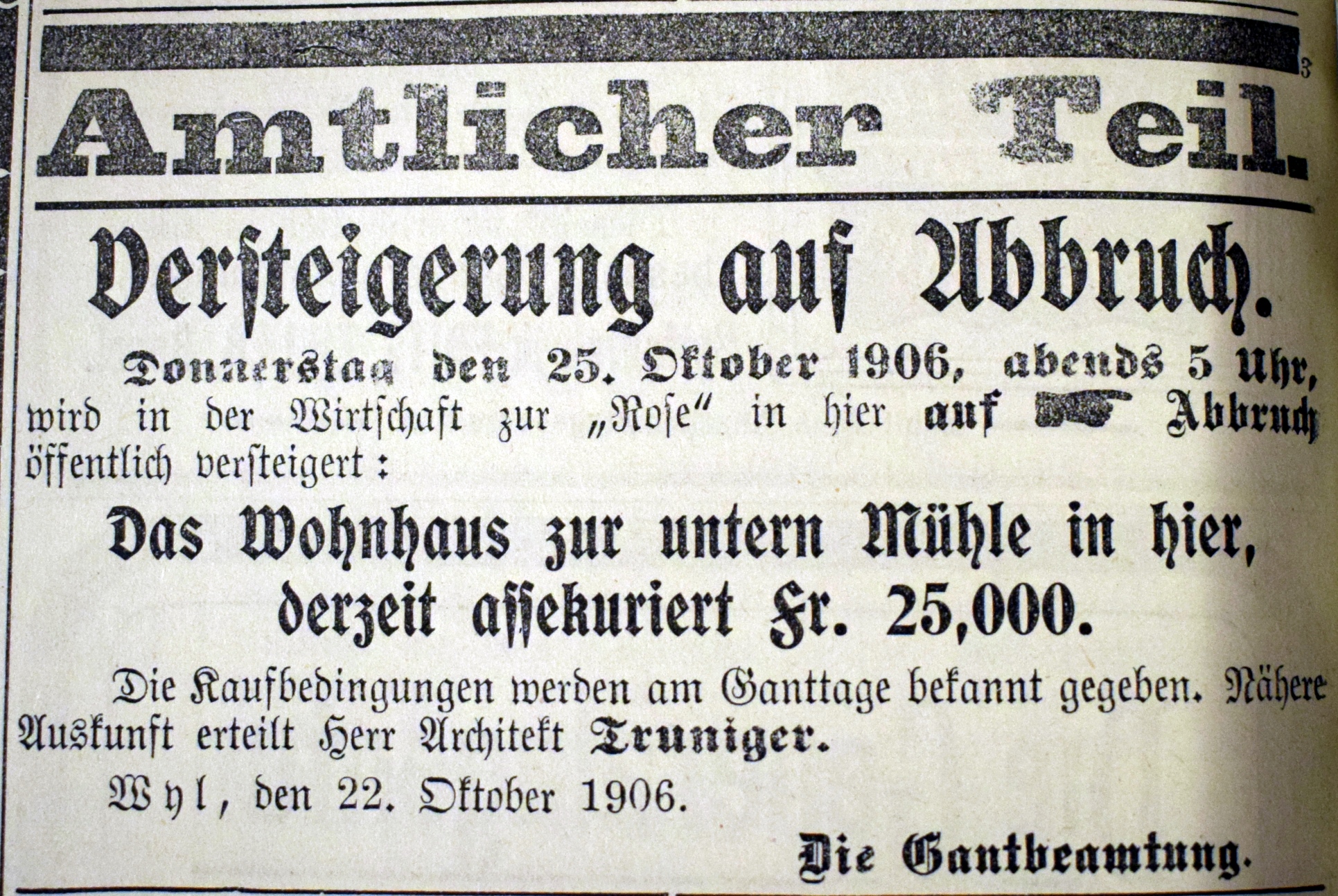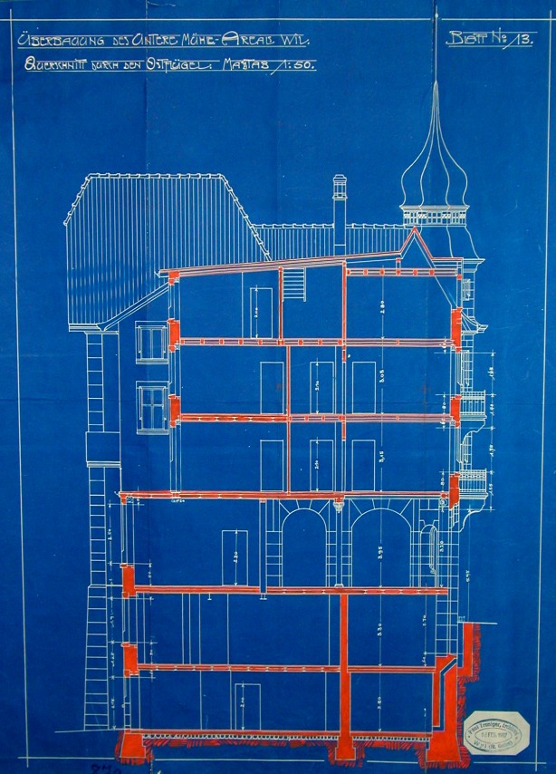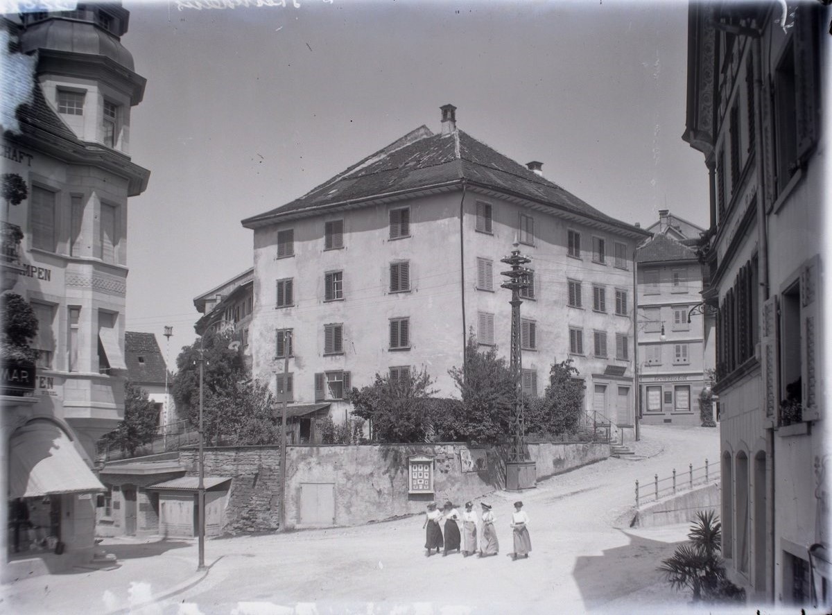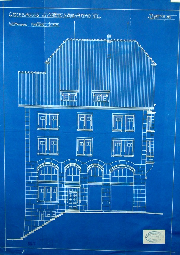 Eine Mühle vor dem unteren Tor (später Pankratiustor) ist Mitte des 13. Jh. urkundlich nachgewiesen, als sie aus dem Nachlass des Schultheissen Eberhard der Kirche zu Wil zufiel. 1907 Abbruch der alten Mühle und Neubau eines Wohn- und Geschäftshauses. Architekt: Paul Truniger (1878-1946). Baumeister: Gebrüder Adolf und Julius Gessert, Wil. 1945 Ladenumbau, 1952 nördlicher Anbau. 1999-2002 Renovationen, Wiederherstellung der ursprünglichen Fassade.