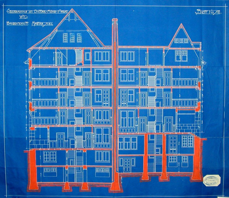 Kräftig profilierte flache Kunststeinbögen bilden den Sockelbereich mit den Schaufenstern und Eingängen. Polygonaler Eckerker mit welscher Haube, der das Mansarddach durchbricht. Am Fassadenerker Jugendstilrelief mit Darstellung einer Mühle und Balkon mit gotisierender Masswerkbalustrade. Klebedach am Giebel und Teilwalmdach mit Heimatstilformen.