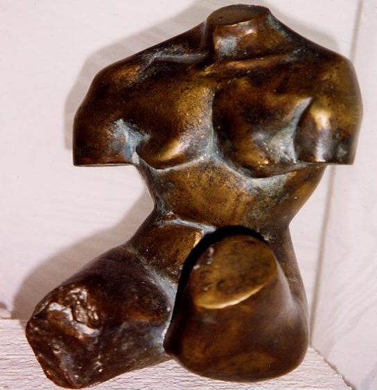 Ganz anders, an den klassischen akademischen Formen orientiert, ist die Alte Frau, eine 3/4 Figur in Bronze, sehr schön modelliert in einer weich geschwungenen S-Linie. Beim Bronze-Torso, sind die Körperformen schon mehr abstrahiert, der linke Oberschenkel ist eigenartig angewinkelt.