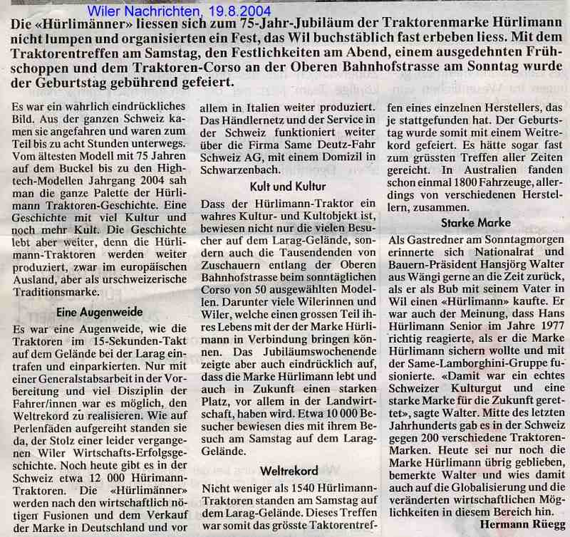Seit 1929 sind von der traditionellen Schweizer Traktorenmarke Hürlimann rund 30'000 Traktoren in der Schweiz verkauft worden. Heute sind noch immer 12'000 im täglichen Einsatz. Viele davon trafen sich im August 2004 zum Corso durch die Aebtestadt Wil. Der Weltrekordversuch "das grösste Hürlimann - Stell dich ein" - wurde zum Treffpunkt alter und junger Hürlimann-Freunde.