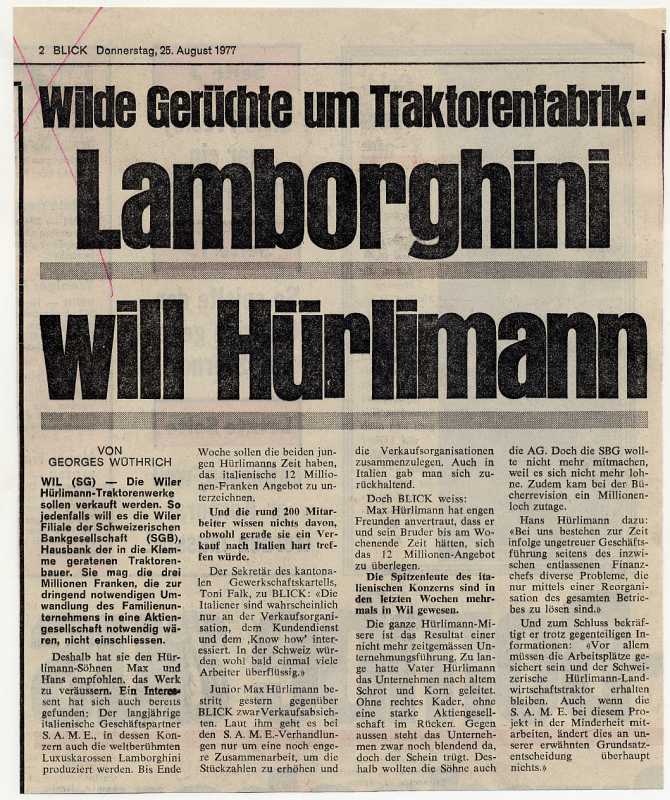 Ende der sechziger und Anfang der siebziger Jahre ging die Zahl der verkauften Hürlimann-Traktoren immer mehr zurück. Dies und die Kostensteigerung führten seit 1970 zu immer grösseren Verlusten. Hans Hürlimann schaute sich nach einem ausländischen Serienprodukt um. Erst Kontakte mit der italienischen Firma SAME im Jahr 1972 wurden jedoch nicht weitergeführt. In der italienischen Traktorenfabrik Lamborghini wurde im September 1975 ein neuer Partner gefunden. Lamborghini gehörte seit 1972 zum SAME-Konzern, was letztlich dazu führte, das Hürlimann ab 1977 ebenfalls übernommen wurde.