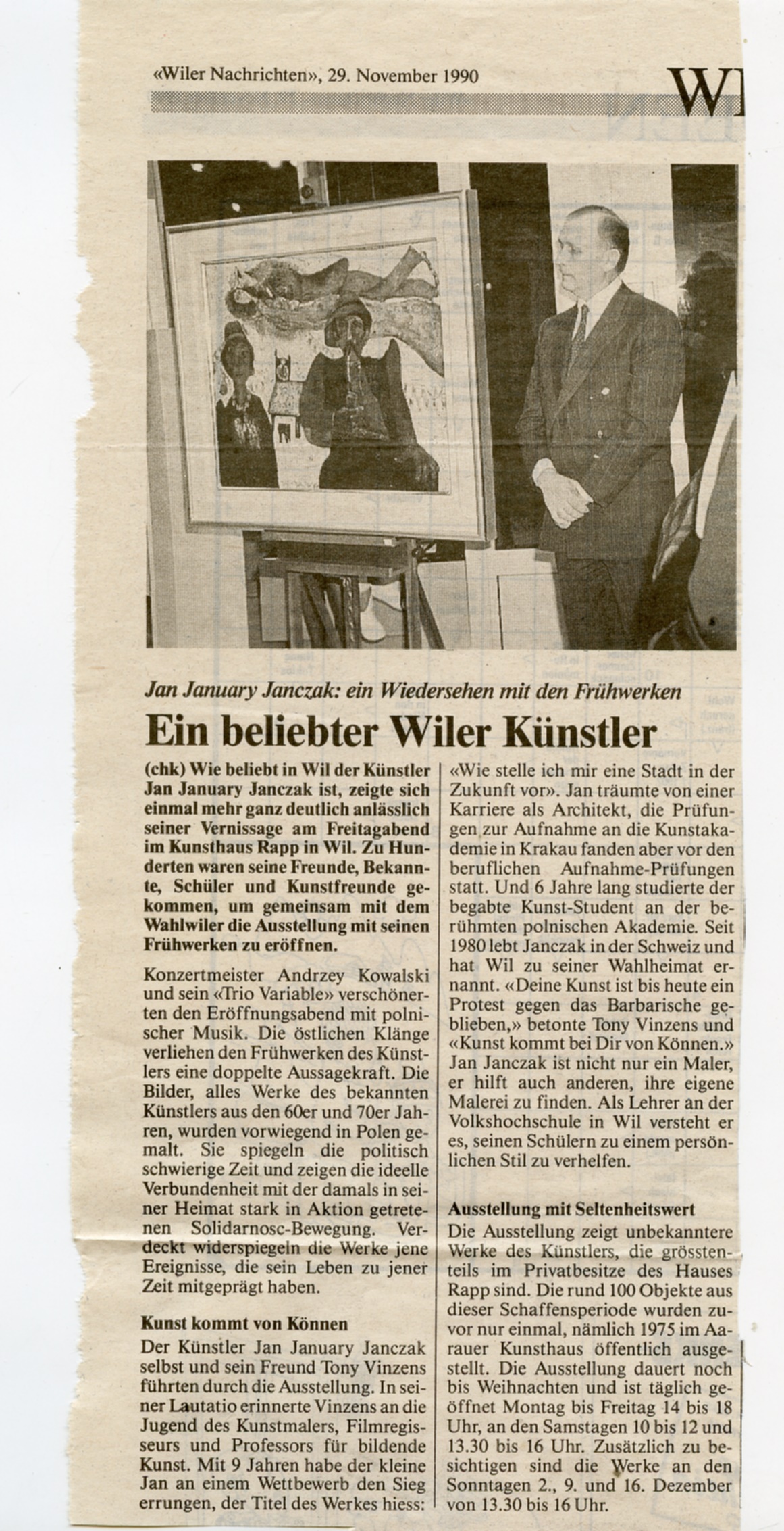 Seit 1980 lebt und arbeitet der 1938 in Polen geborene Künstler in der Schweiz. Seine Ausbildung in den Bereichen Malerei, Grafik und Film erhielt er an der Kunstakademie in Krakau. 1972 wurde er zum Professor für bildende Künste ernannt. Grosse Ausstellungen in der ganzen Welt machten bald seine Werke bekannt. Vor allem Oelbilder, aber auch eigenwillige, fantasievolle Hinterglasmalereien gehören neben Federzeichnungen zu seinen Haupttechniken. Obwohl selber nicht intensiv politisch aktiv, besass Janczak doch Beziehungen zur damals sich als politische Grösse etablierenden Solidarnosc-Bewegung, die es ratsam erschienen liessen, sich in der Schweiz niederzulassen. Seit 1994 ist Jan Janczak Wiler Bürger.