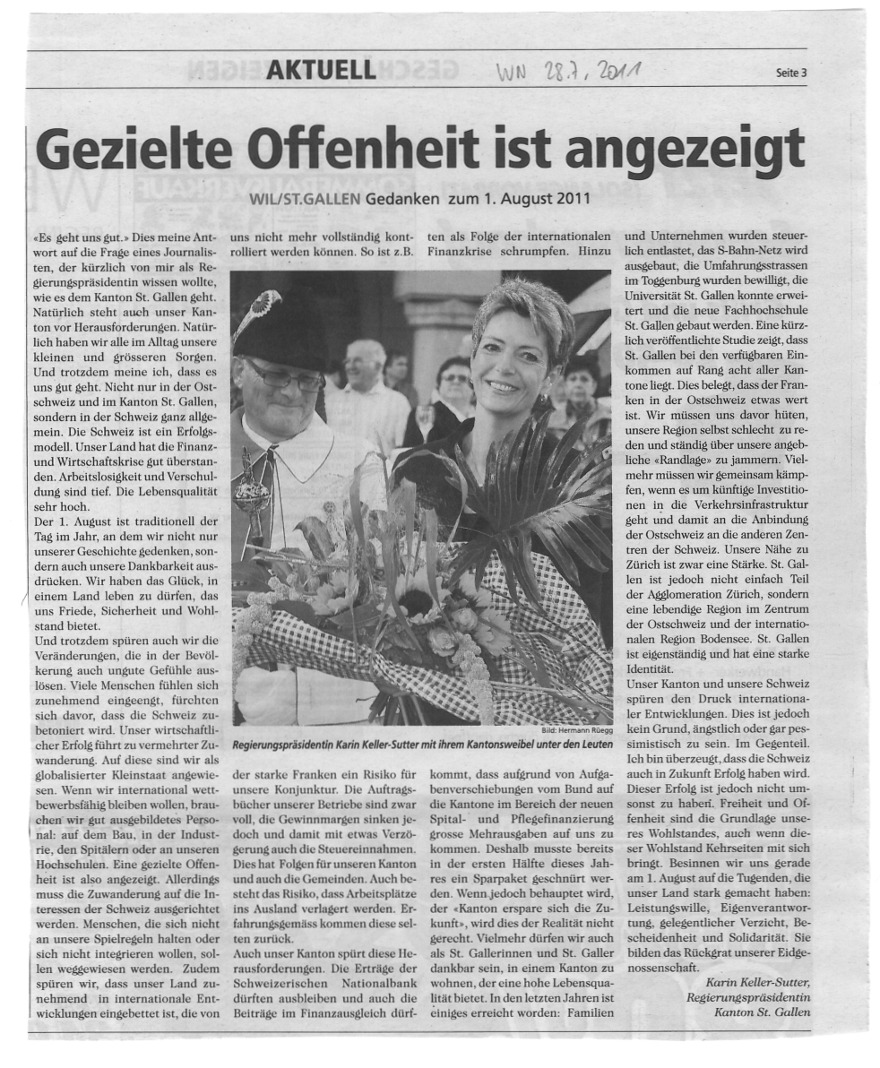 geb. 22.12.1963, aufgewachsen und wohnhaft in Wil, verheiratet mit Morten Keller Schulen in Wil und Neuchâtel Studium als Übersetzerin und Konferenzdolmetscherin in Zürich Studienaufenthalte in London und an der Universität Montreal (Politikwissenschaft) Nachdiplomstudium in Pädagogik am pädagogischen Institut der Universität Fribourg 1997 Gemeinderatspräsidentin 1992-2000 Gemeinderätin in Wil 1995-2000 Vorstandsmitglied Kantonal St.Gallischer Gewerbeverband 1997-2000 Präsidentin der FDP des Kantons St.Gallen 1996-2000 Kantonsrätin 2000-2012 Regierungsrätin und Vorsteherin des Sicherheits- und Justizdepartementes 2006/2007 Regierungspräsidentin 22. September 2010 Nicht als Bundesrätin gewählt 23. Oktober 2011 Wahl in den Ständerat 5. Dezember 2018 Wahl als Bundesrätin http://www.karin-keller-sutter.ch/… https://de.wikipedia.org/wiki/Karin_Keller-Sutter