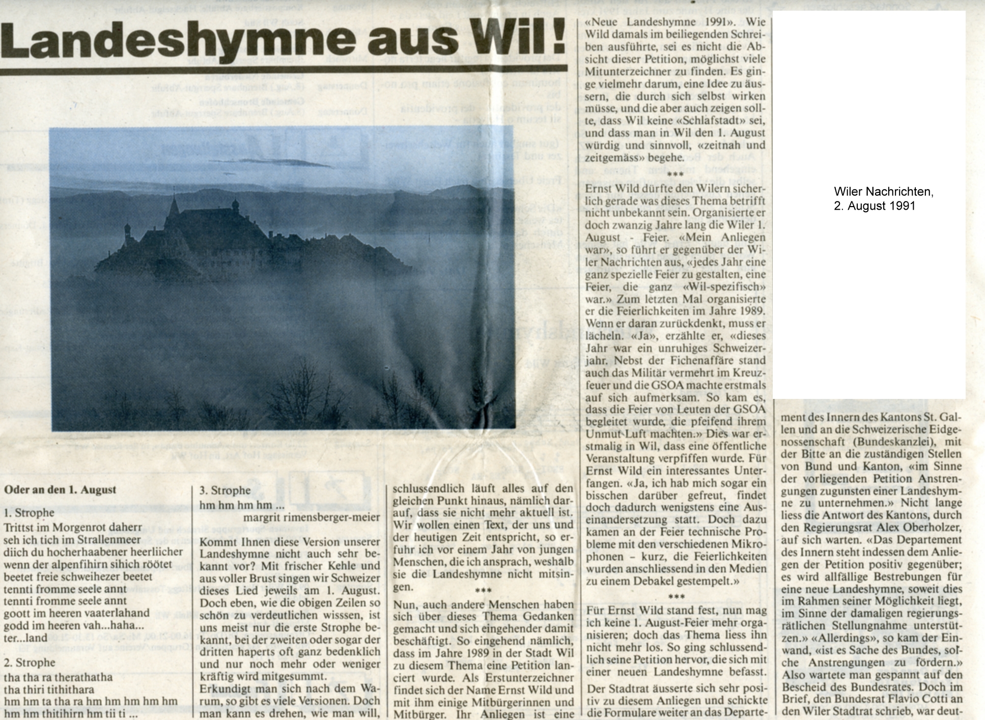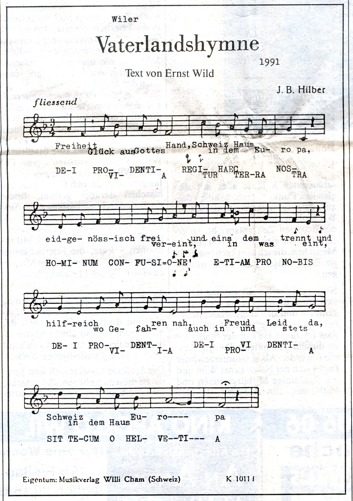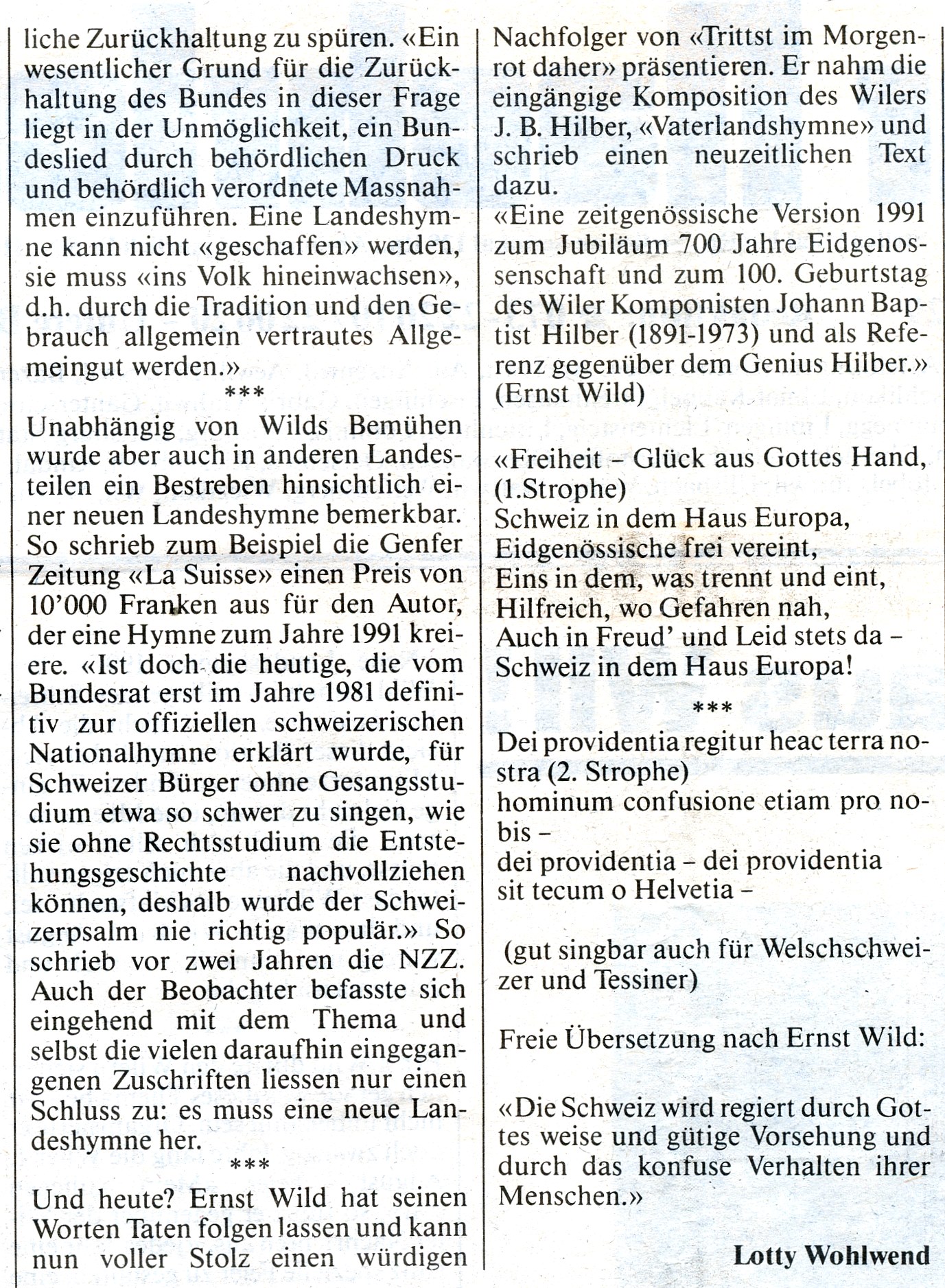 Es wurden schon mehrfach Versuche unternommen, die Schweizerische Nationalhymne zu erneuern. Dazu finden sich auch in Wil einige Belegstellen. Der grosse Musiker Johann Baptist Hilber aus Wil, ebenso Ernst Wild und auch Lukas Niederberger engagierten sich dafür.
