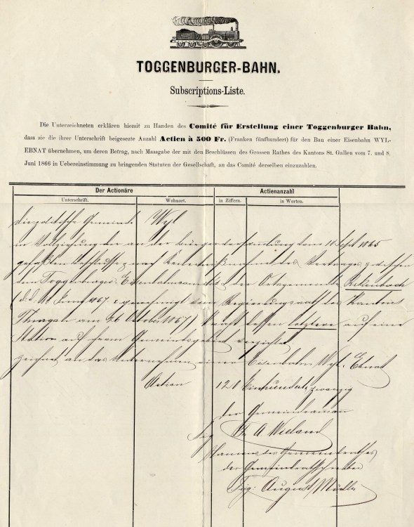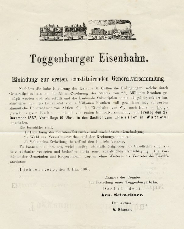 Chronik Im Jahr 1870 erfolgte die Betriebsaufnahme der Toggenburger Bahn auf der Strecke Wil - Ebnat. Die Gründung der Schweizerischen Südostbahn erfolgte 1889 durch die Fusion der Wädenswil-Einsiedeln-Bahn mit der Zürichsee- erfolgte Gotthardbahngesellschaft. 1904 wurde die Bodensee-Toggenburg-Bahn gegründet. Die Eröffnung der Strecke Ebnat-Kappel - Nesslau-Neu Sankt Johann erfolgte 1912. Im Jahr 1931 wurde der elektrische Betrieb zwischen St.Gallen - Wattwil - Nesslau-Neu Sankt Johann eingeführt.