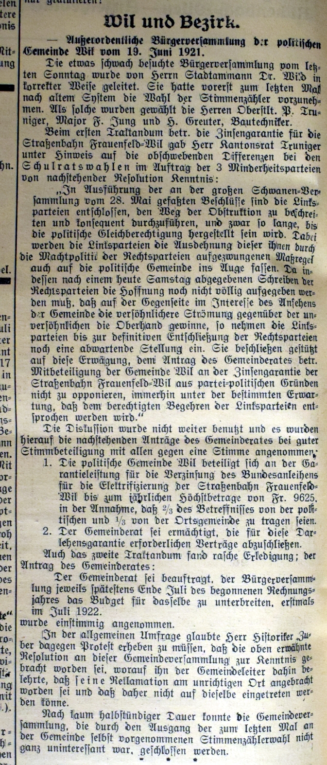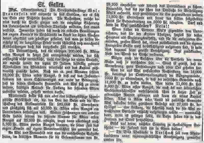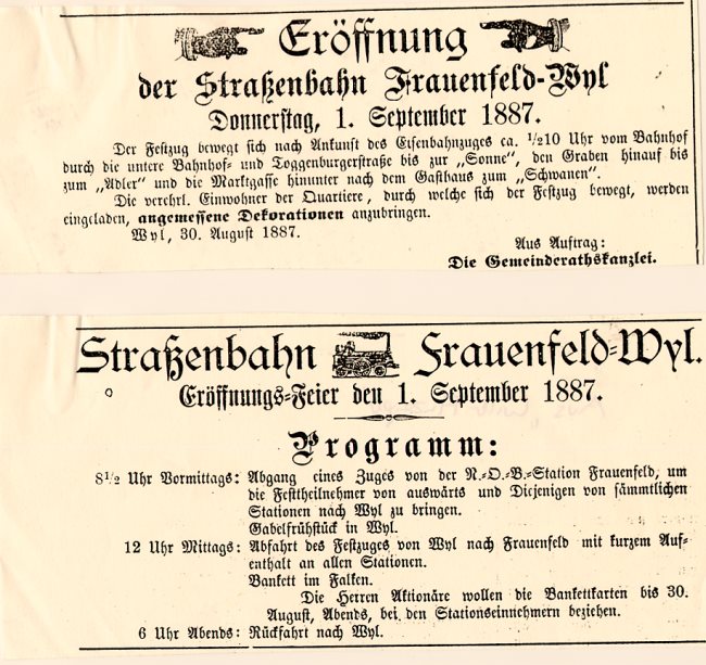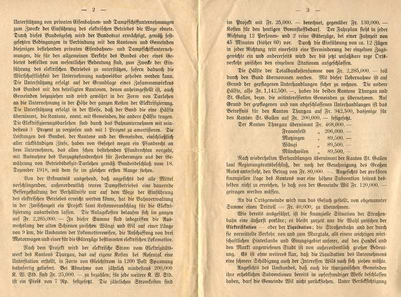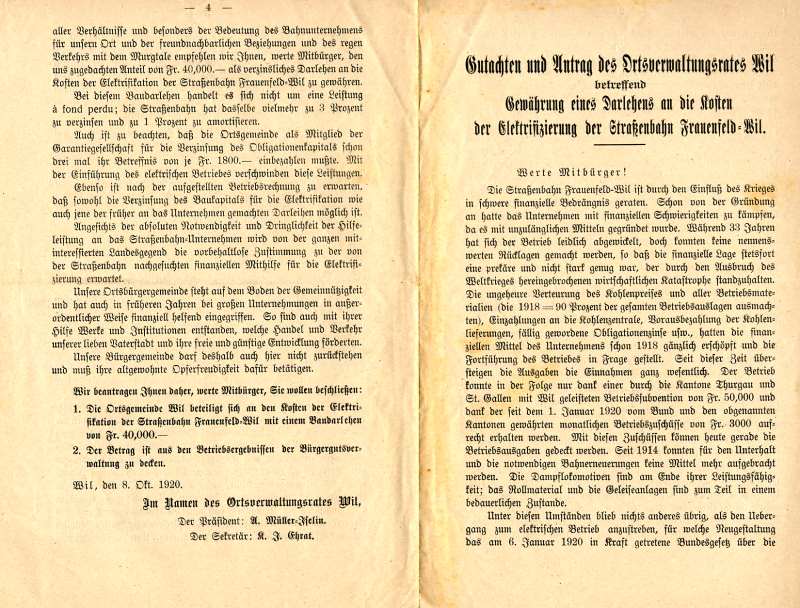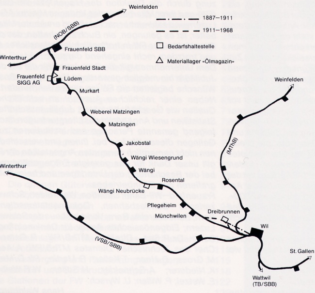 (Mathis, Hans Peter; 100 Jahre Frauenfeld-Wil-Bahn, in: Das Wiler Jahrbuch 1988, Wil) Von 1919 bis 1920 erfolgte die Umstellung von Dampfbetrieb auf elektrischen Strom. Die Arbeiten sind im Fotobuch "EW-Bahn Elektrifizierung" detailliert fotografisch geschildert.Seit neuestem (März 2014) ist im Internet der Transport eines Schienentraktors Tm I Nr. 477 zu finden unter:igschieneschweiz.startbilder.de/ Hier ein link zur Frauenfels-Wil-Bahn im Jahr 1964: https://memobase.ch/de/object/srf-029-99ce4a6d-2ac5-4ecd-b3ec-766587683b35_01?term=wil%20sg&filter%5Baccess%5D%5B0%5D=Online&position=4