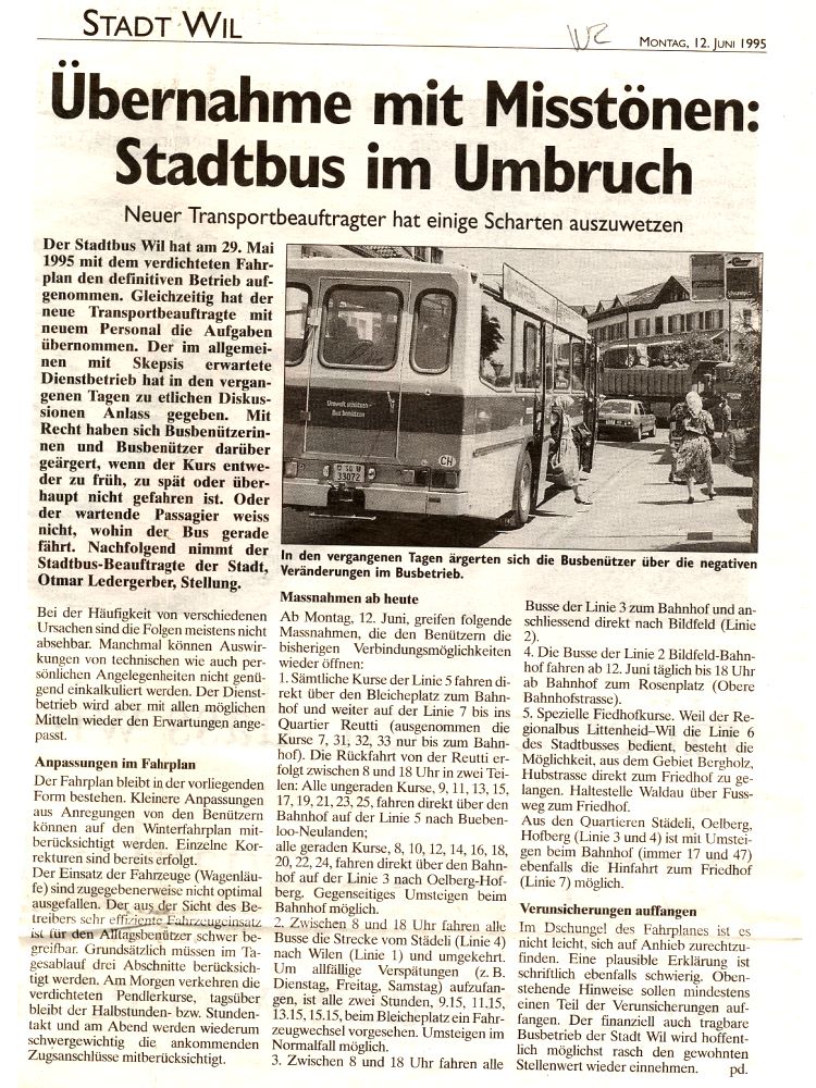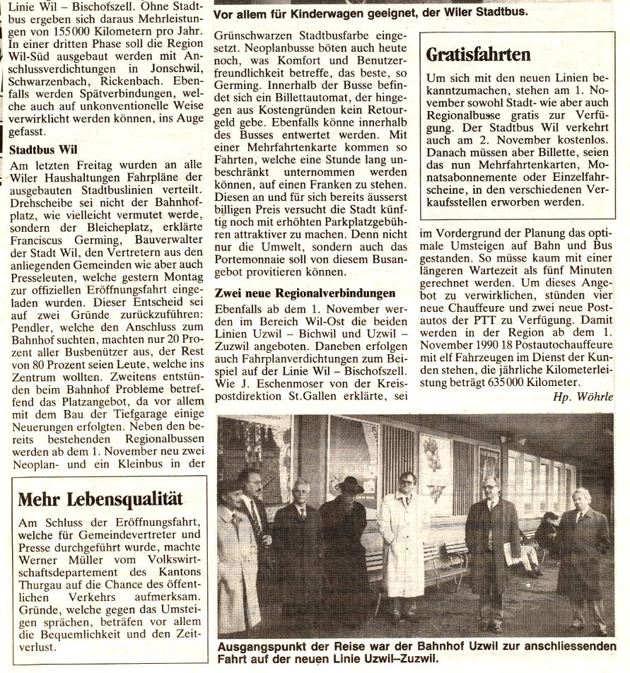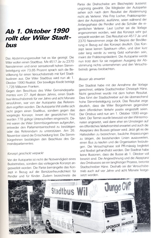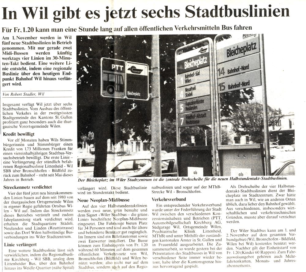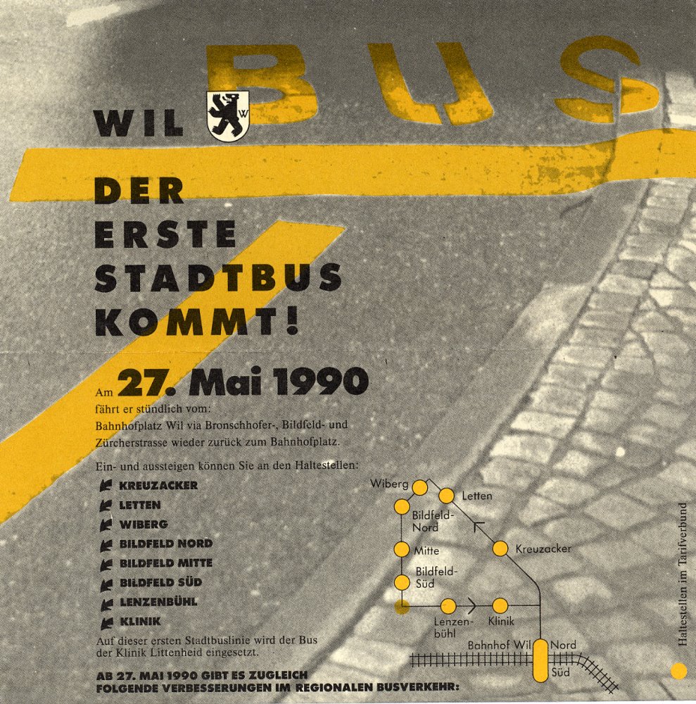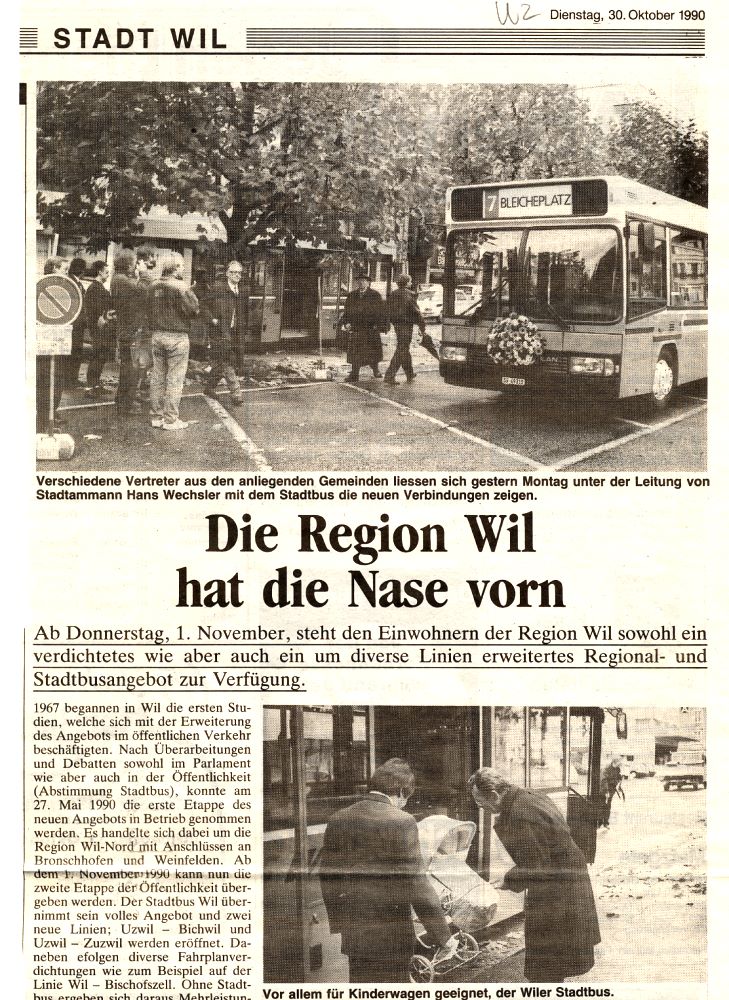 Bereits 1967 begannen in Wil die ersten Studien, welche sich mit der Erweiterung des Angebots im öffentlichen Verkehr beschäftigten. Nach Ueberarbeitungen und Debatten sowohl im Parlament wie aber auch in der Oeffentlichkeit (Abstimmung Stadtbus) konnte am 27. Mai 1990 die erste Etappe des neuen Angebots in Betrieb genommen werden.