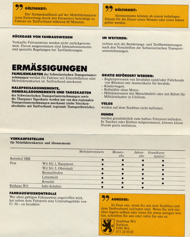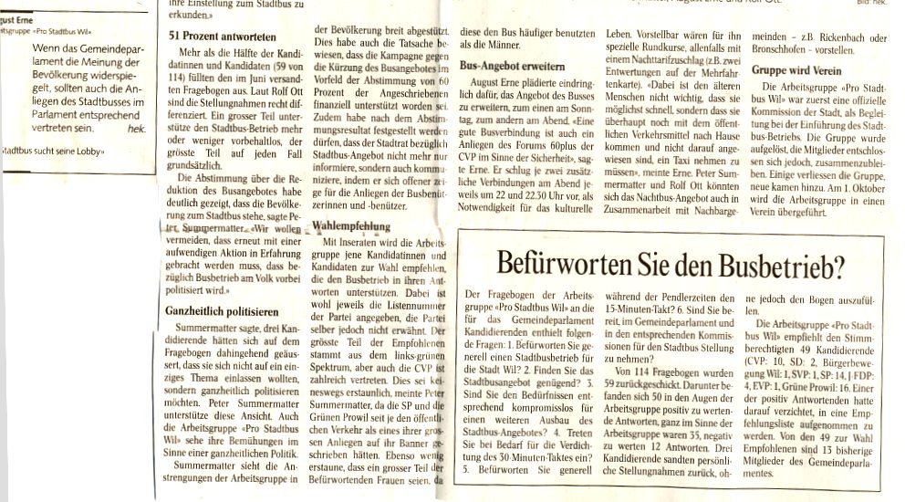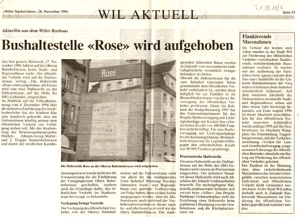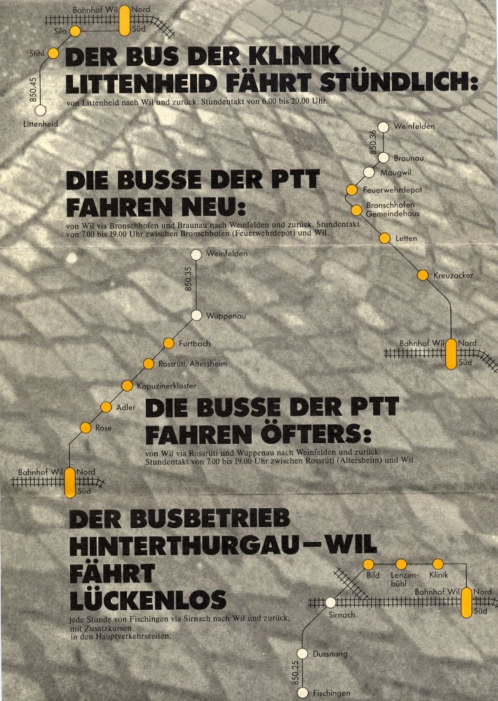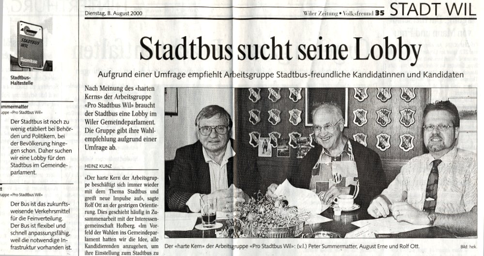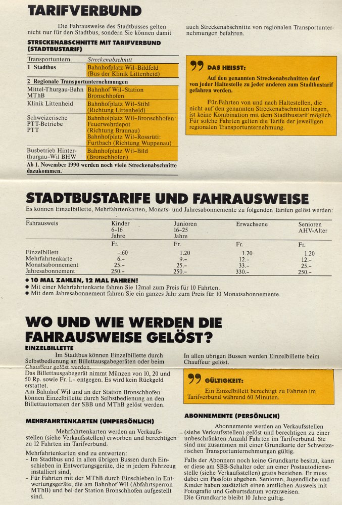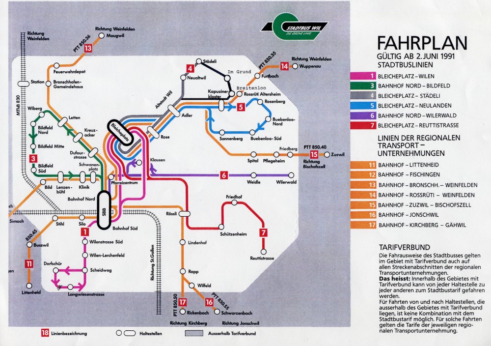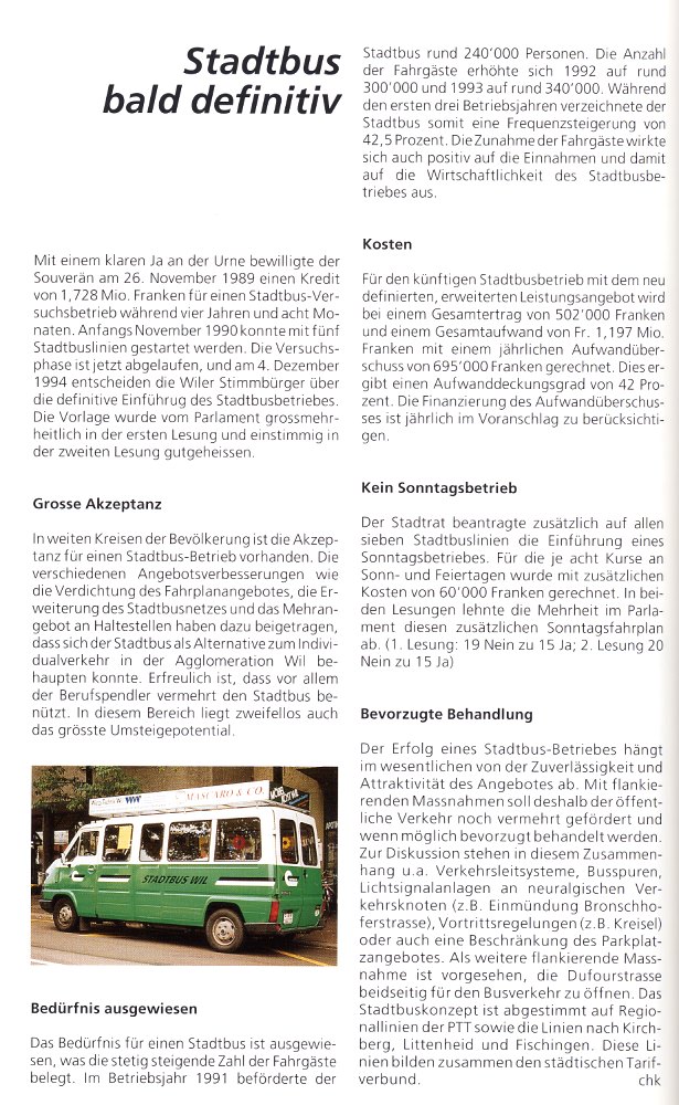 Bereits 1967 begannen in Wil die ersten Studien, welche sich mit der Erweiterung des Angebots im öffentlichen Verkehr beschäftigten. Nach Ueberarbeitungen und Debatten sowohl im Parlament wie aber auch in der Oeffentlichkeit (Abstimmung Stadtbus) konnte am 27. Mai 1990 die erste Etappe des neuen Angebots in Betrieb genommen werden.