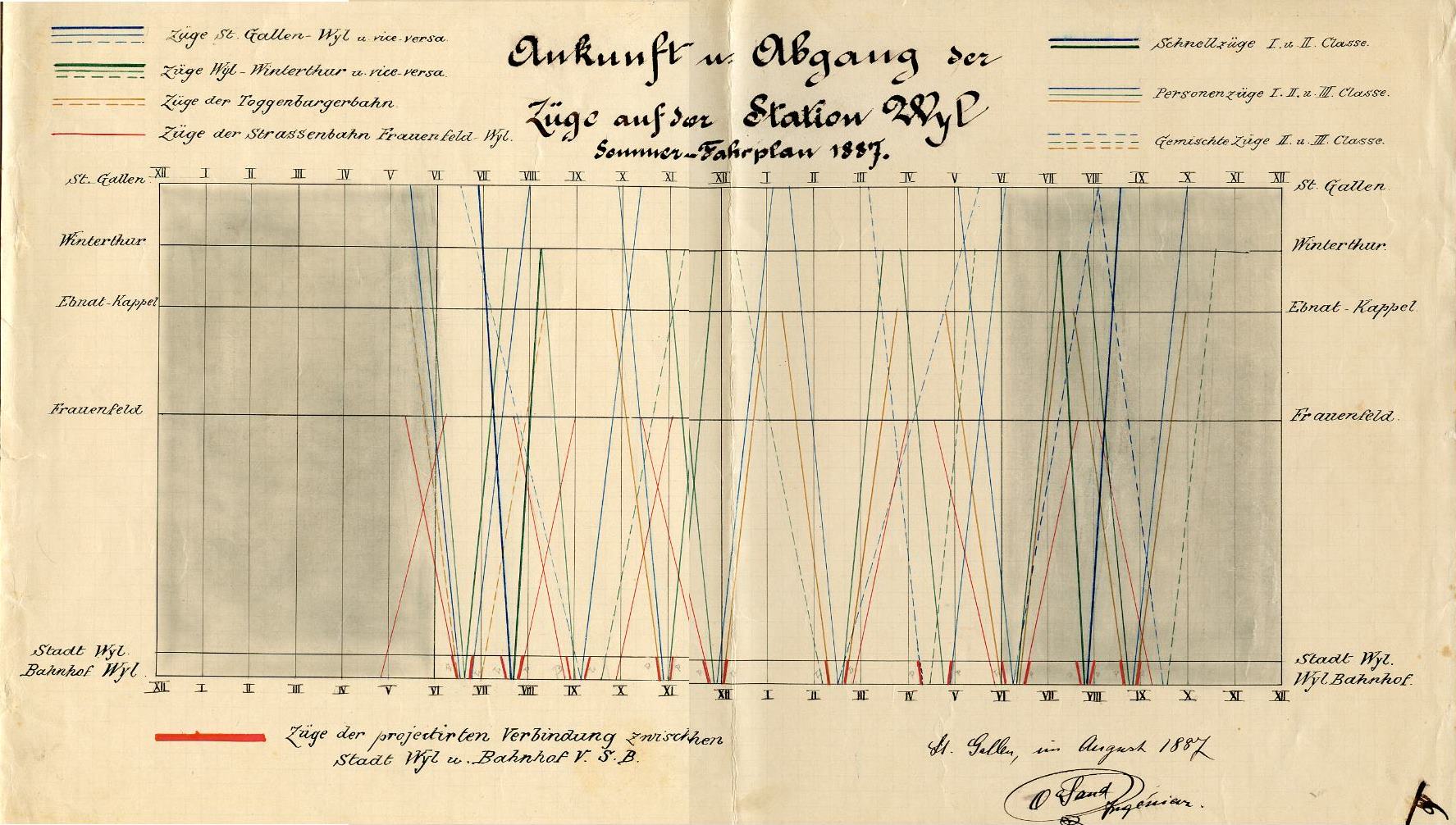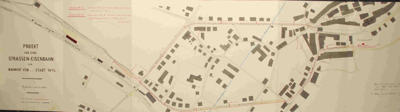 Am 1. September 1887 wurde die FW eröffnet. Am 14.Oktober 1887 lieferte Sand seinen „Bericht zum Project für eine Strassen-Eisenbahn vom Bahnhof der VSB bis in die Stadt Wyl" ab. Untersucht wurden zwei Streckenführungen, beide im Anschluss an die FW und die Betriebsart: