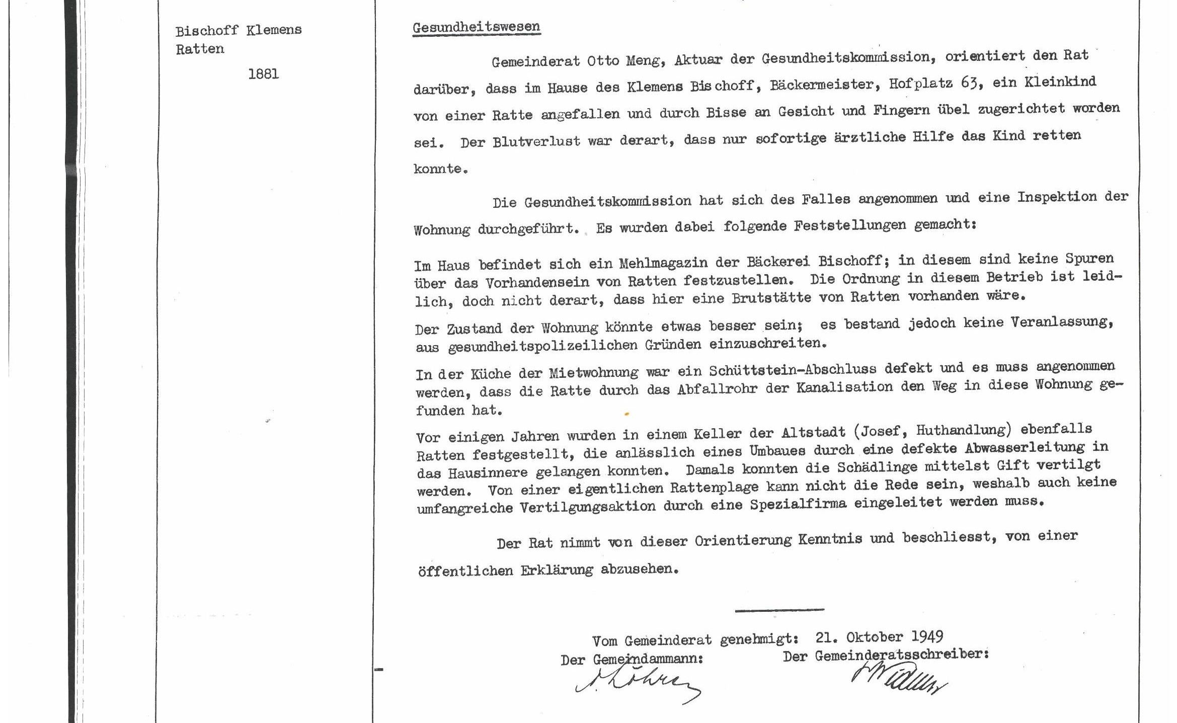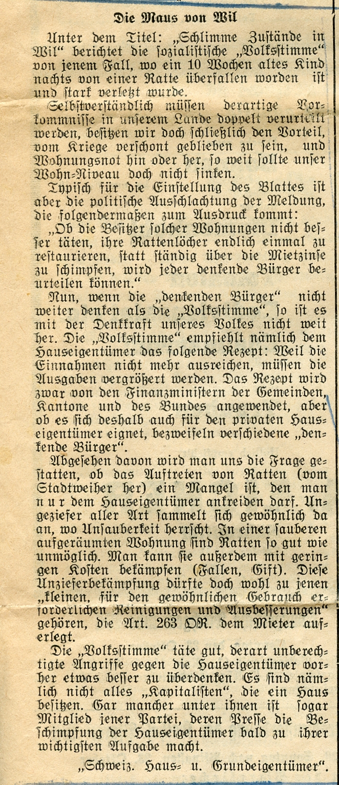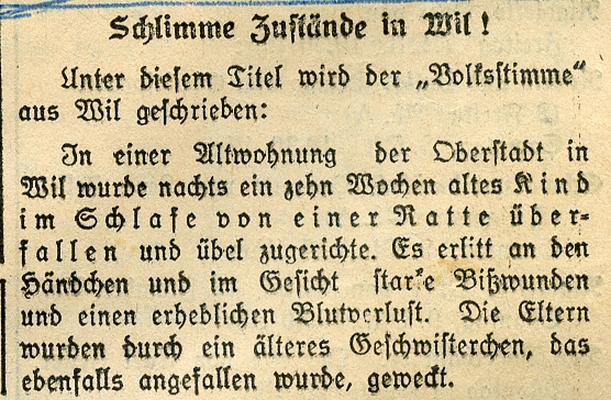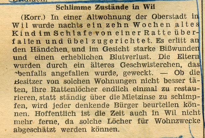 1949 ging eine Meldung durch die Presse, indem eine Ratte ein schlafendes Kind in der Wiler Altstadt angefallen und verletzt hatte.
