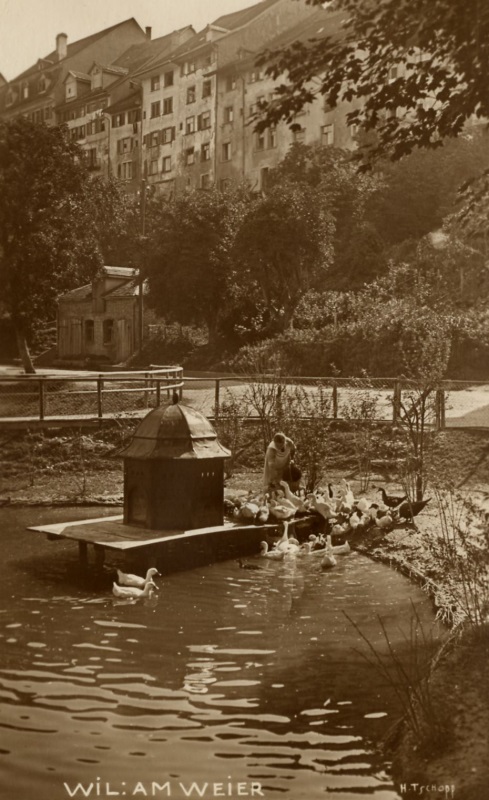 Erstmals wird 1915 die "Gründung einer Schwanenkolonie im Stadtweier ins Auge gefasst" (Vorstand 27.5.1915). Architekt P. Truniger hat in der Folge eine Vorlage ausgearbeitet, "in welcher die Anlage eines Schwanenteiches durch Einbau eines Dammes im unteren Teil des Weiers vorgesehen ist." Die Dammanlage könnte billig erstellt werden mit der Verwendung des Schutt- und Aushubmaterials vom Abbruch des Steinhauses zum Neubau der Kantonalbank. Die Vorlage wird dem Gemeinderat eingereicht. Die Kosten der Anlage sollte die Stadt übernehmen, während der VVW für den Unterhalt "bezüglich Geflügel-Einsatz und die Pflege desselben aufkommen würde" (Vorstand 28.6.1916). Die Ausführung der Anlage wurde beschlossen an der Hauptversammlung vom 17.8.1916. Im Juli 1918 sind die Dammanlagen zum Schwanenteich fertig gestellt. Für die Einfriedung des Teiches liegen Muster von der Firma Knecht-Grögli & Cie, Wil, vor. Kassier Gottfried Barell verspricht die Stiftung eines Schwans. Am 14. August 1918 ist der Schwanenteich "durch ein Paar muntere Schwäne, geliefert vom ornithologischen Verein St.Gallen, besetzt worden zur Freude der Jugend und der Erwachsenen" (Vorstand 3.9.1918). Die politische Gemeinde beteiligt sich an den Gesamtkosten von Fr. 4'362.- (Voranschlag Fr. 3'500.-) mit 1'000 Franken und verzichtet auf Rechnungstellung für das Baubüro. Die Ortsgemeinde leistet Fr. 500.-. An freiwilligen Beiträgen sind Fr. 438.- eingegangen. Für die Begleichung der Restschuld von rund Fr. 2'400.- wird vom Gemeinderat ein Darlehen gewährt mit jährlichen Amortisationen "bezw. Verrechnung an Subventionen."Die Kommission beschliesst, "eine Anzahl buntgefiederter Enten" zu erwerben und im Teich eine Art Insel zu schaffen, "um das Laichgeschäft (sic!) der Schwäne zu fördern" (Vorstand 21.5.1919). Amüsant zu vernehmen, wie der Aktuar August Raschle, seines Zeichens Förster der Ortsbürgergemeinde Wil, sich die Fortpflanzung der Schwäne vorstellt. Nach der Anschaffung zweier schwarzer Schwäne stellt man fest, dass beide weiblich sind. "Es soll der Umtausch eines Stückes versucht werden" (Vorstand 6.9.1940).Im Herbst 1933 will man Vorkehren treffen, um die Eisbildung im Weier zu verhindern. Der VVW gelangt an den Gemeinderat mit dem Gesuch, mittels gelochten Röhren erwärmtes Wasser von der Niederdruck- oder Hochdruckleitung in den Weier zu leiten, um "im Interesse der Geflügelhaltung die Eisbildung zu verhindern" (Vorstand 27.10.1933). Für den Gemeinderat kommt eine solche Lösung nicht in Frage wegen des zu grossen Wasserverbrauchs. Da im Winter Wasserknappheit herrscht, wäre dies nicht zu verantworten (Vorstand 28.12.1933). So bleibt nichts anderes übrig, als das Geflügel in der Scheune der oberen Mühle zu überwintern und den Bestand durch Verkauf von Tieren über die kalte Zeit zu reduzieren.Aber auch andere Einflüsse gefährdeten den Bestand des Geflügels. Im November 1920 wird vom "unliebsamen Abgang der Schwäne und Zierenten" berichtet. Der VVW stellt eine Schadenforderung an Küfer Rombach, der "in sehr fahrlässiger Weise Abgänge von kranken und toten Tieren in den Weier geworfen haben soll" (Vorstand 12.11.1920). Im Frühjahr 1933 sind sämtliche jungen Schwäne getötet worden. Als Übeltäter vermutet man ein gefrässiges Raubtier. Im Sommer 1940 werden erneut Ratten am Schwanenteich festgestellt. Bereits vor der Kriegszeit wird die Futterbeschaffung schwierig. Das Quartieramt wird ersucht, Brotabfälle von der Verpflegung der Truppen an Glasermeister Albert Schmid "zum Schützenhaus" zur Fütterung des Geflügels abzugeben. Auch sämtliche Gasthofbesitzer werden dazu aufgefordert. Selbst die Schuljugend soll von der Lehrerschaft dazu ermuntert werden (Vorstand 7.10.1938). Während der Kriegszeit wird eine erhebliche Reduzierung der Vögel erforderlich. Gänse werden abgetreten, Enten veräussert. Zwei Schwäne und zwei Höckergänse werden an Pächter A. Dobler nach Dreibrunnen verkauft, mit Preisreduktion "mit Rücksicht auf den Umstand, dass die beiden Schwäne während des Winters umgestanden sind" (Vorstand 26.3.1941). Der Verantwortliche des VVW für das Geflügel im Weier, Vorstandsmitglied Direktor Robert Leutenegger, hat es mit der Wirtin zum Schützenhaus verstanden, "die sonst nicht immer gerade rosigen Sitzungen mit einem Götterfrass einzuleiten" berichtet am 9.1.1930 Aktuar Vinzenz Reutty, seines Zeichens Stadtförster. Dieser erste Entenschmaus ist der Beginn des traditionellen Martinimahls des VVW.