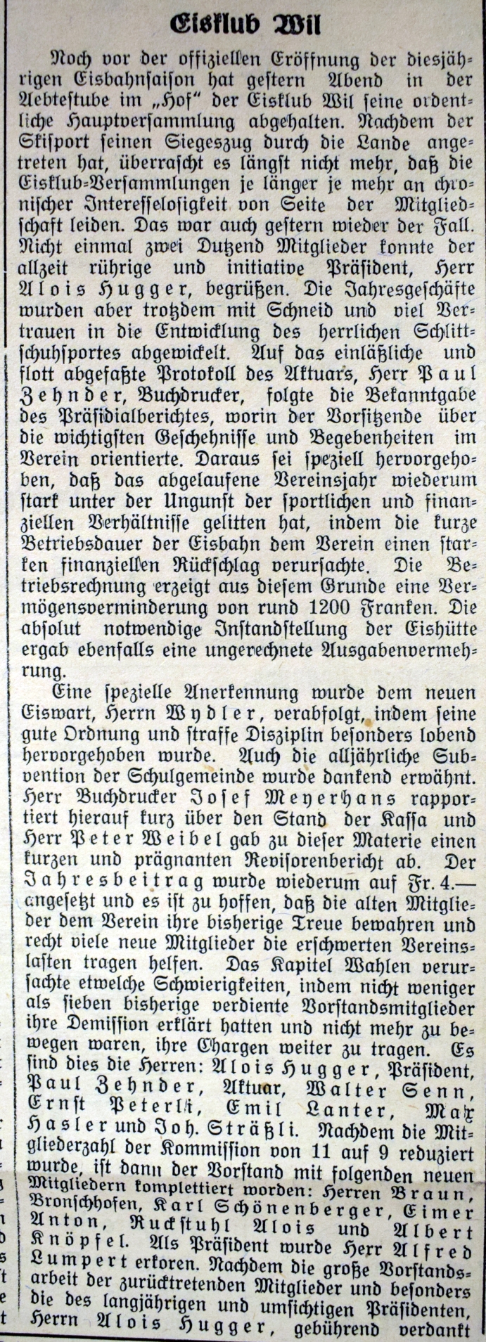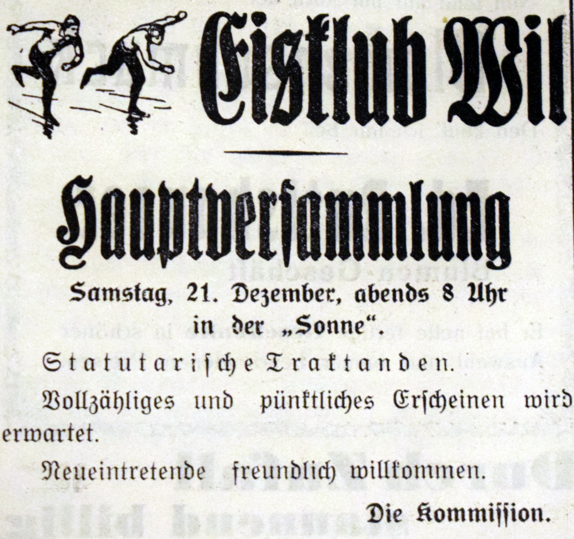Gemäss diversen Artikeln zur Geschichte des Eishockeyclubs Wil soll nun 1929 ein erster Versuch, auch eine Hockey-Abteilung einzurichten, gescheitert sein. In den Wiler Zeitungen findet sich zwar das Einladungsinserat zur Hauptversammlung, aber keine Berichterstattung darüber. Das Gleiche gilt für 1935, wo ein weiterer Versuch unternommen worden sei. Im Bericht über die HV ist keine Stelle zu "Eishockey" zu finden. Gemäss der Legende soll erst 1943 der "Eishockey-Club Wil" gegründet worden sein. Dies ist aber nicht korrekt, da in den Berichten der Hauptversammlungen von 1943 und 1942 über einen bereits bestehenden Eishockeyclub gesprochen wird.