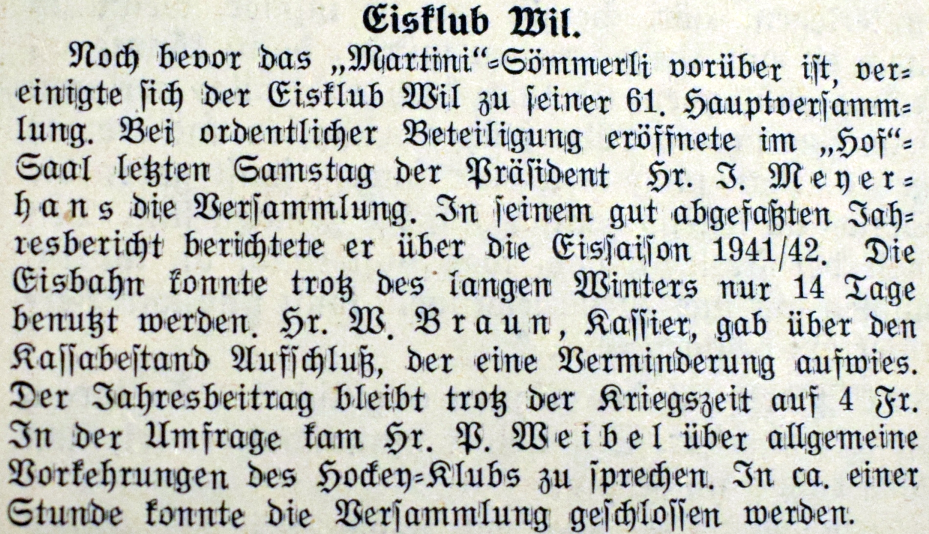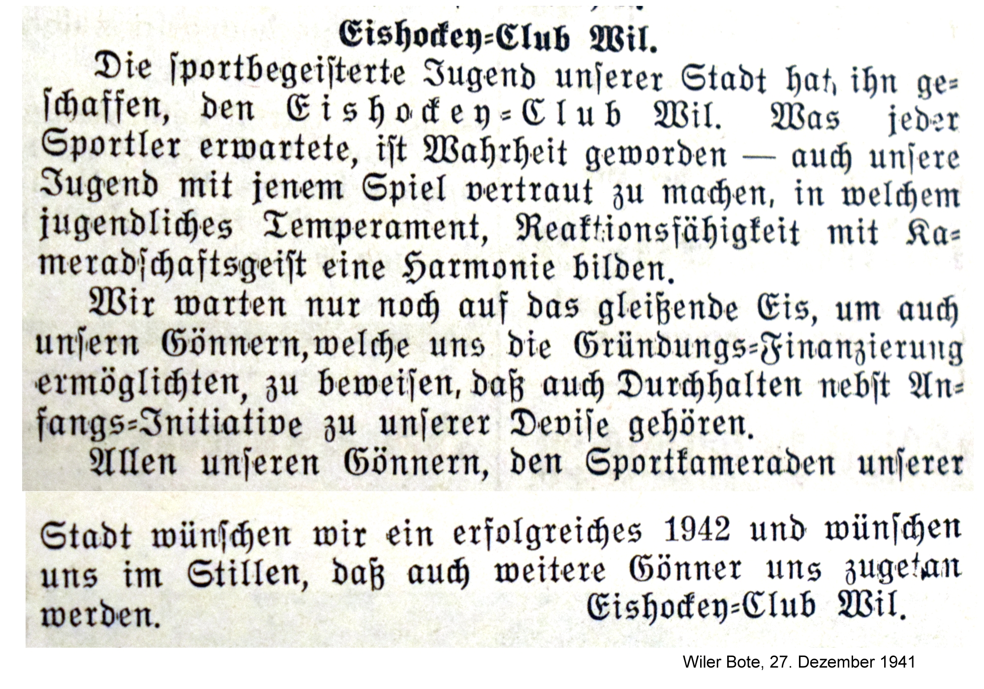 Nun, bereits im Artikel im Wiler Boten vom Samstag, 27. Dezember 1941 wird über die "endlich erfolgte Gründung" des Eishockeyclubs Wil berichtet. Allerdings ist kein Inserat oder eine Einladung zur Gründungsversammlung zu finden, die ein genaues "Gründungsdatum" zeigt. Aber die Gründung Ende 1941 ist doch gesichert. (siehe dazu die letzte Beilage !).