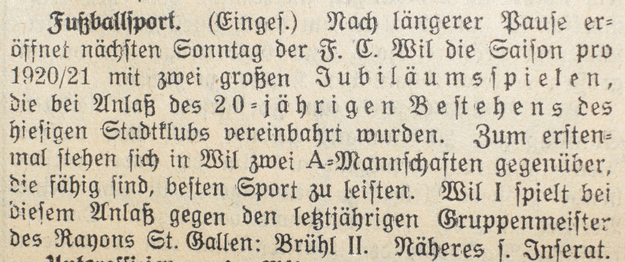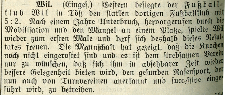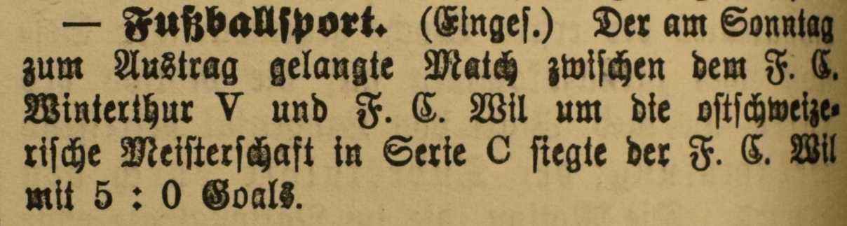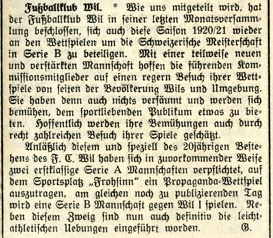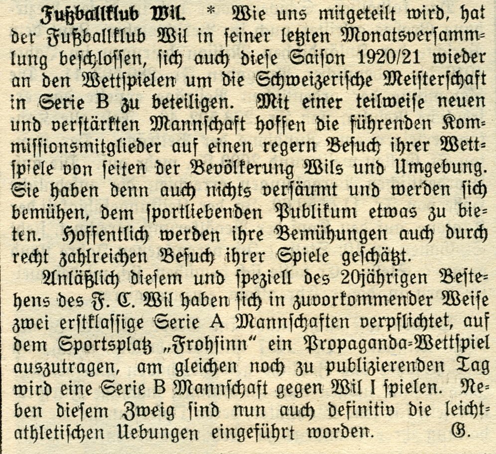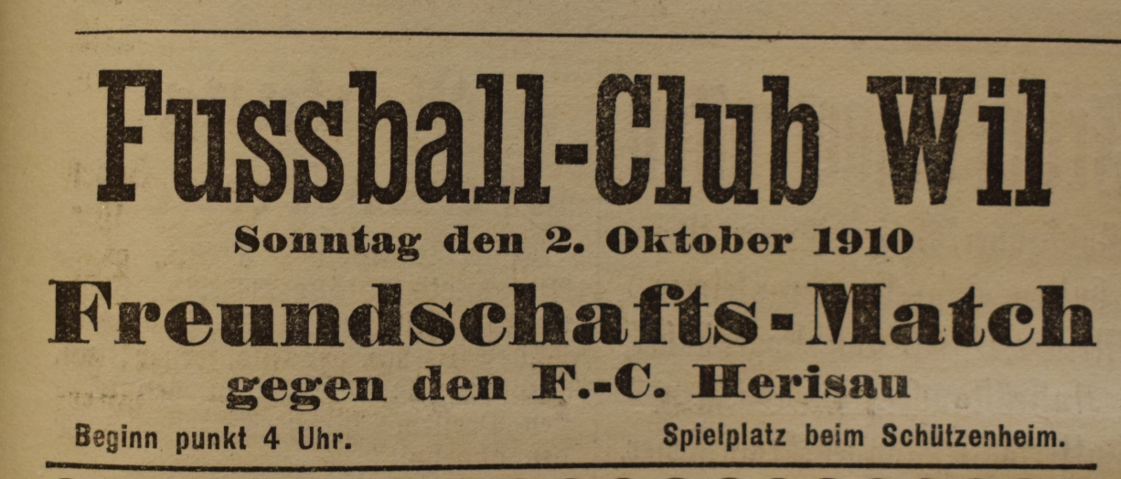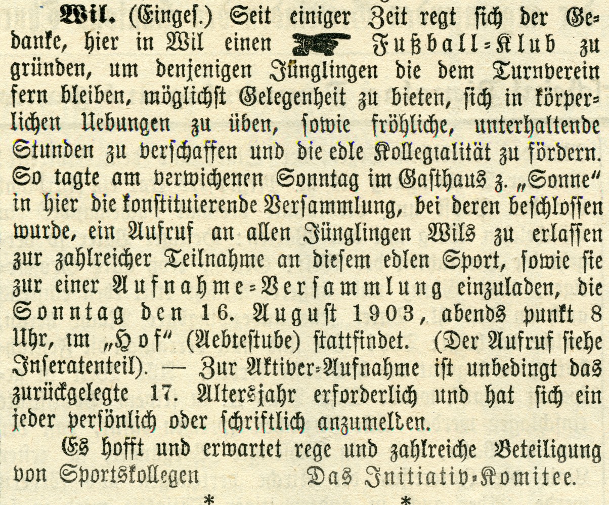 1900: Gründung des Vereins als FC Stella (noch nicht belegt !) 1902: Namensänderung in FC Fors (noch nicht belegt !) 1903: Gründung des FC Wil 1914–1918: Kein bzw. nur vereinzelt Spielbetrieb 1920: Wiederaufnahme Wettspielbetrieb 1935: Projekt Tribüne 1937: Gruppenmeister Junioren